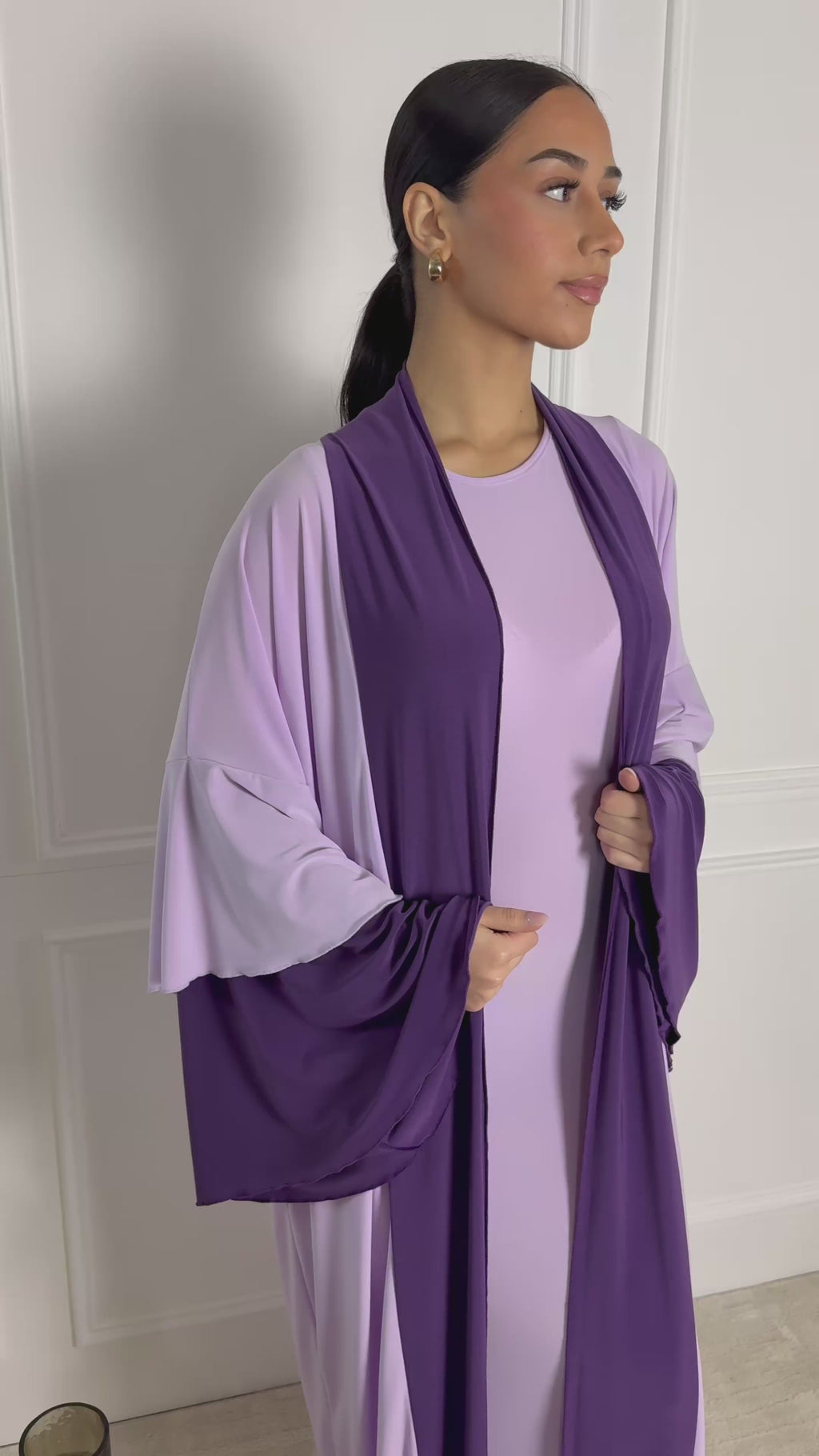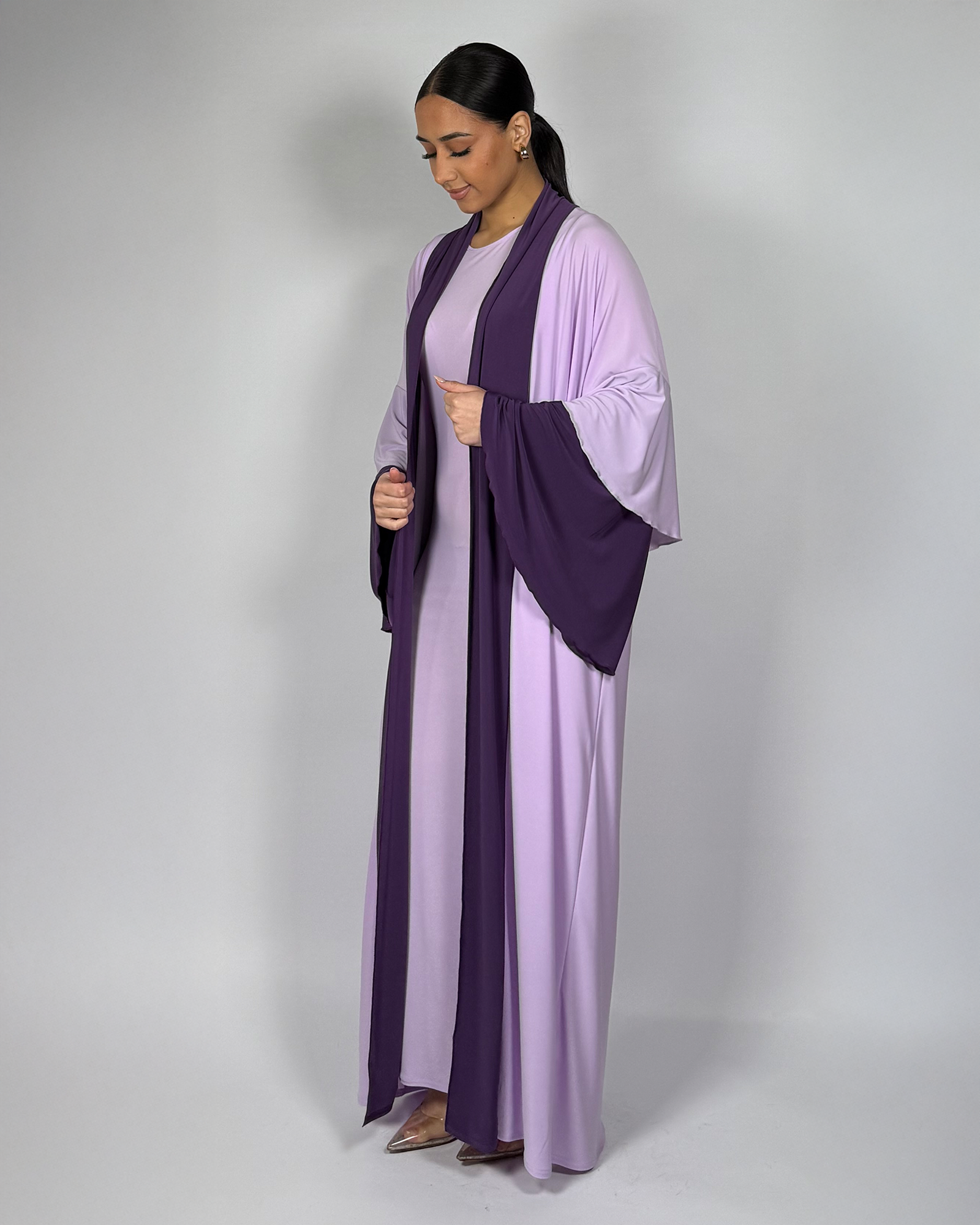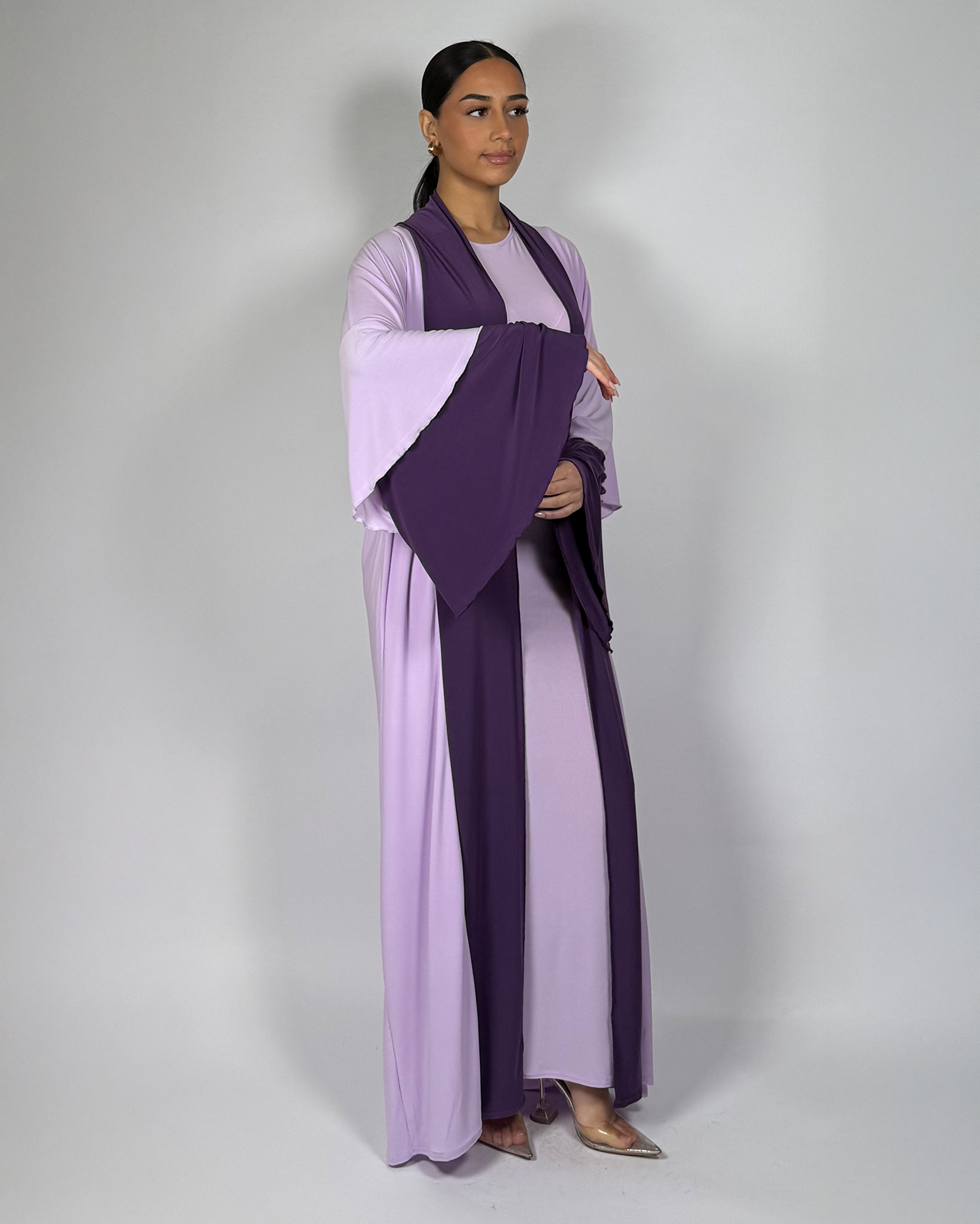 This captivating lilac and purple abaya with a matching slip dress is a show-stopping combination of elegance and modern style. The abaya features a flowing lilac base enhanced by bold purple accents along the front panel and dramatic flared sleeves, creating a striking contrast and a refined silhouette. The matching slip dress offers a sleek and modest fit, ensuring effortless sophistication. Crafted from soft, lightweight fabric, this set is perfect for formal occasions, festive gatherings, or simply adding a touch of luxury to your everyday wardrobe.