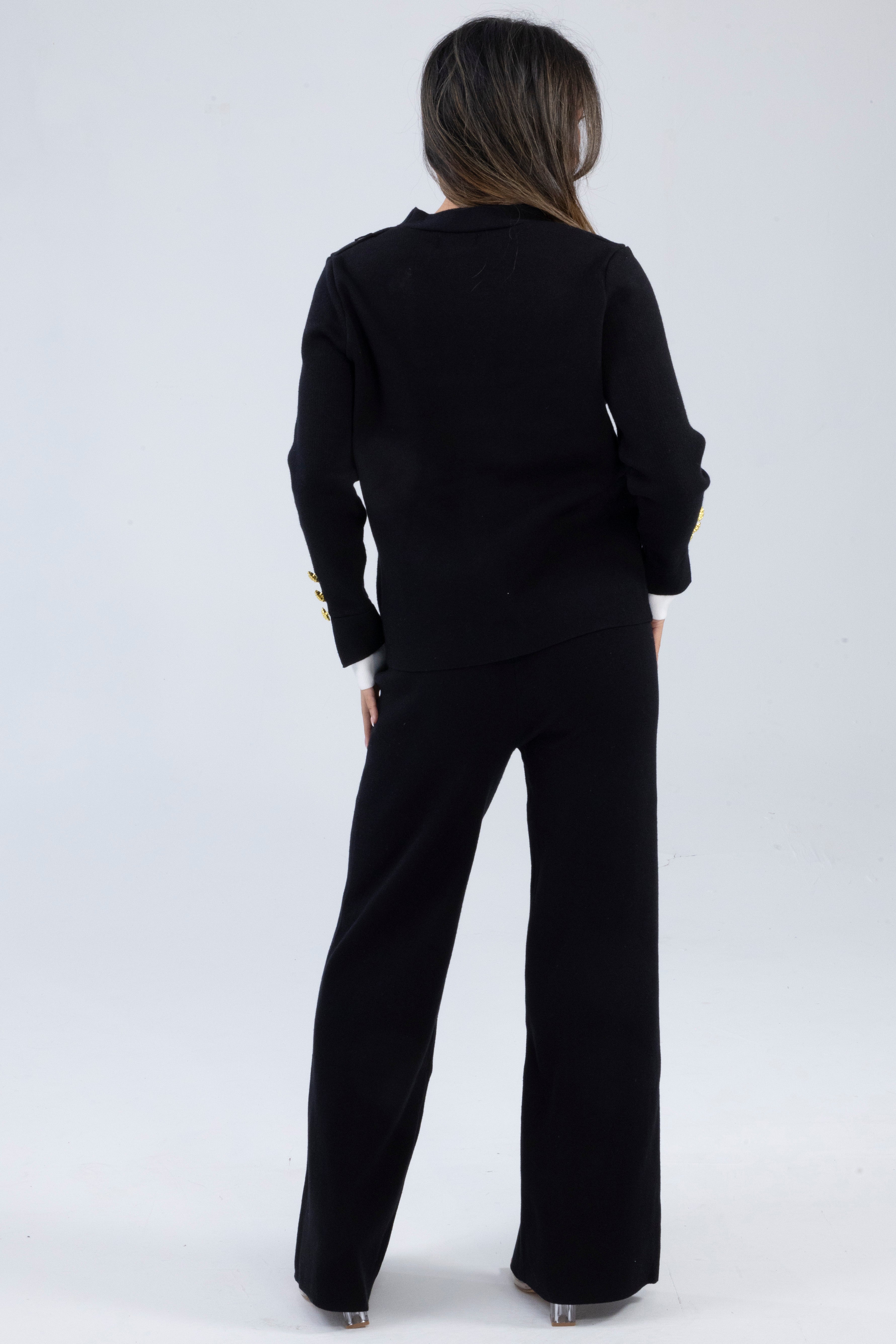 Chic, structured, and timeless — this black co-ord set is your go-to for an elevated look with minimal effort. Featuring a tailored V-neck top with statement gold buttons and front patch pockets, this piece blends classic design with luxe details. Crisp white contrast cuffs and sleeve button accents add a refined, high-end finish.