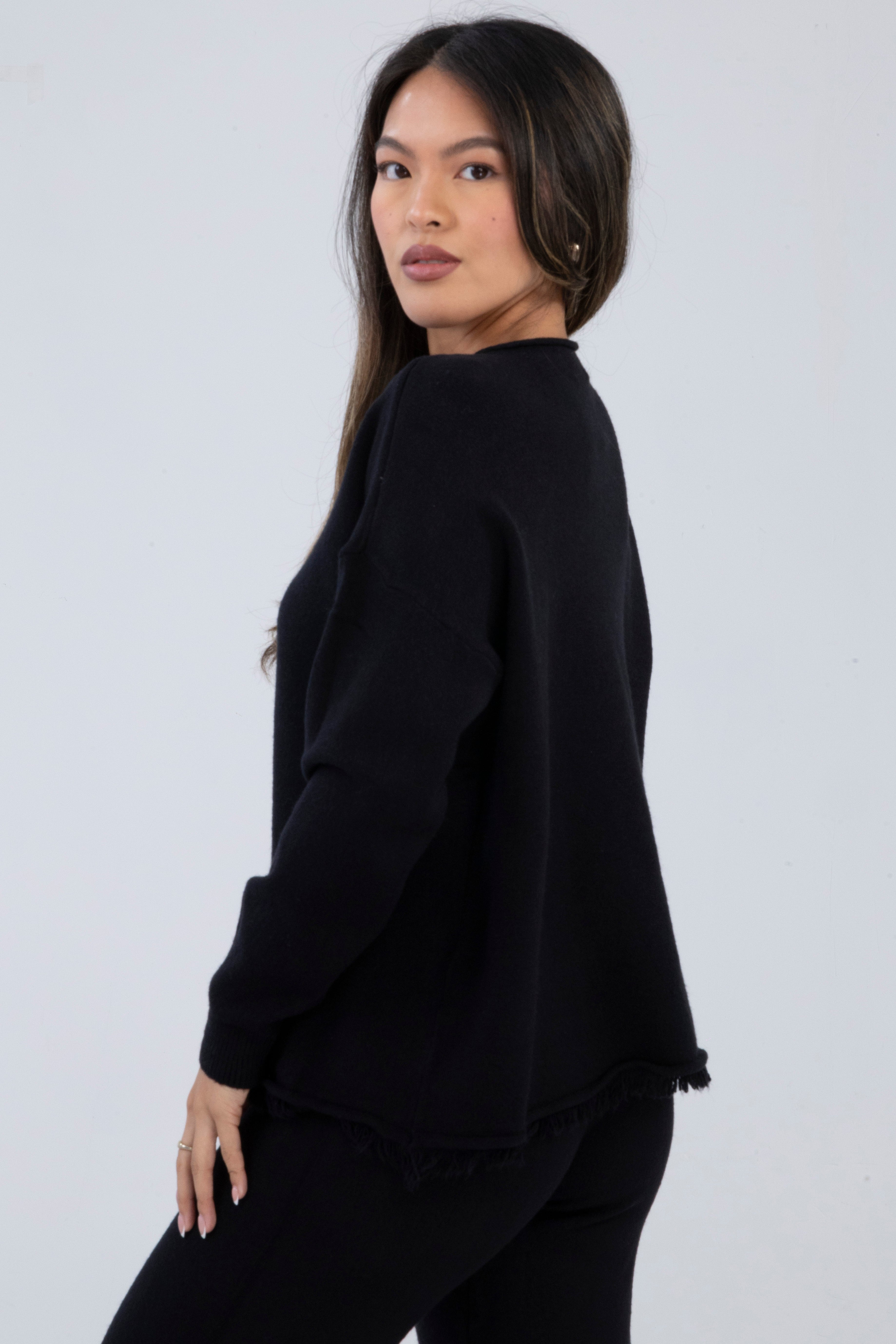 Embrace effortless comfort and everyday polish with this black knit co-ord set. Crafted from a soft, cosy knit, the set includes a relaxed-fit top with a subtle boat neckline and frayed detailing along the hem for a casual touch. The wide-leg trousers mirror the frayed finish, giving the set a coordinated, easygoing look perfect for cooler days.