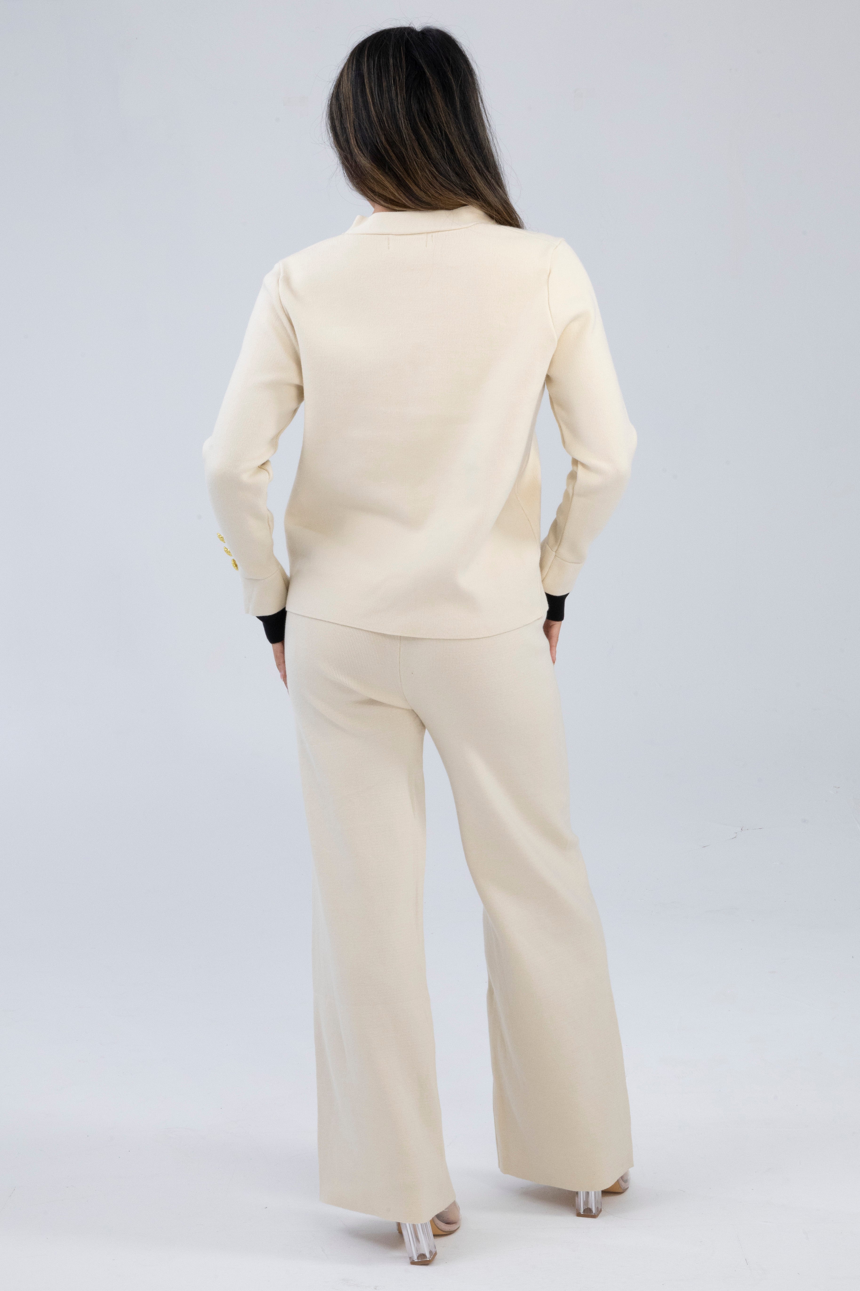 Paired with high-waisted, wide-leg trousers in a matching cream knit, this set is both flattering and refined. Ideal for occasions where comfort meets class — style it with heels and minimal jewellery for a chic, put-together ensemble.
