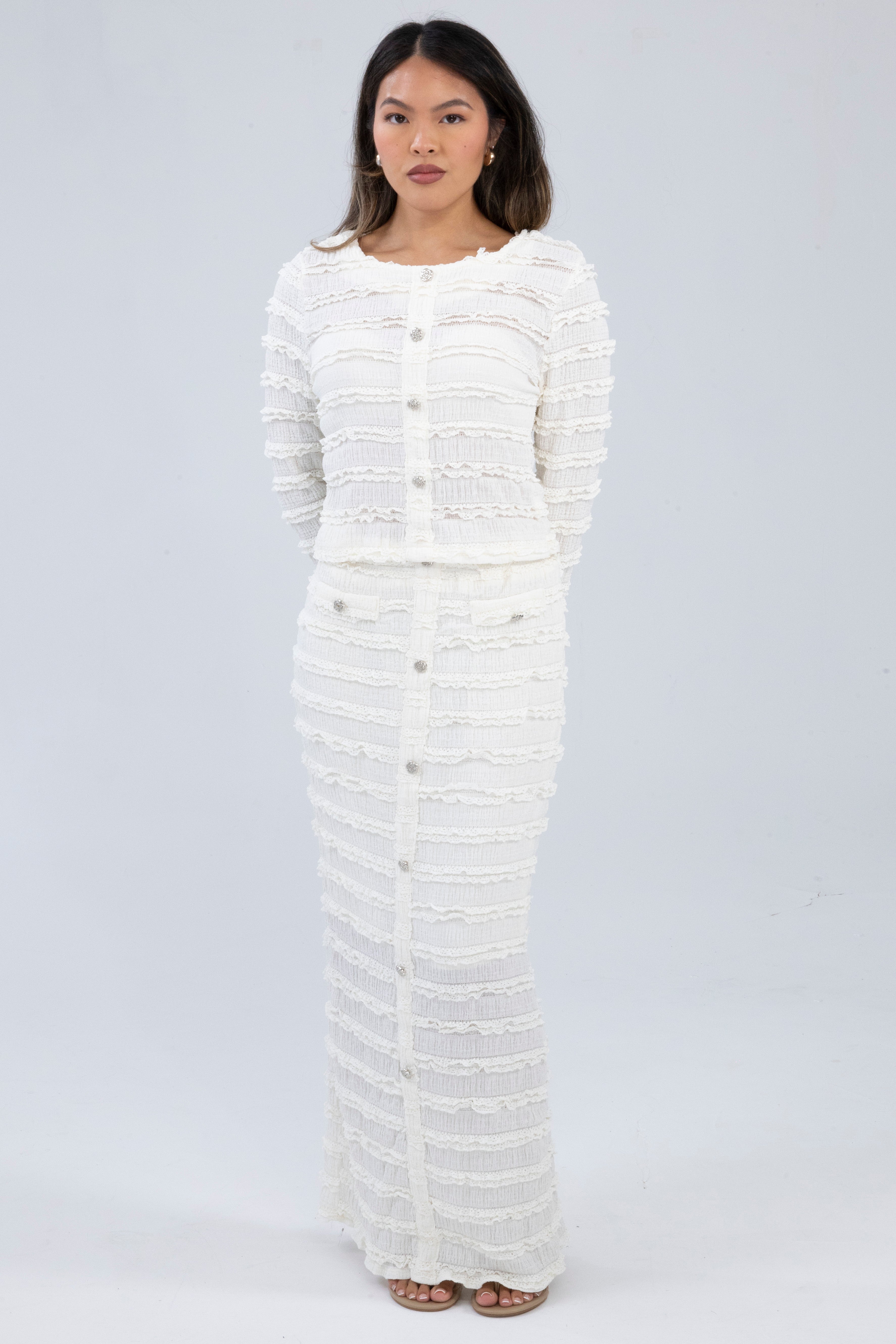 Refined and feminine, this cream skirt co-ord set is a fresh take on classic tailoring. Featuring a textured fabric with horizontal fringe detailing throughout, the cropped button-down top and matching high-waisted skirt create a structured yet elegant silhouette. Sparkling diamanté-style buttons add a subtle touch of glamour to this coordinated ensemble.