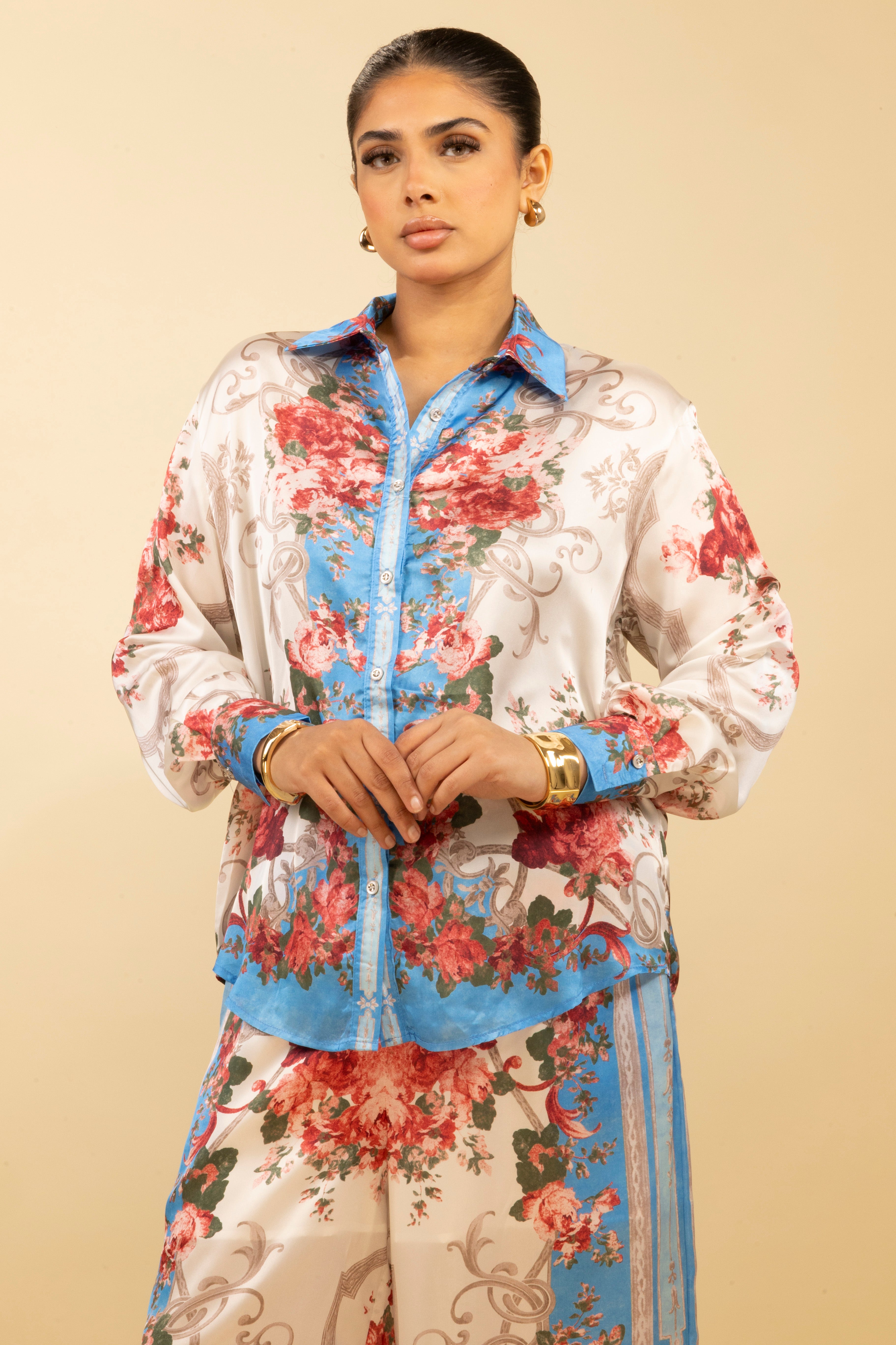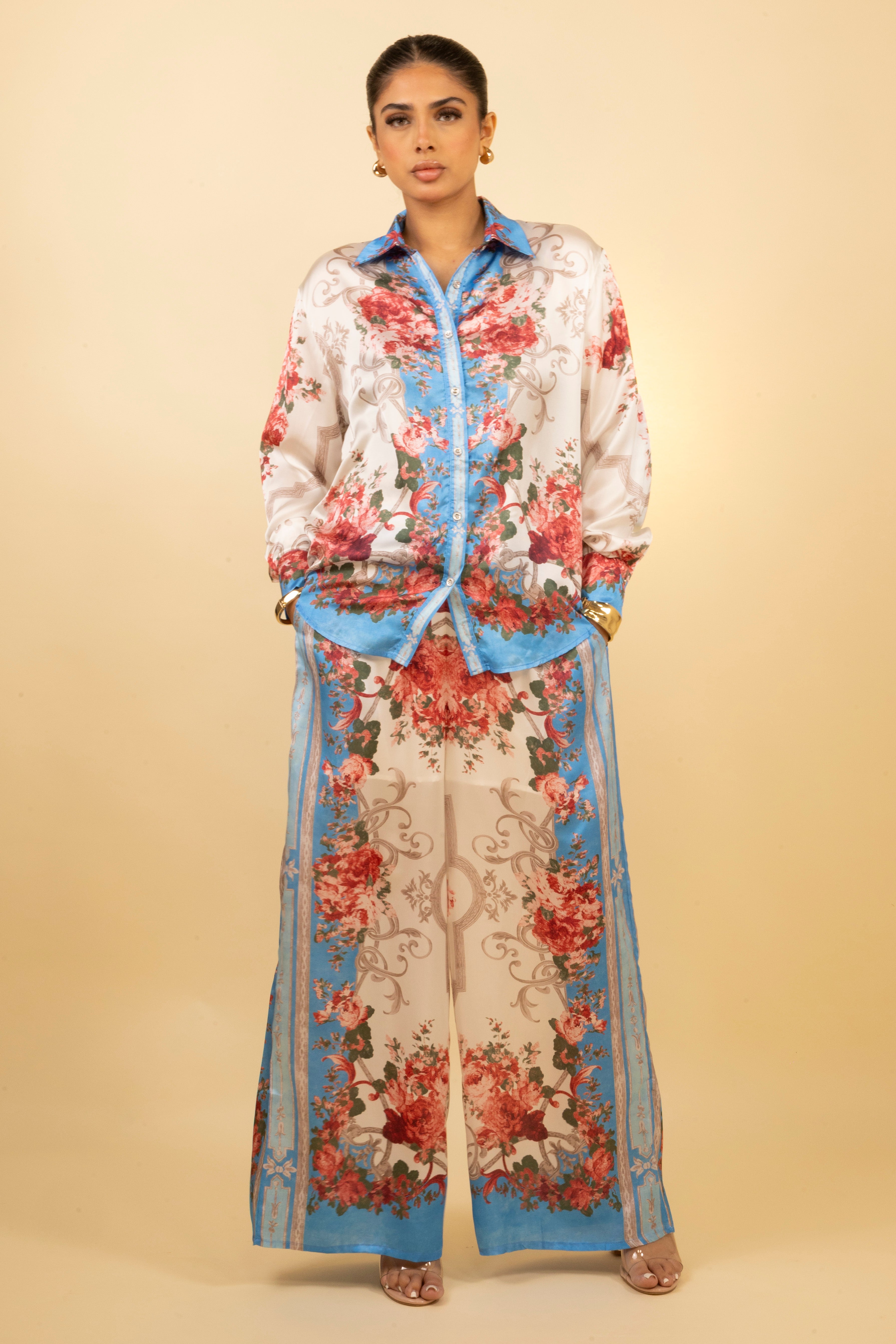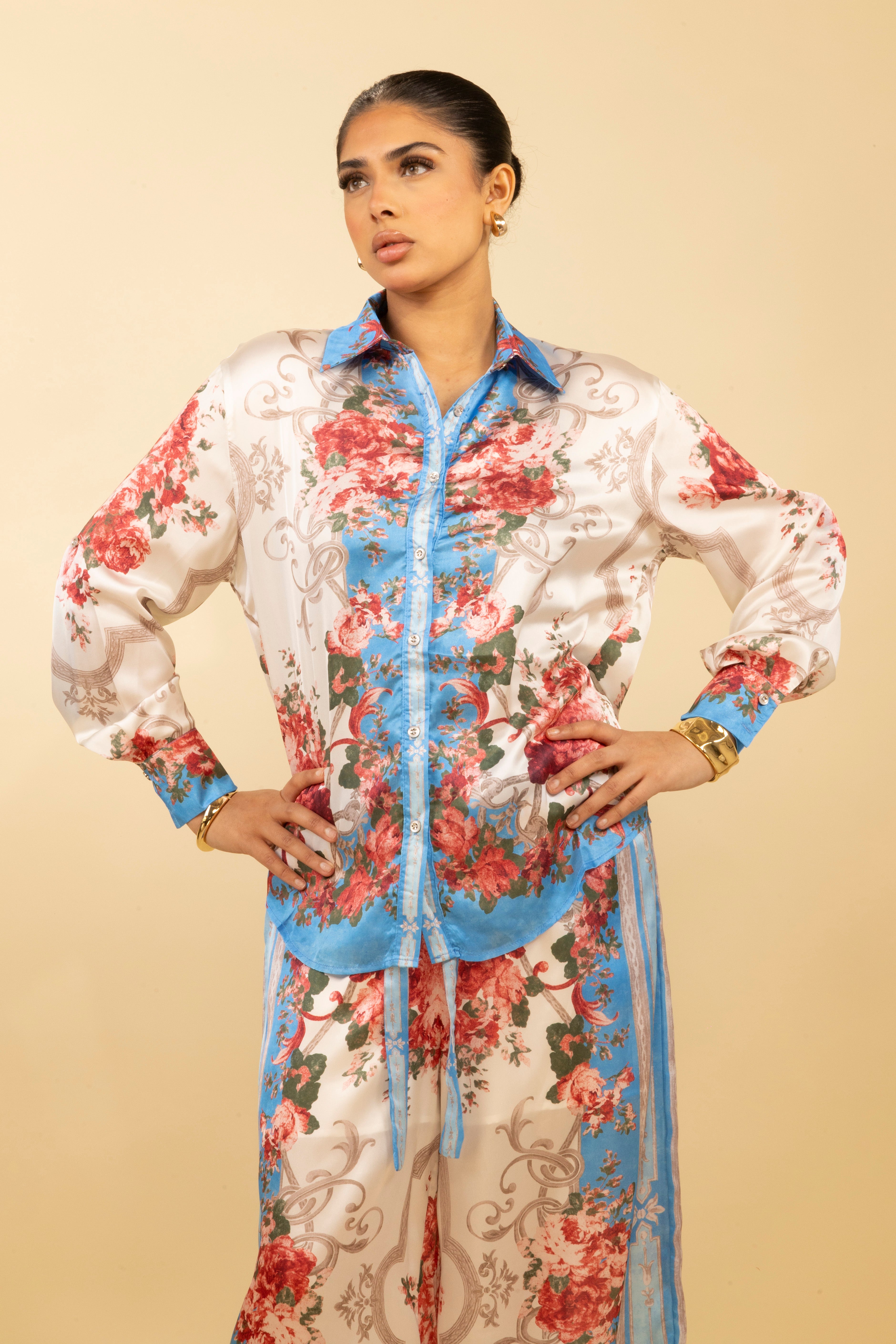 This romantic co-ord set brings together classic elegance and vibrant florals in a strikingly fresh way. Crafted from a satin-touch fabric, it features a button-down shirt with a soft collar and fluid wide-leg trousers. The vivid blue accents frame the design beautifully, while the red and blush-toned roses bloom across the set with a vintage-inspired charm.
