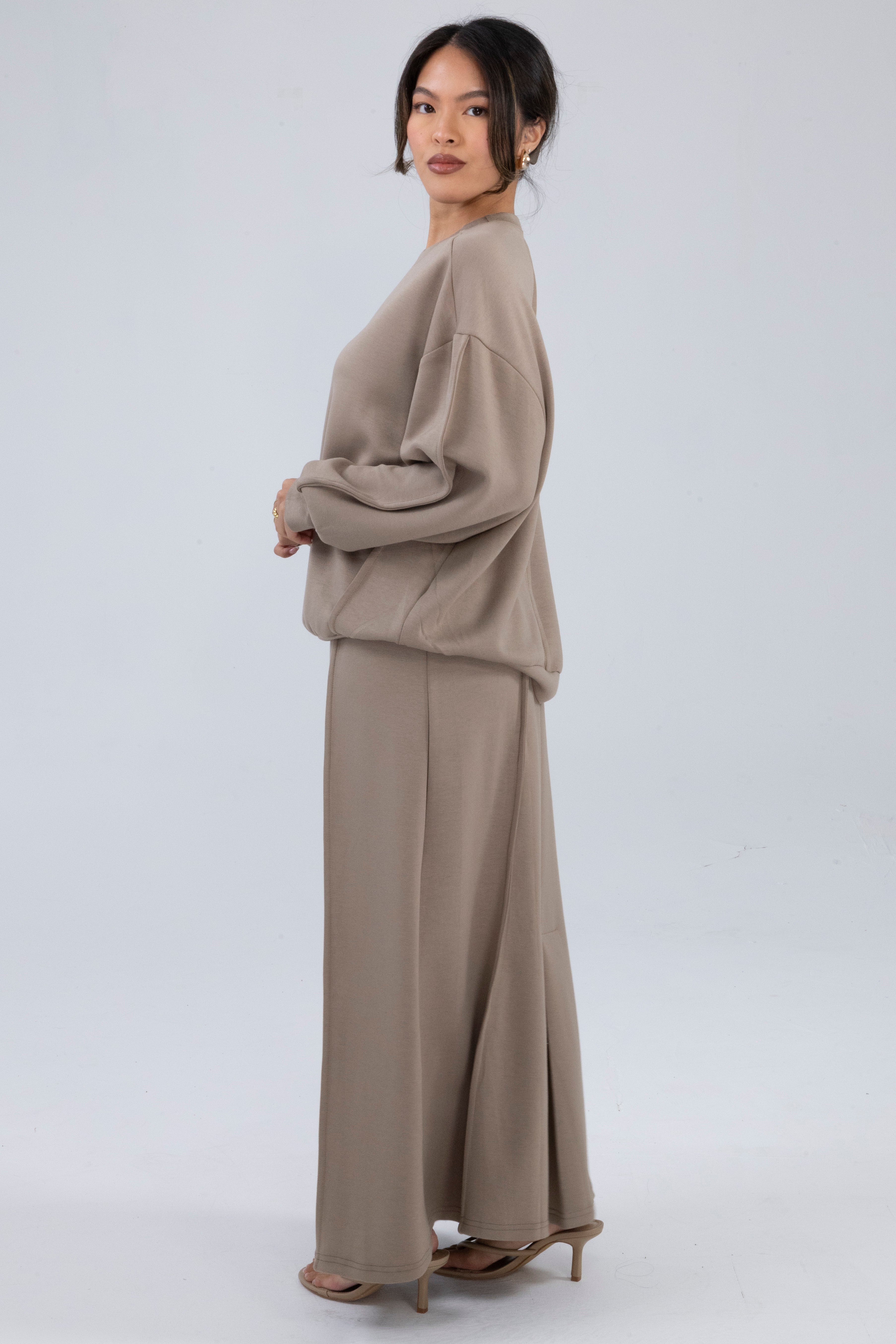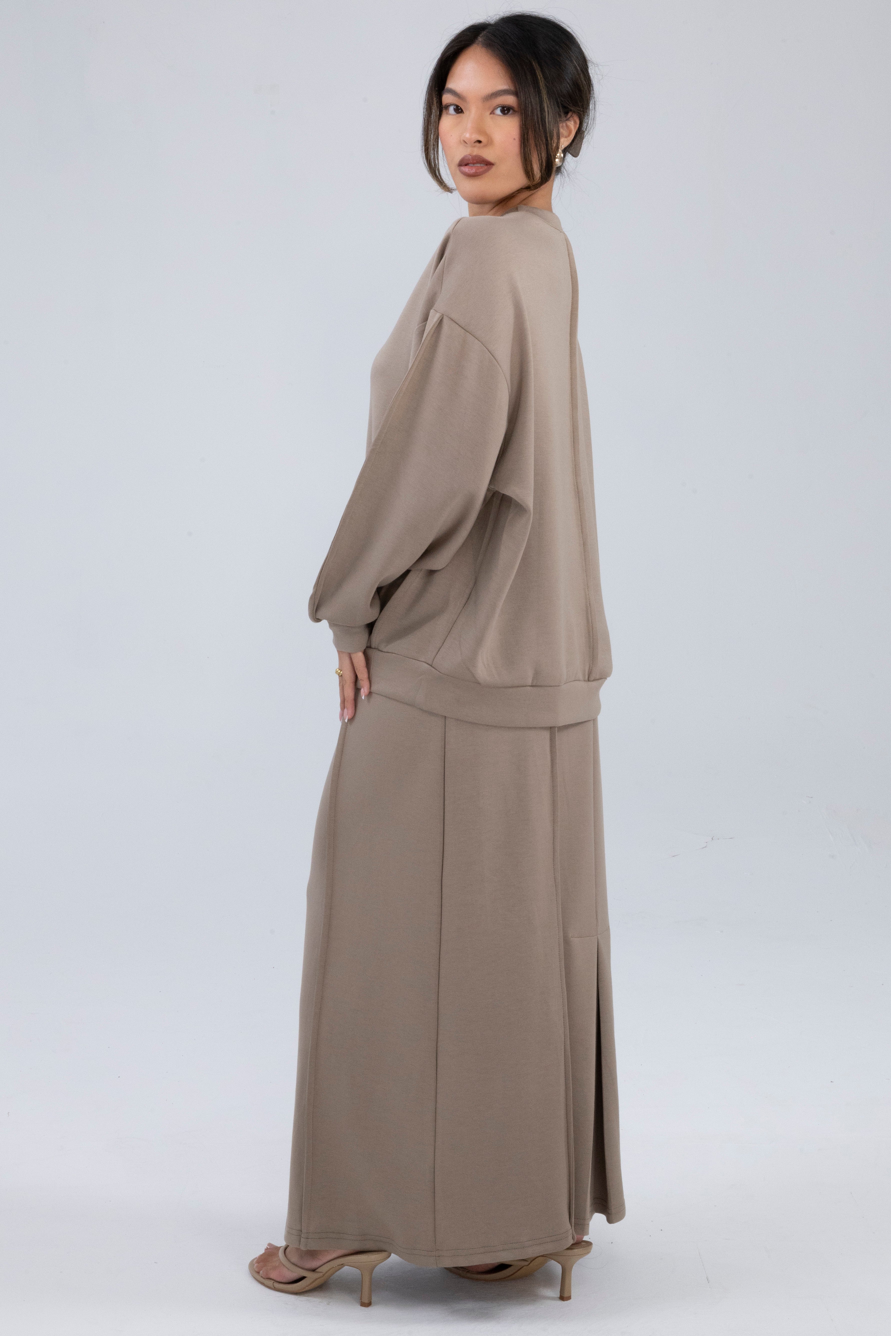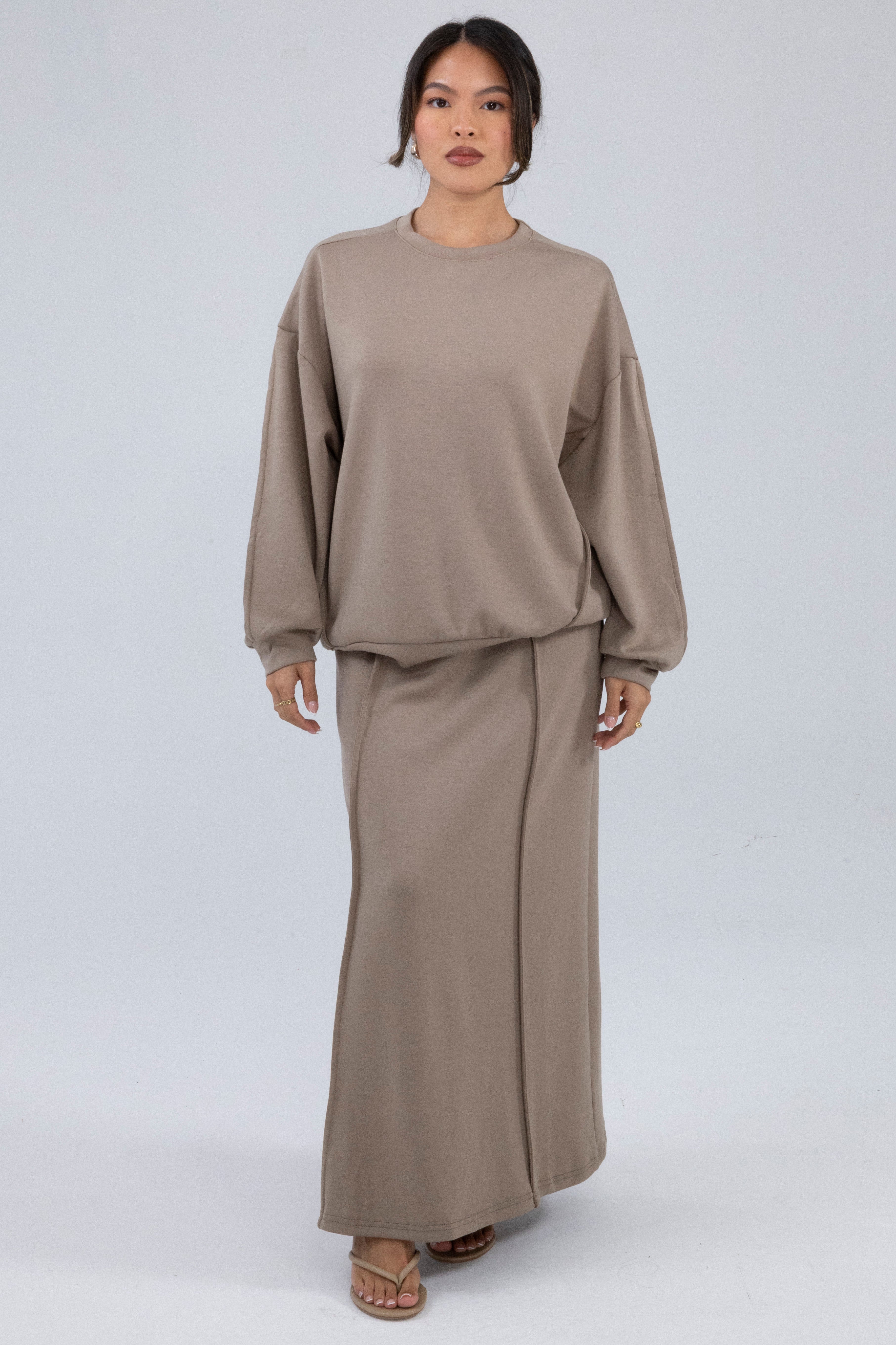 Effortless and elevated, this taupe co-ord set blends laid-back comfort with modern minimalism. The oversized sweatshirt features a crew neckline and drop shoulders, creating a relaxed silhouette that pairs perfectly with the matching maxi skirt. Crafted from soft, mid-weight fabric, it offers a cosy yet polished feel for everyday wear.