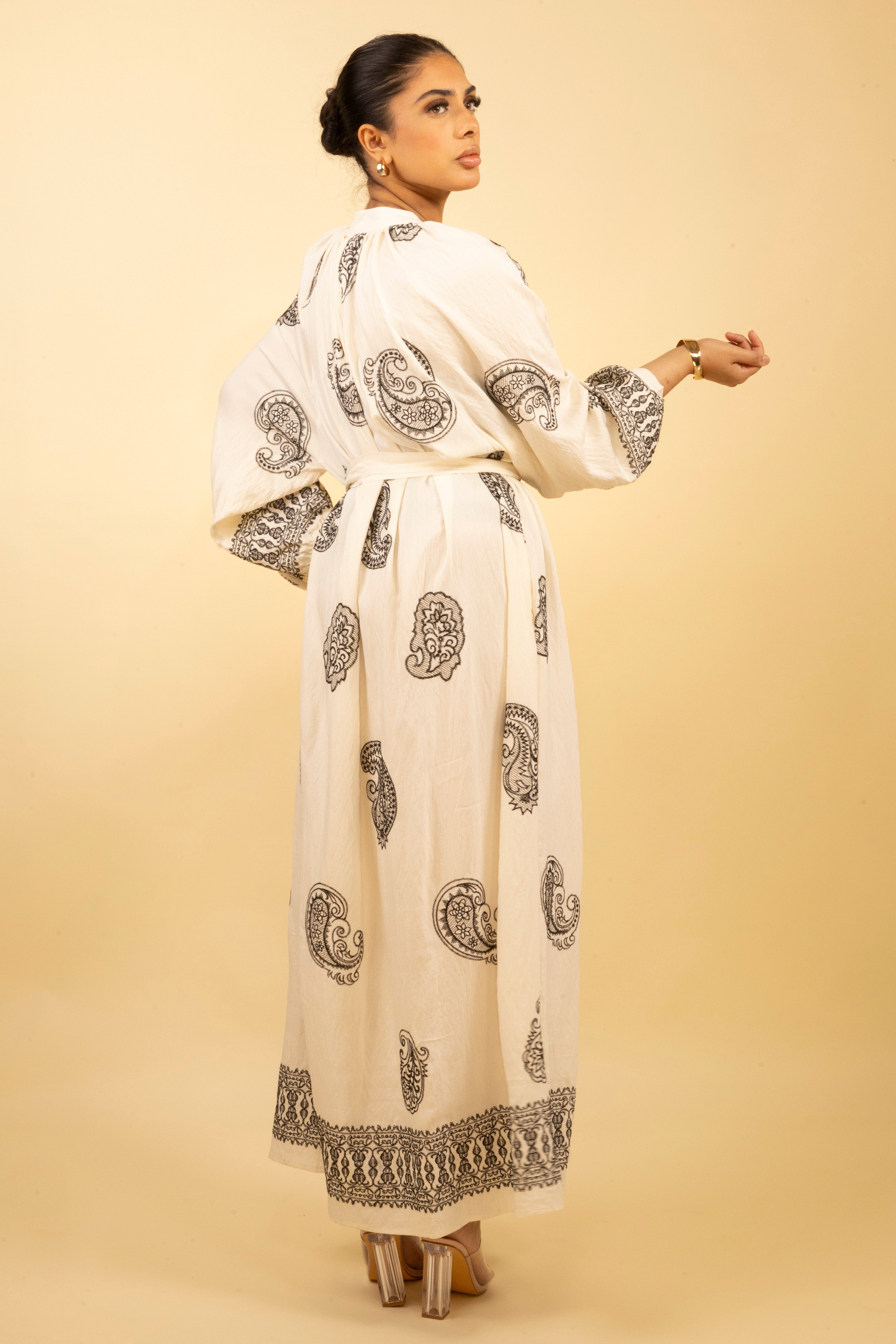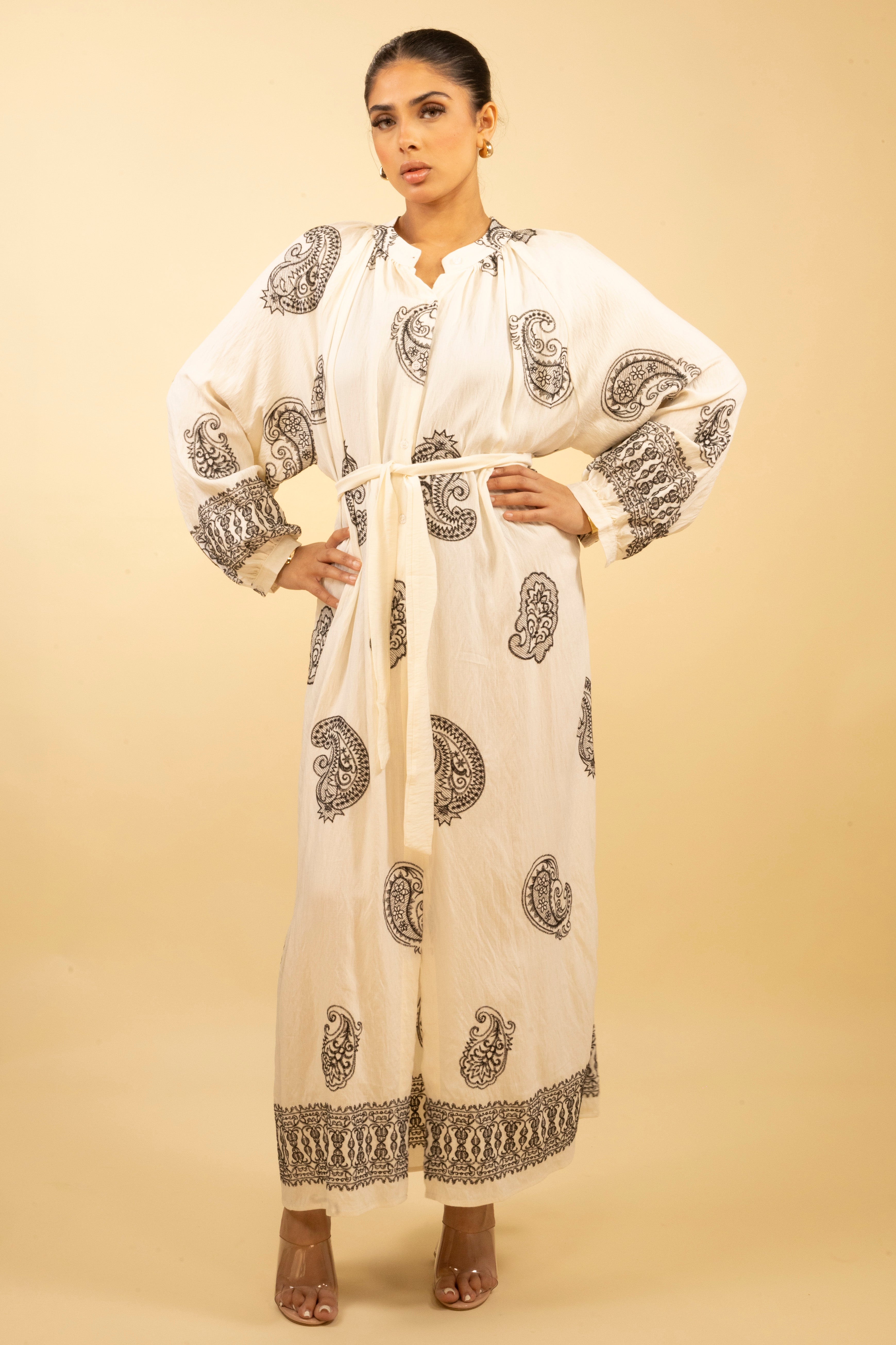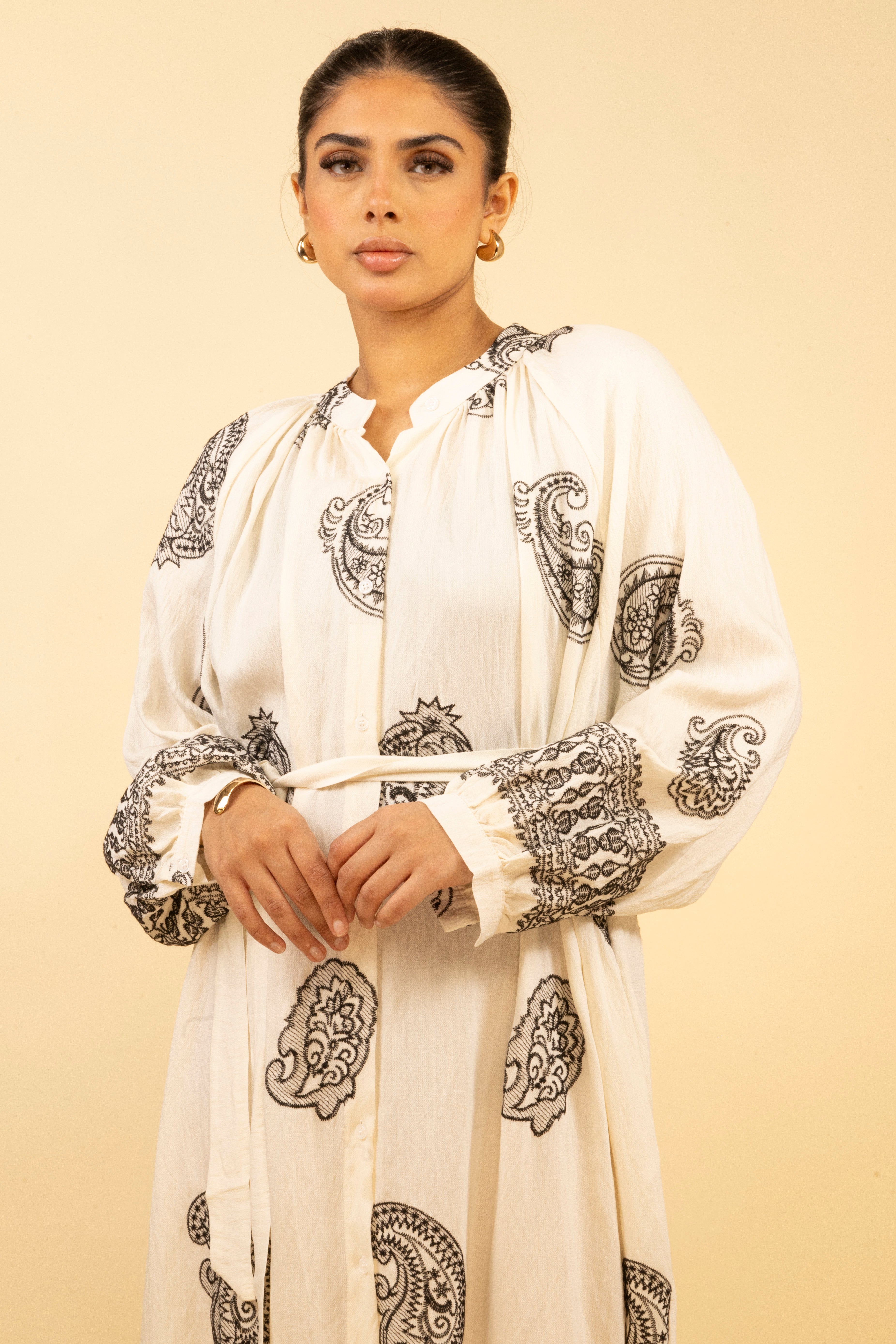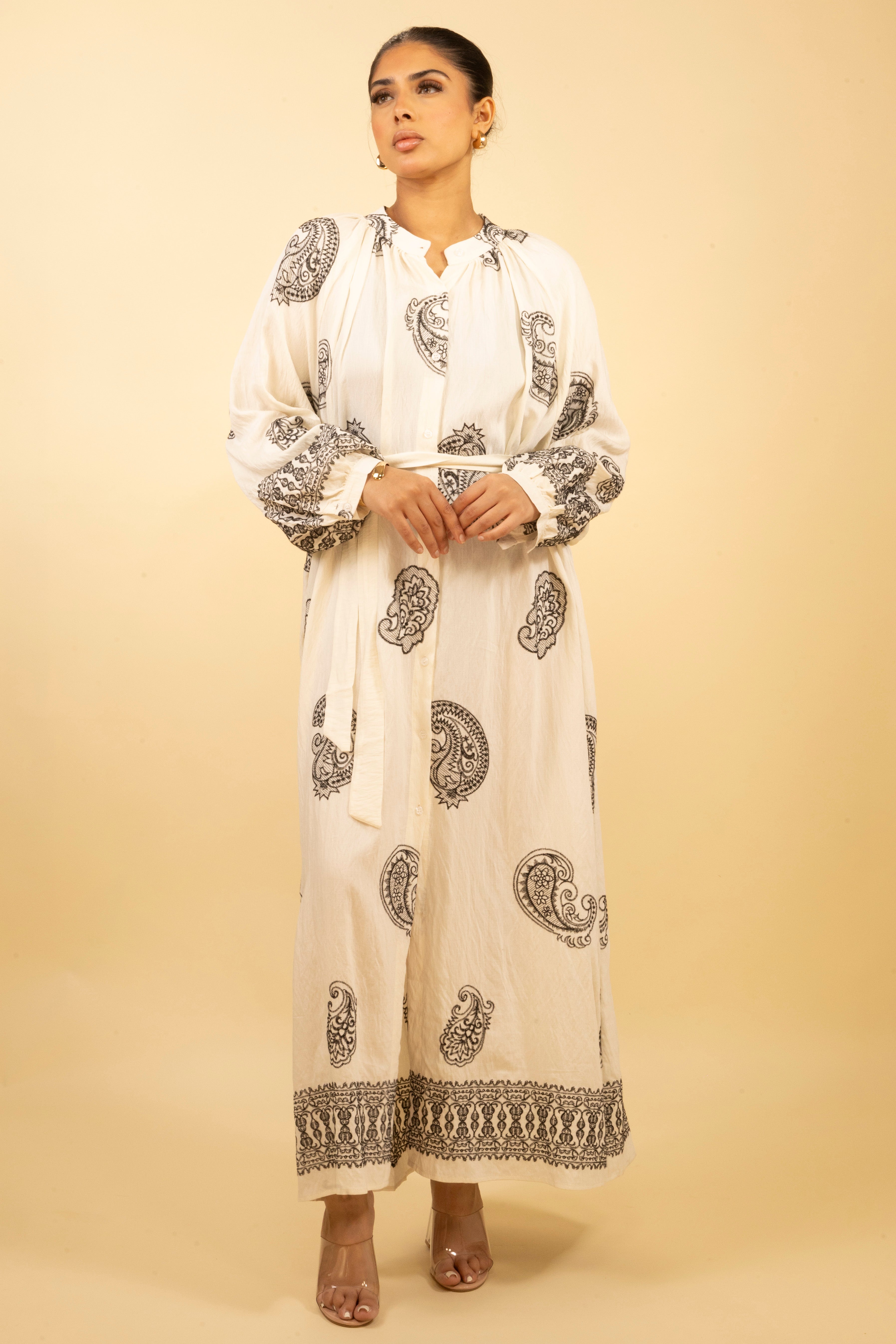 Elegant and effortlessly graceful, this beige maxi dress brings together traditional charm and contemporary ease. Made from a soft, breathable fabric, the dress features intricately embroidered black paisley motifs scattered across the body and sleeves, creating visual interest with a heritage-inspired feel. The cuffed bishop sleeves, gathered neckline, and border embroidery along the hem add depth and refinement, while a self-tie waist belt offers a flattering, customizable fit. Ideal for day-to-evening transitions, this dress captures timeless style with a relaxed silhouette perfect for modern wardrobes.