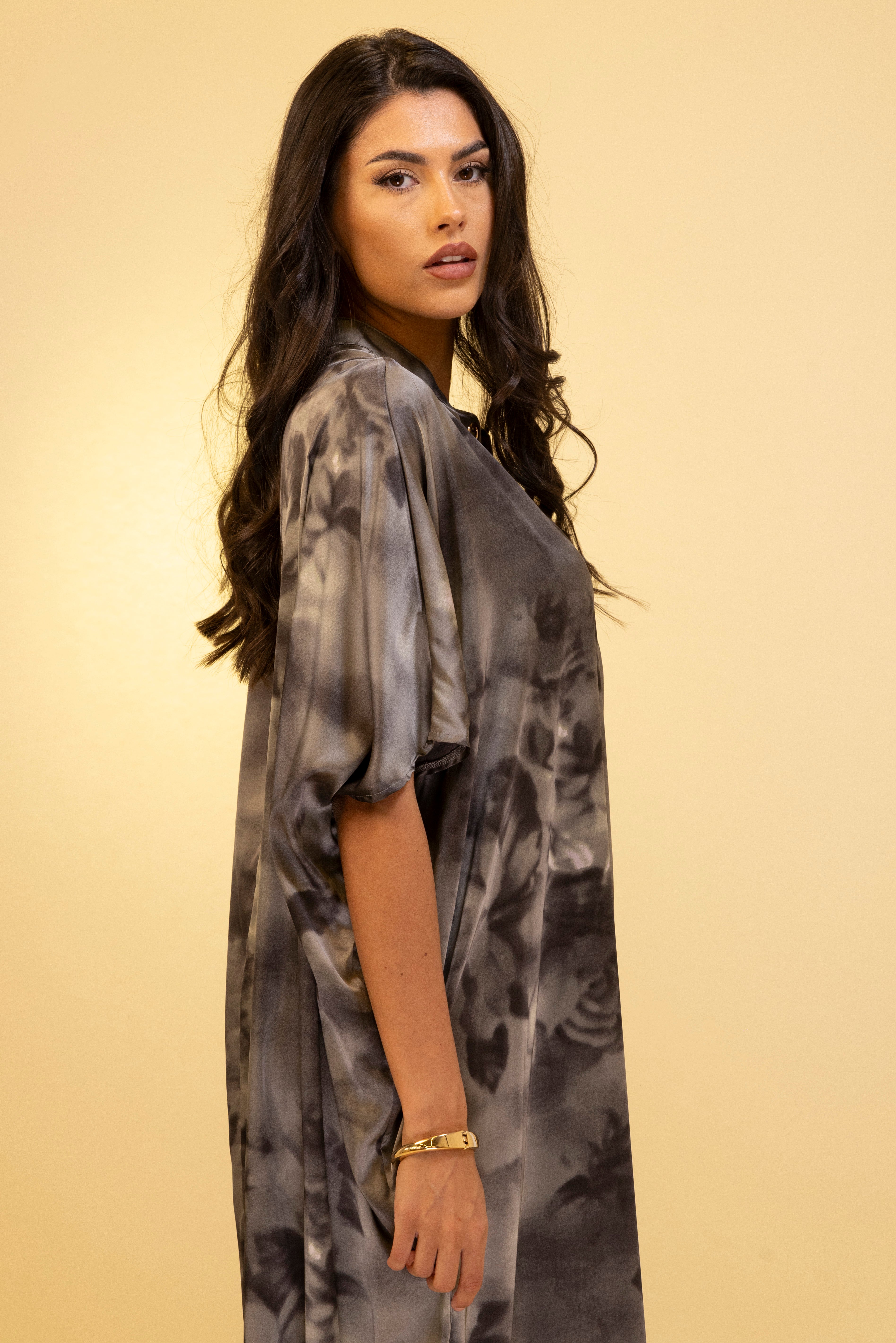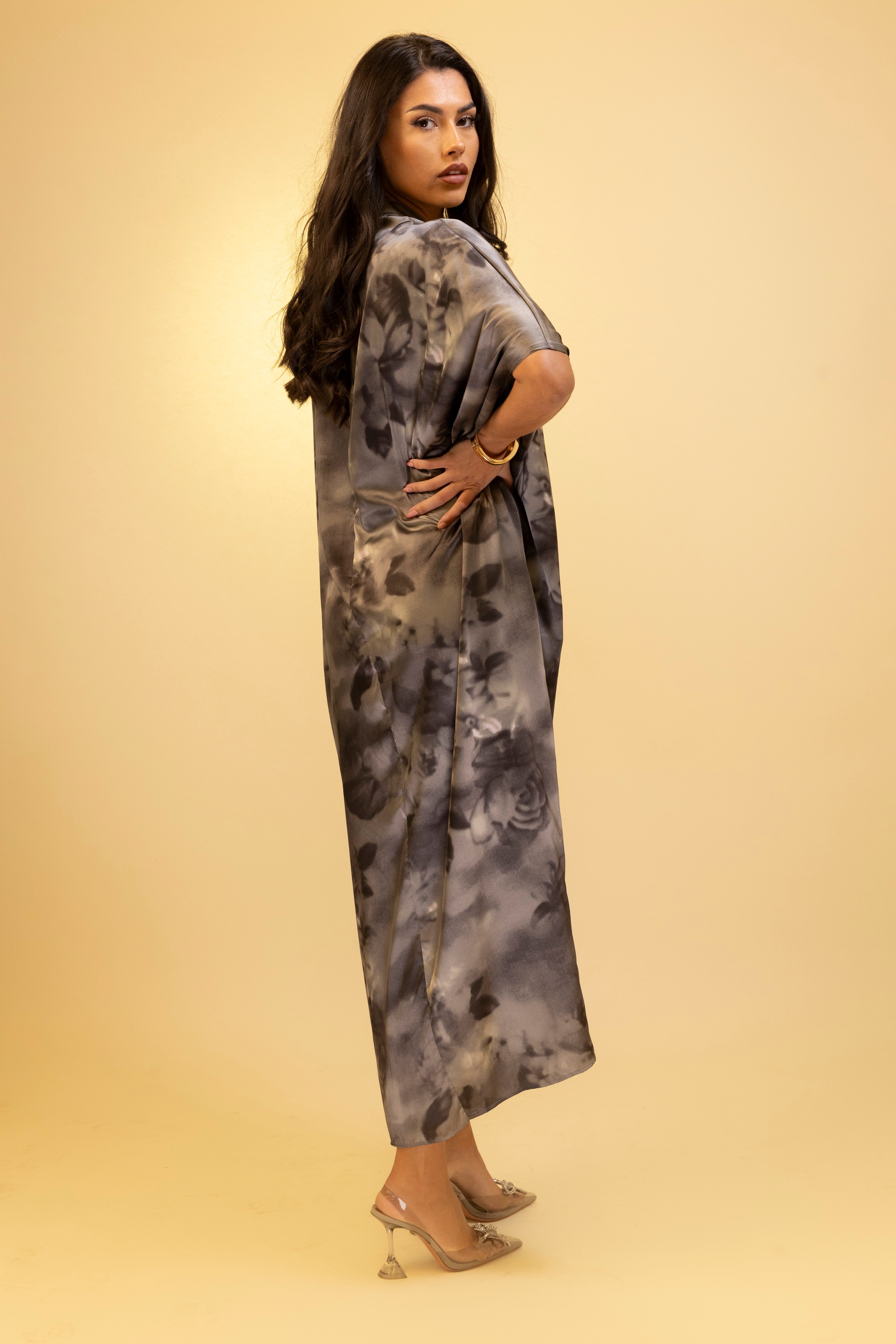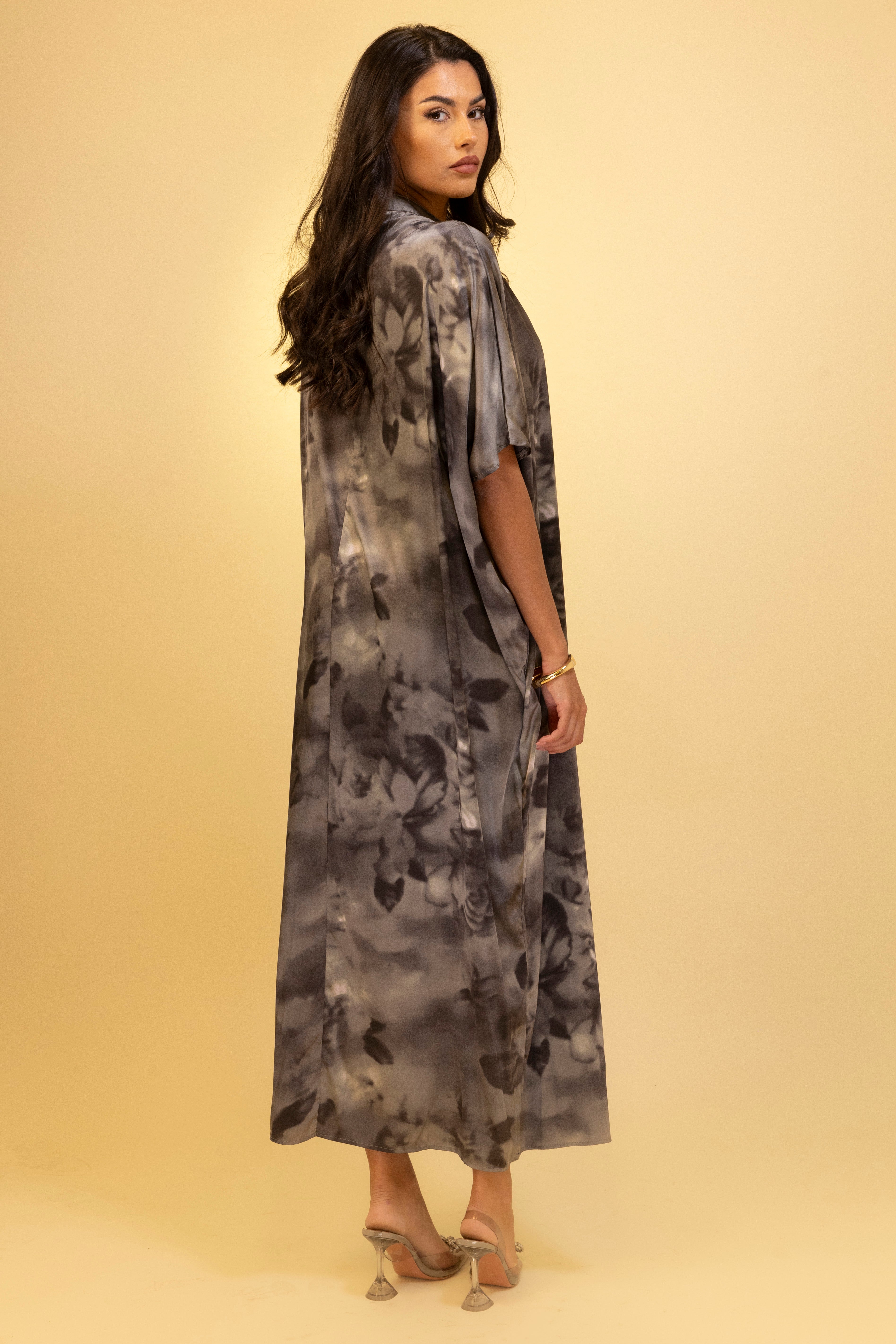 Dramatic yet effortlessly graceful, this black floral-print maxi dress is a bold expression of refined elegance. The fabric showcases a moody, blurred floral pattern in shades of charcoal and smoke, blending softness with an almost ink-like intensity. Designed in a kaftan-style silhouette, it flows freely with a relaxed fit, featuring wide sleeves and subtle draping that flatter without clinging. The neckline is elevated by a small stand collar and a placket adorned with elegant gold buttons, adding structure and a hint of polish. Ideal for evening occasions or elevated daywear, this piece exudes a quiet confidence that speaks volumes.