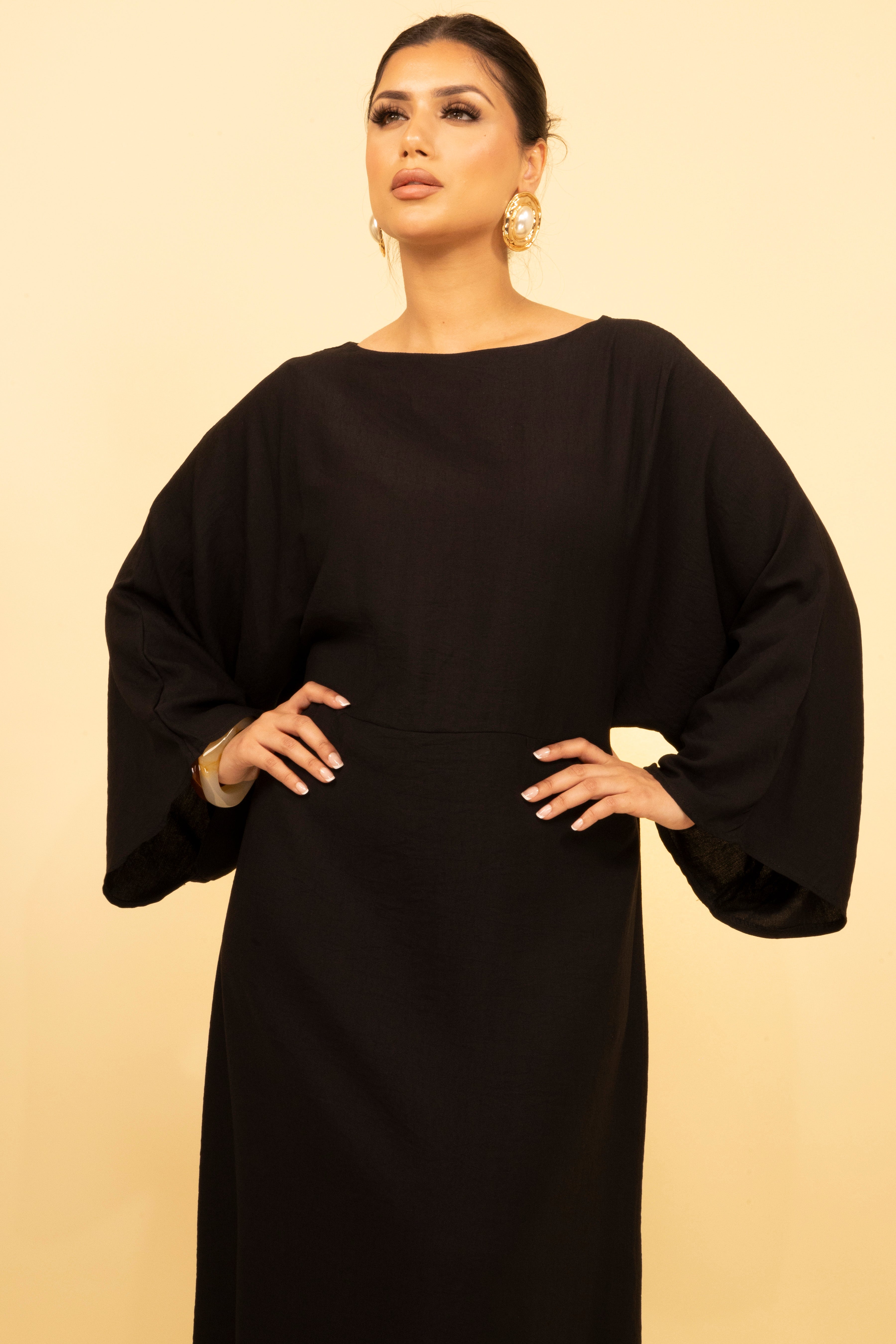 Elevate your everyday elegance with this minimal yet refined black maxi dress. Crafted from a lightweight, breathable fabric, this piece features a graceful boat neckline and relaxed batwing sleeves that flow effortlessly into the structured waistline. The fabric's fluid drape allows for ease of movement, while maintaining a flattering silhouette from every angle.