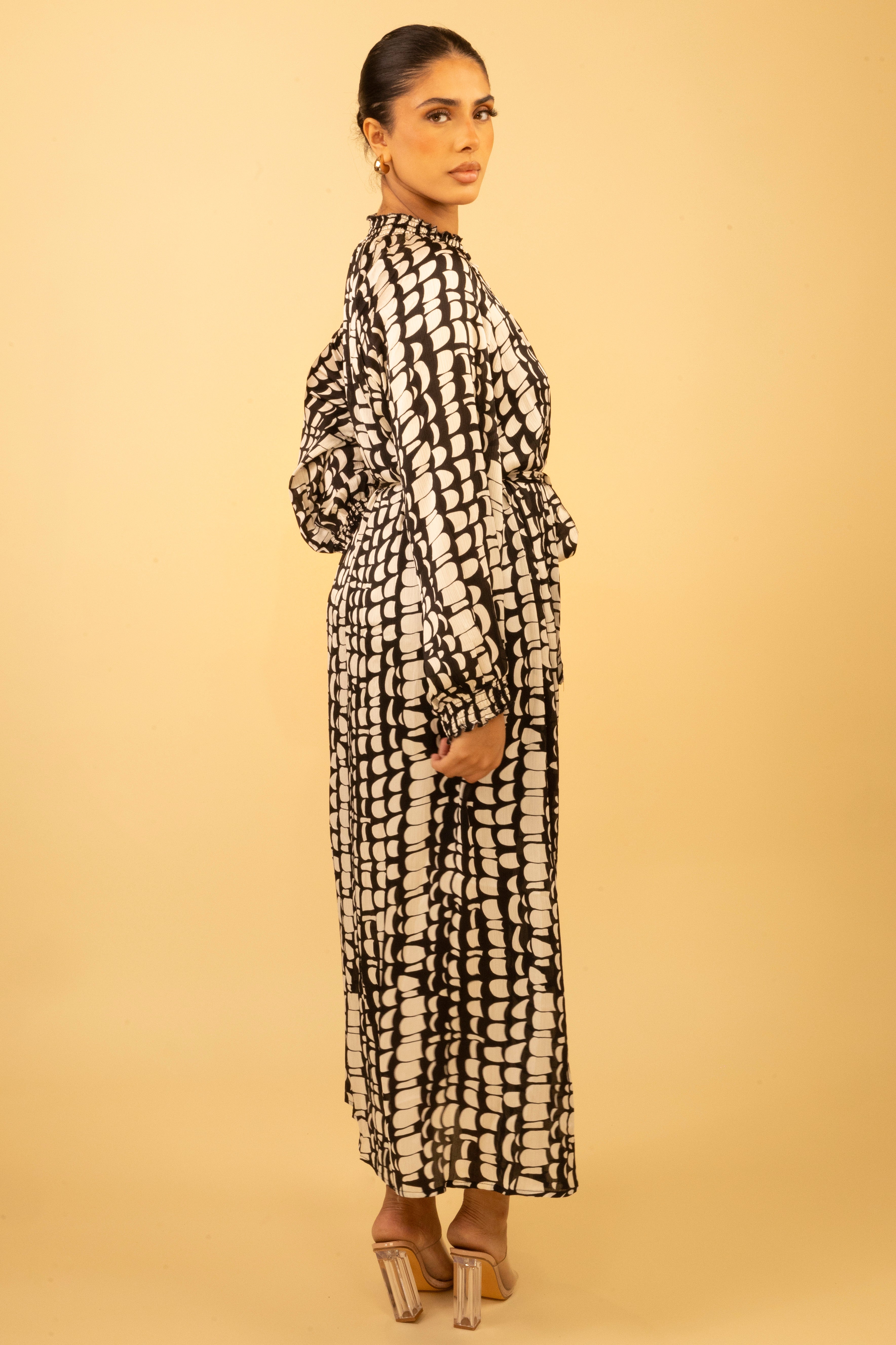 Make a statement in this striking black dress, featuring a bold geometric print that effortlessly draws the eye. The high neckline and gathered detailing across the chest add texture and refinement, while the flowing silhouette creates an elegant drape perfect for elevated daywear or evening outings.