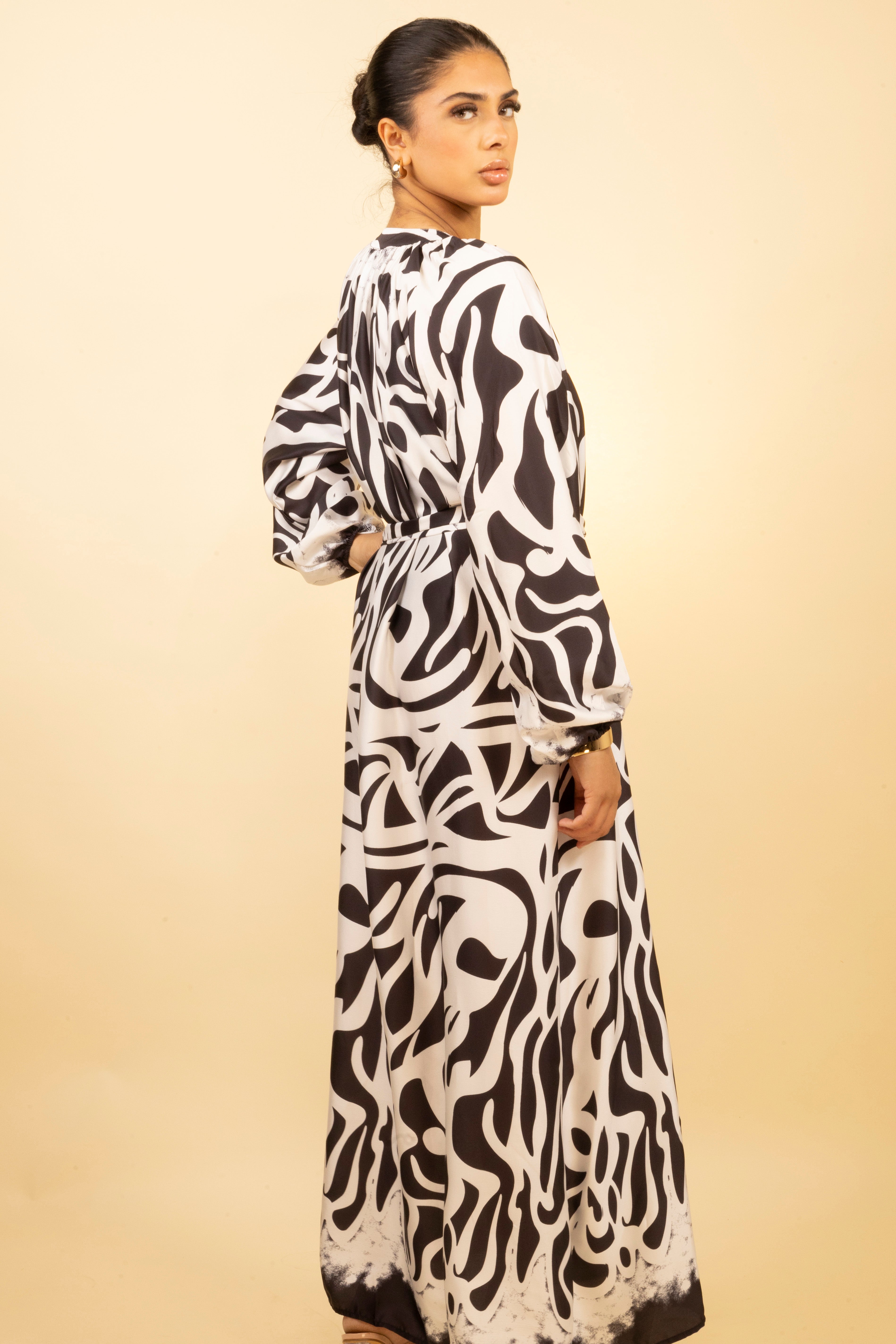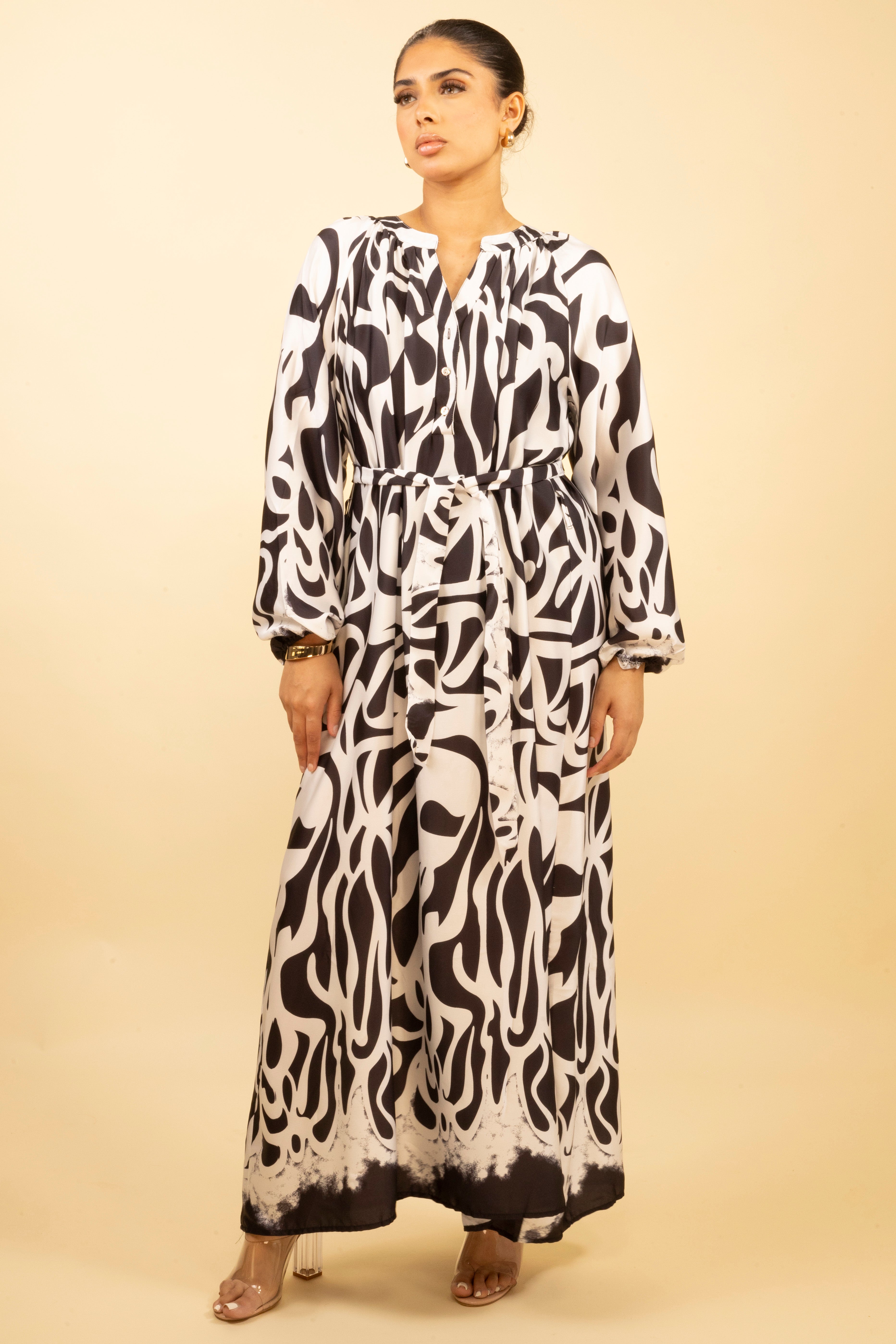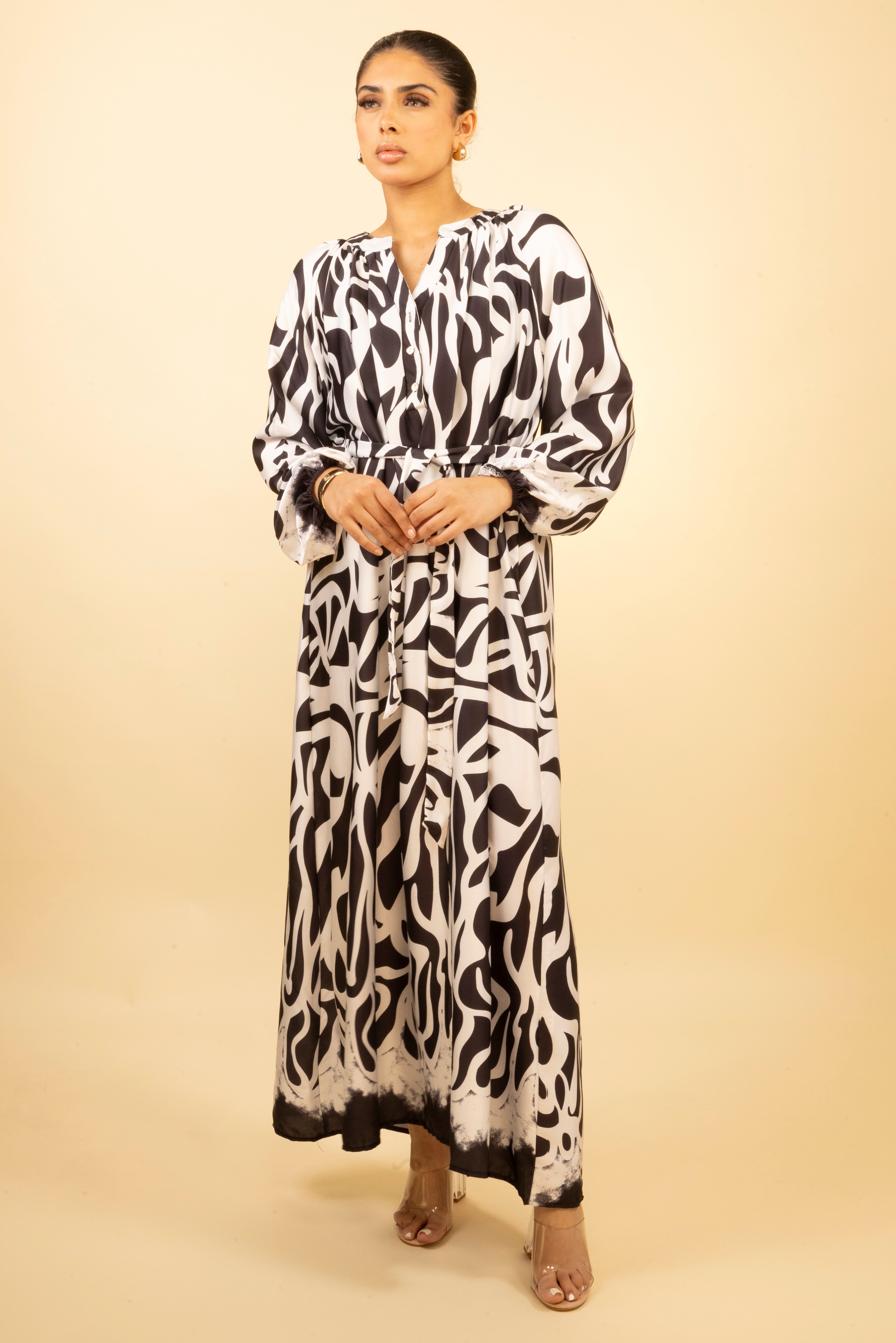 Make a monochrome statement in this striking black and white maxi dress, designed with an abstract wave print that flows seamlessly from neckline to hem. The silhouette features a soft V-neckline, button detailing, and a self-tie waist belt that cinches in to flatter your shape. Billowy long sleeves add an effortless elegance, while the subtle dip-dye effect along the hem brings a contemporary edge. Perfect for everything from evening occasions to stylish daytime outings.