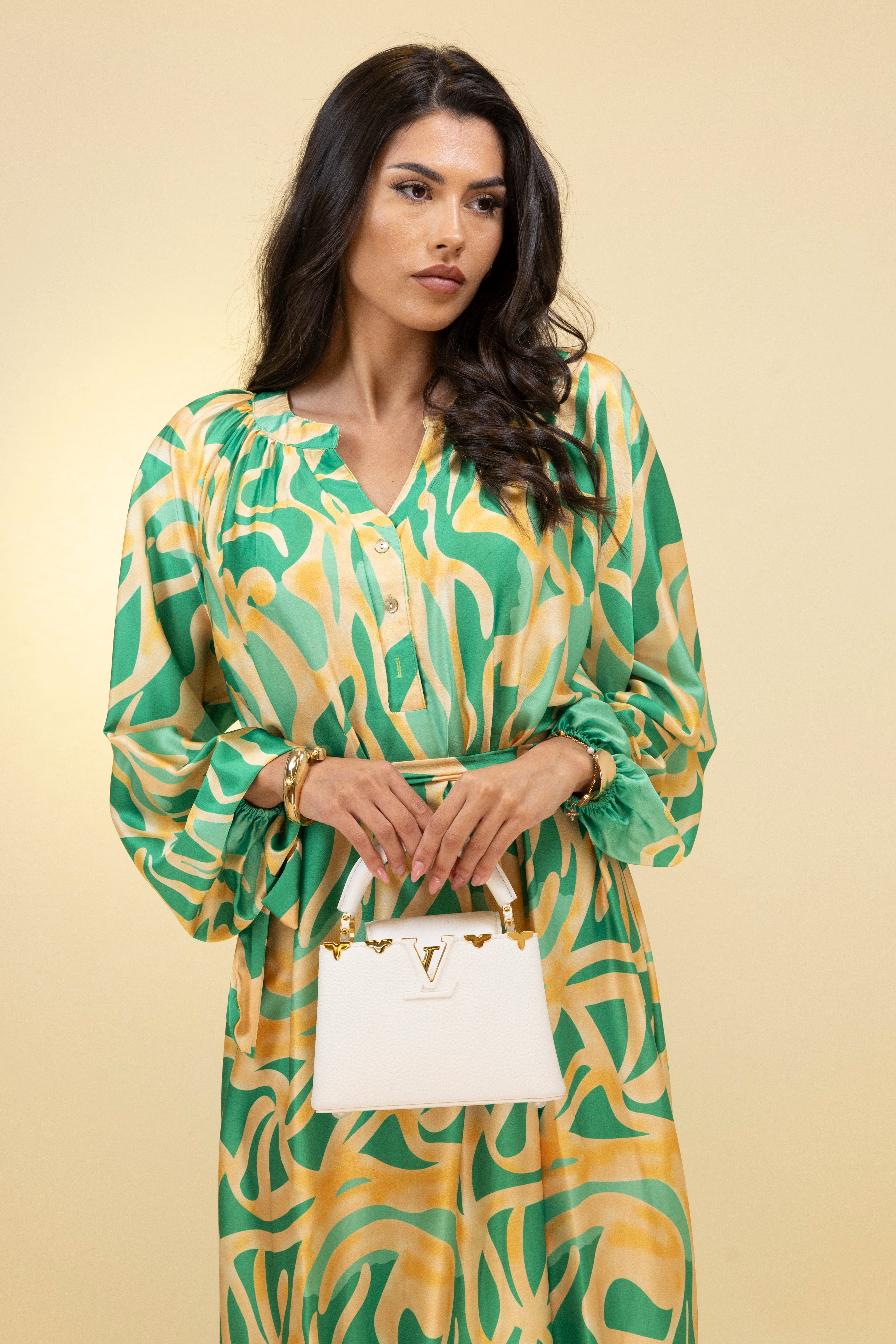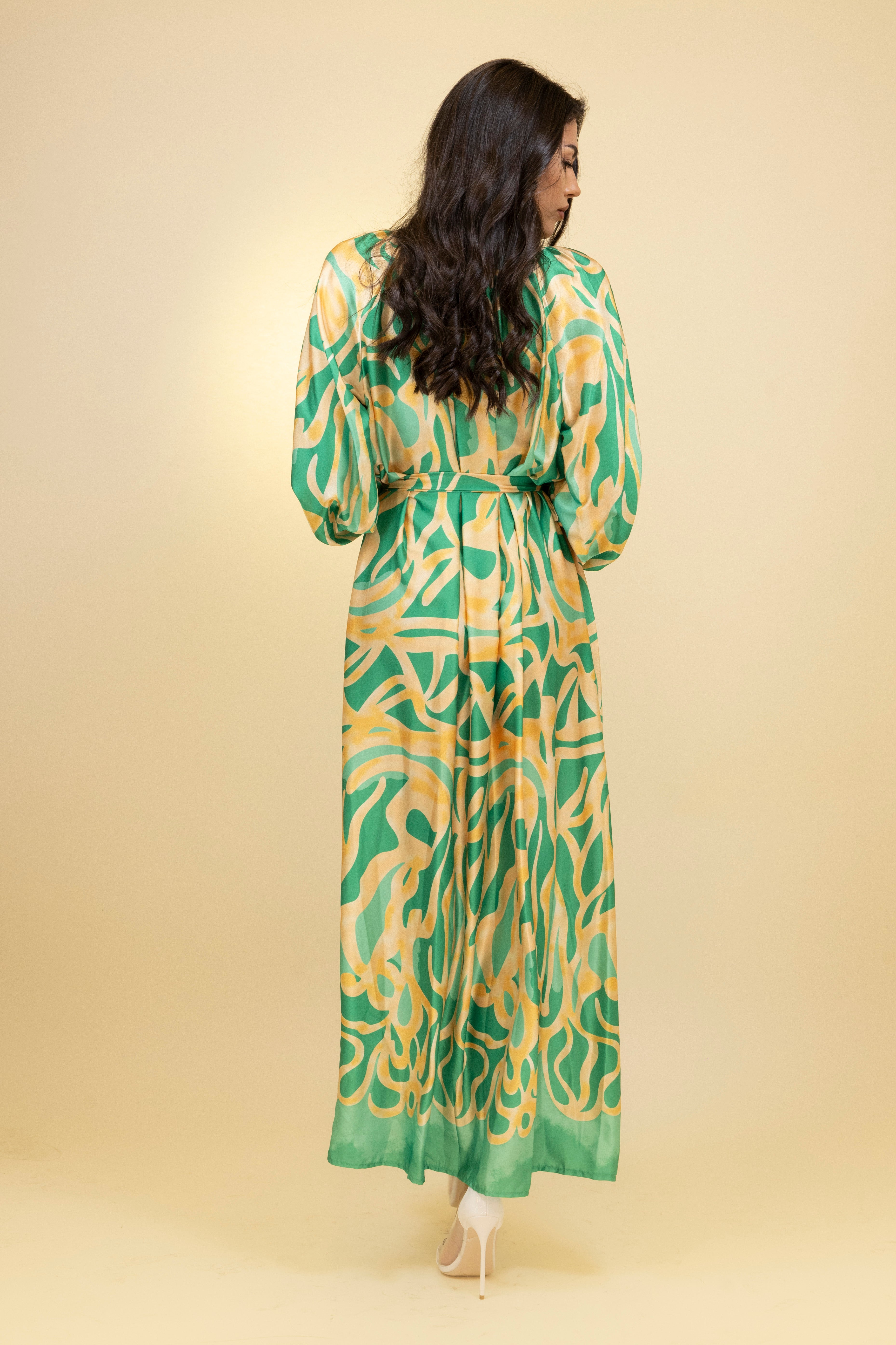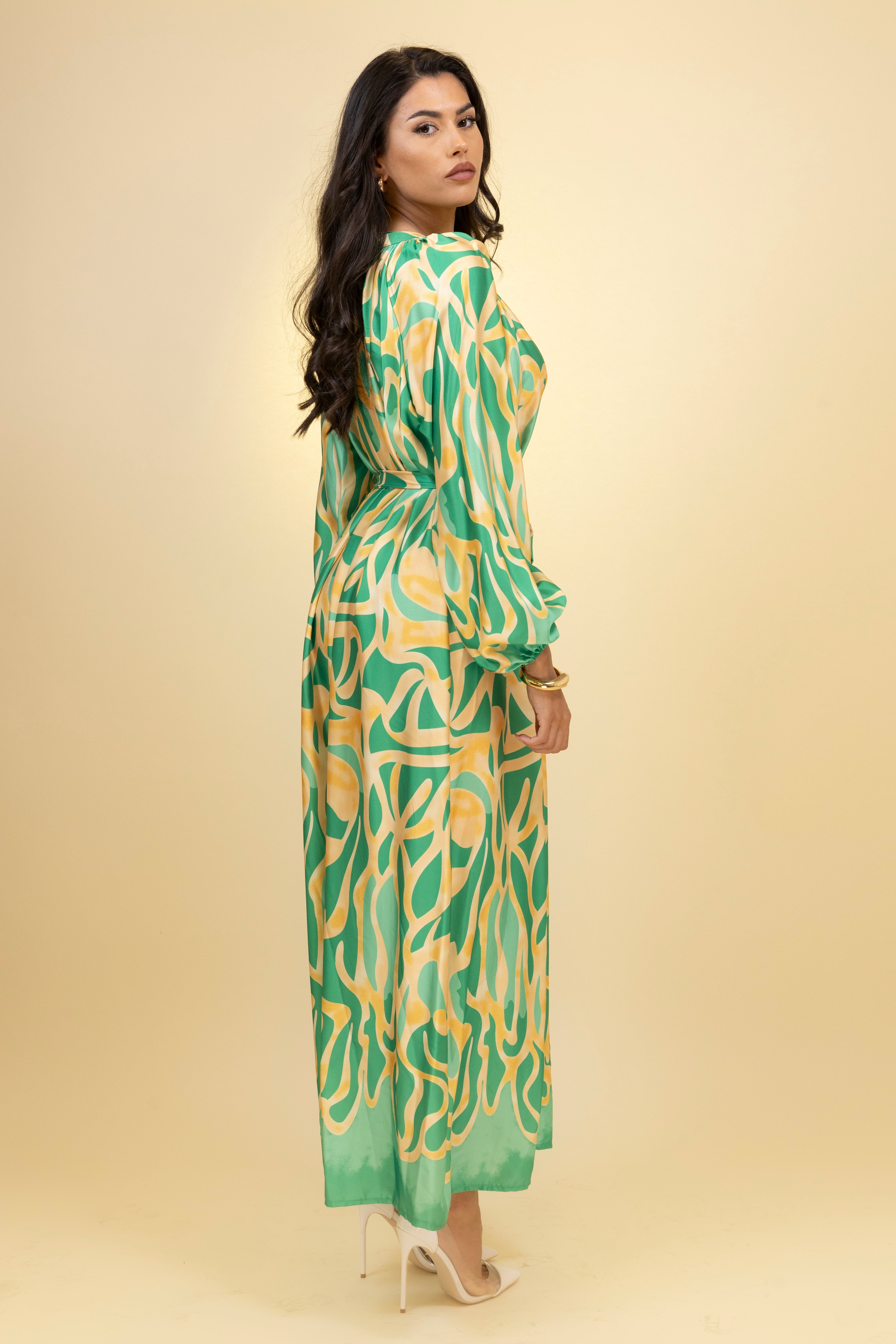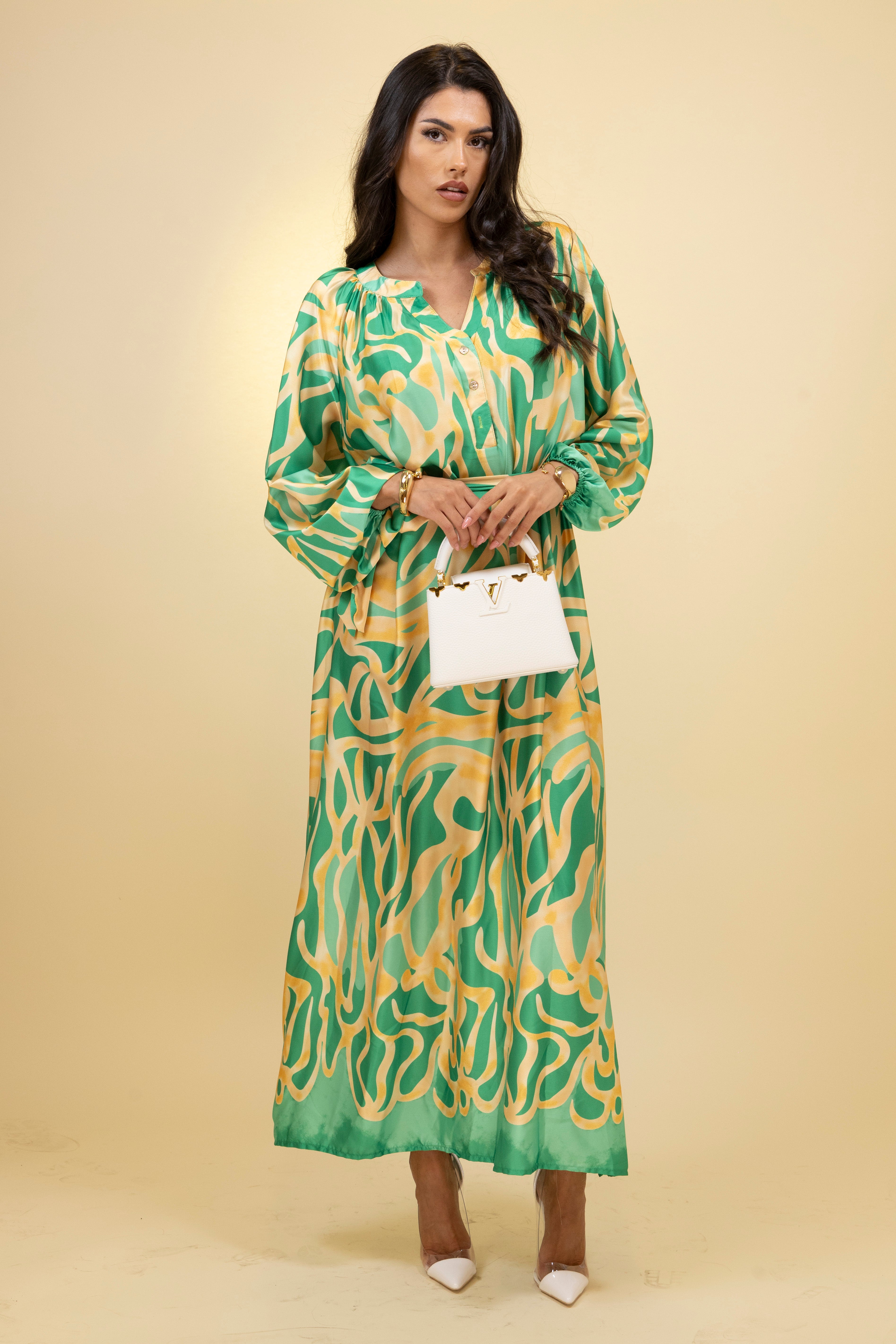 Vibrant and playful, this green maxi dress is a bold celebration of color and movement. Crafted from a silky, lightweight fabric, it features an abstract swirl print in lively shades of green and yellow that instantly evoke a tropical, sun-drenched energy. The gathered neckline adds soft volume to the bodice, while the button-down placket and gently elasticated waist create a flattering, wearable shape. Billowy sleeves are finished with ruched cuffs, adding a touch of drama and femininity to the overall silhouette. Perfect for warm-weather events, garden parties, or holiday evenings, this dress makes a confident and joyful statement.