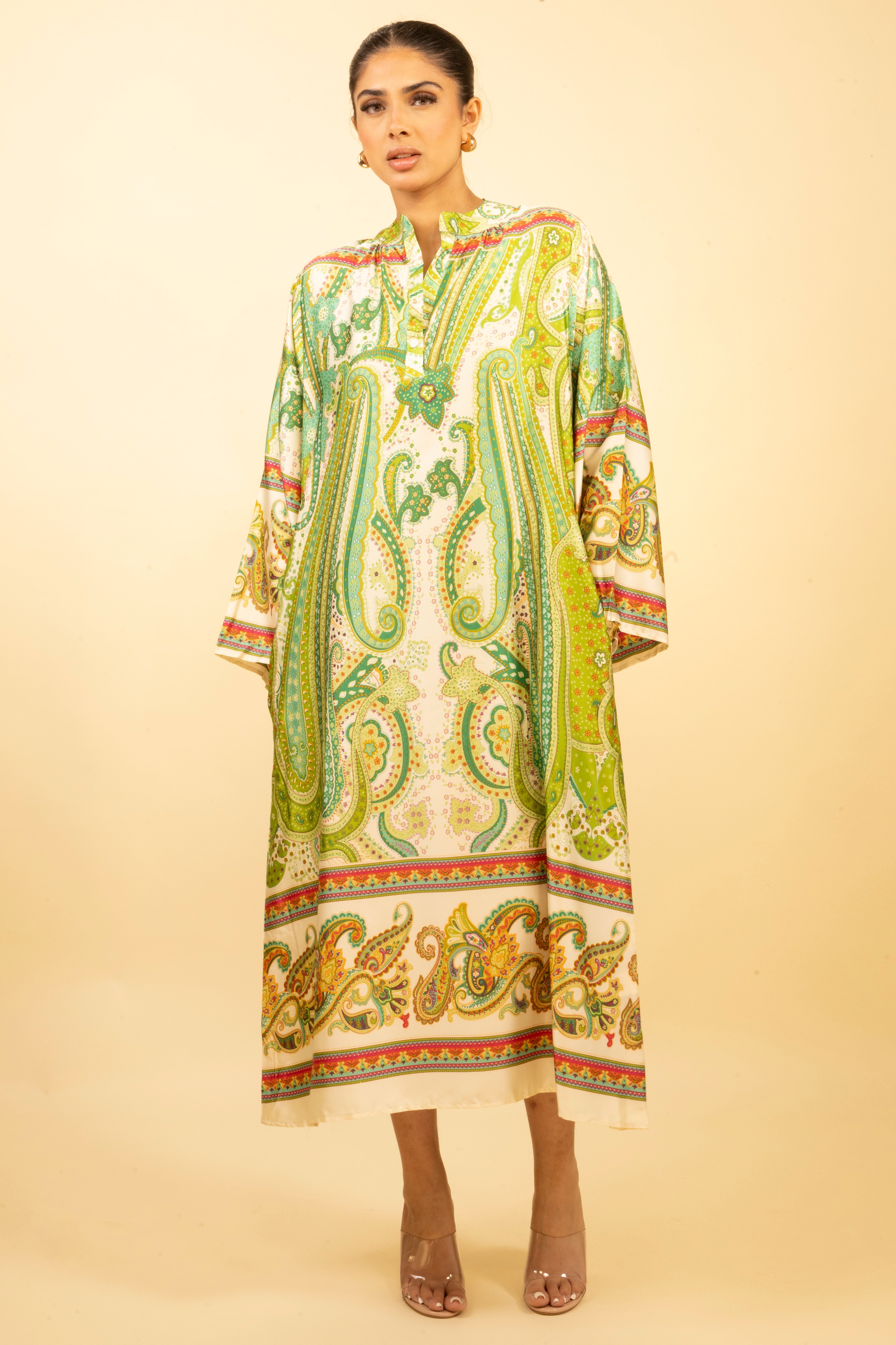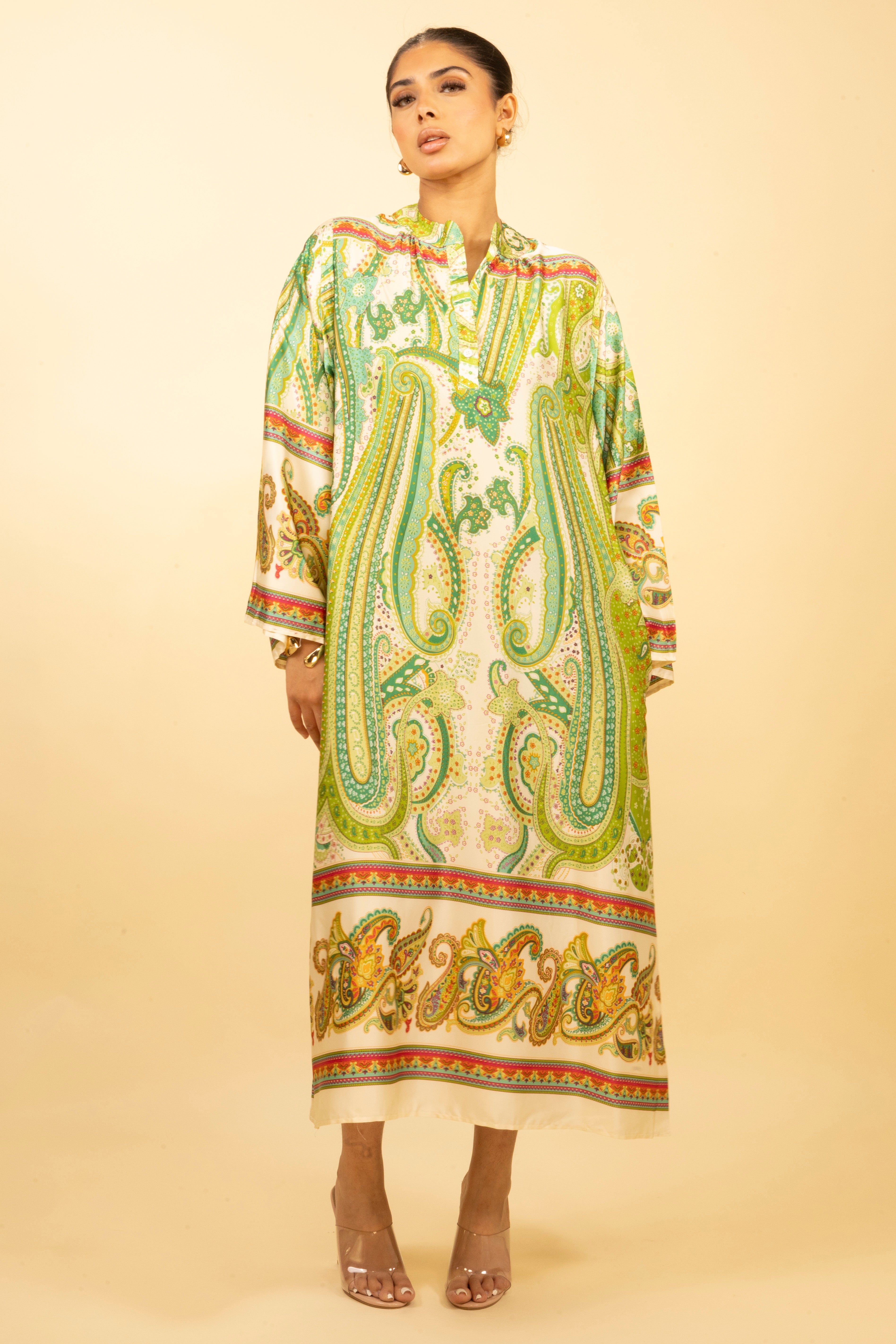 Bright, uplifting, and undeniably striking, this green paisley maxi dress is a celebration of colour and heritage design. Featuring an intricate pattern of swirling lime, jade, and sunshine yellow tones, the silky fabric drapes gracefully across a relaxed, kaftan-inspired silhouette. A mandarin collar and short buttoned neckline add a touch of refinement, while wide sleeves and a richly bordered hem lend a sense of flow and grandeur. Perfect for special daytime events, garden parties, or summer soirées, this dress blends bold style with breezy elegance.