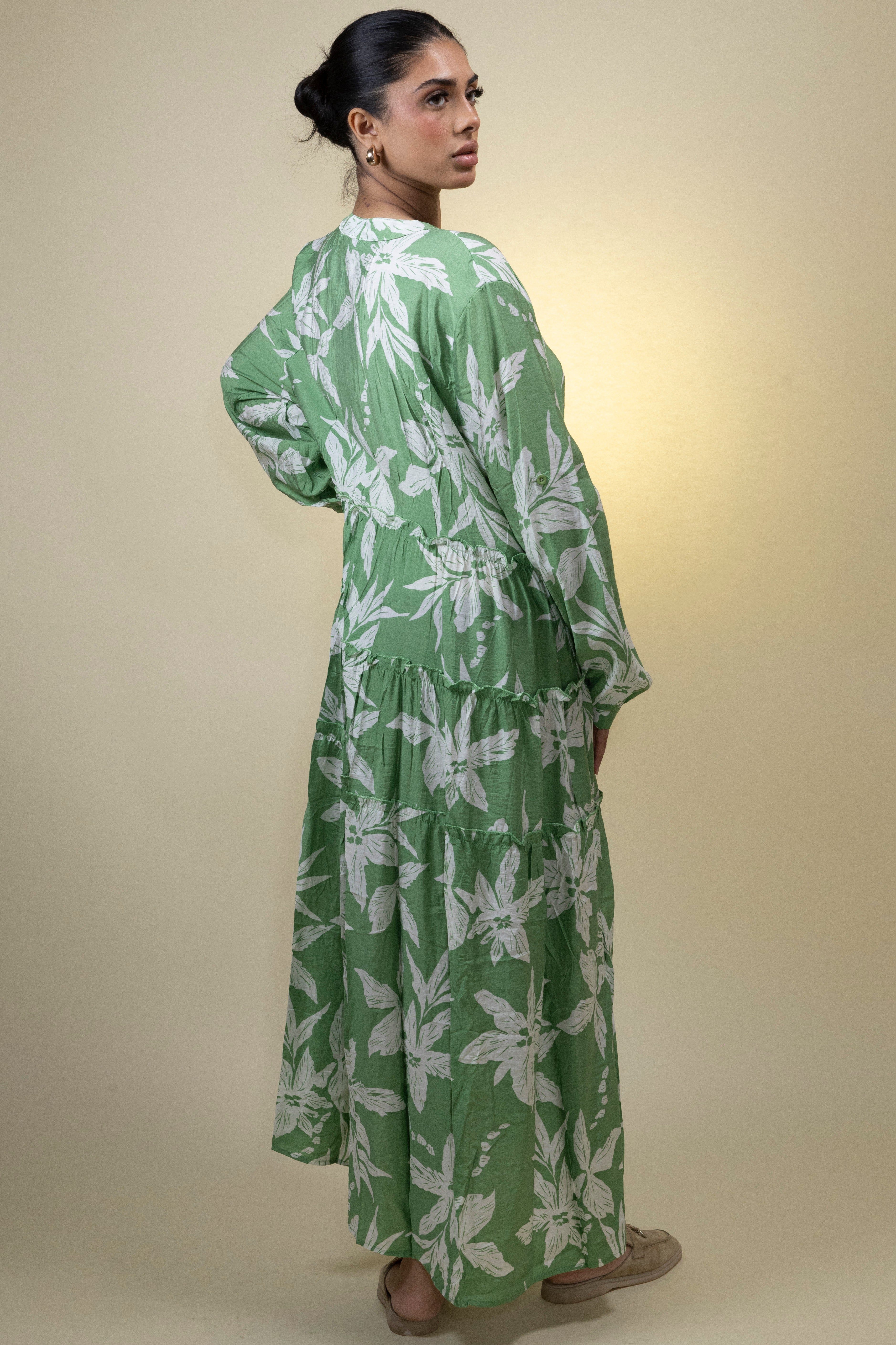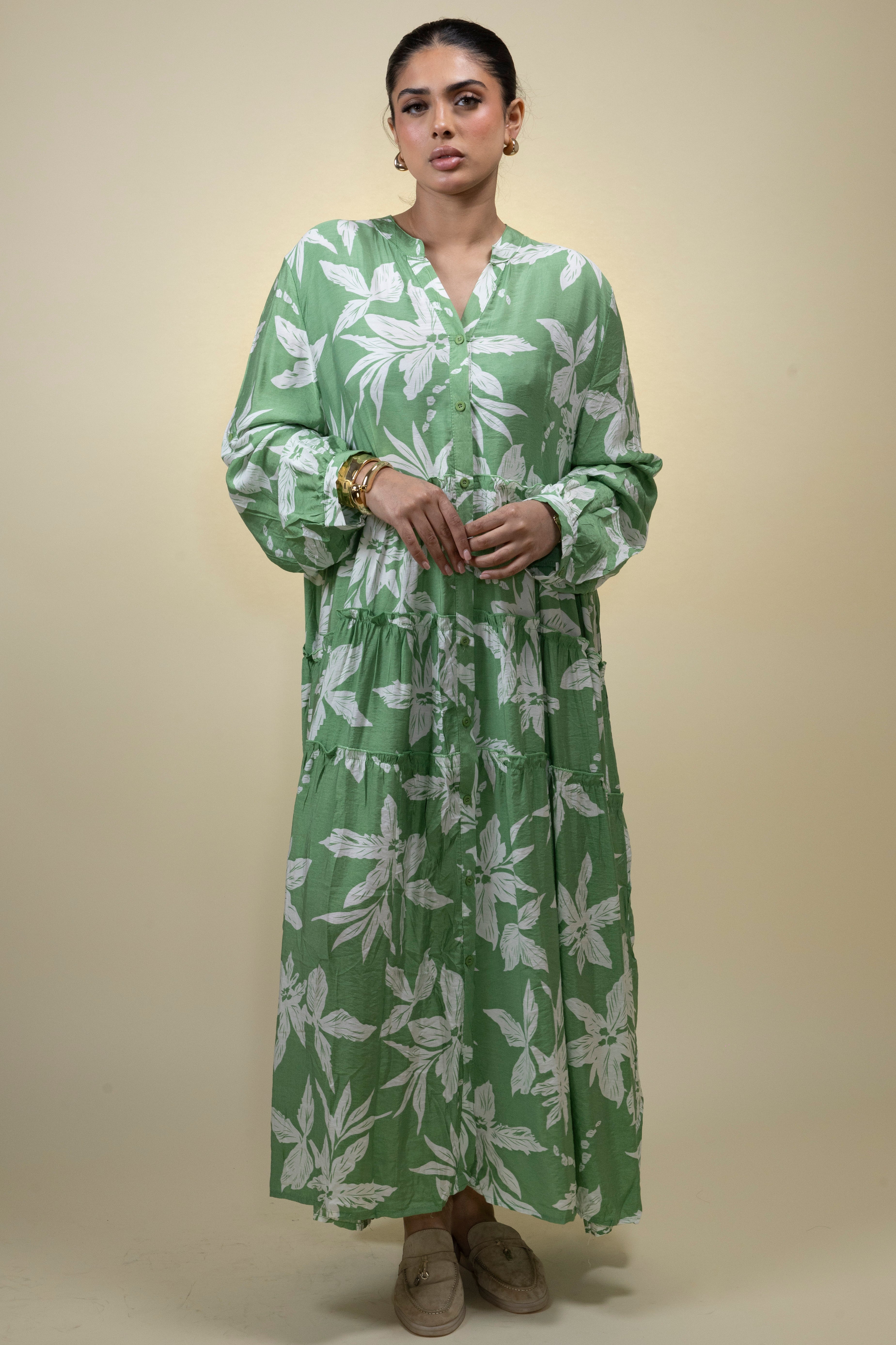 This green maxi dress brings a fresh, botanical elegance with its all-over white leaf print that evokes the calm of spring and the ease of coastal living. The soft, lightweight fabric drapes effortlessly down the body, falling into a full-length, tiered silhouette that adds both movement and shape. The V-neckline with a delicate button placket offers a clean, minimalist touch, while the gathered, full-length sleeves contribute to the overall airy and romantic aesthetic. Designed to be worn with ease, this dress is ideal for daytime events, holiday getaways, or a relaxed garden brunch. Its subtle texture and flow make it a staple for warm-weather styling.