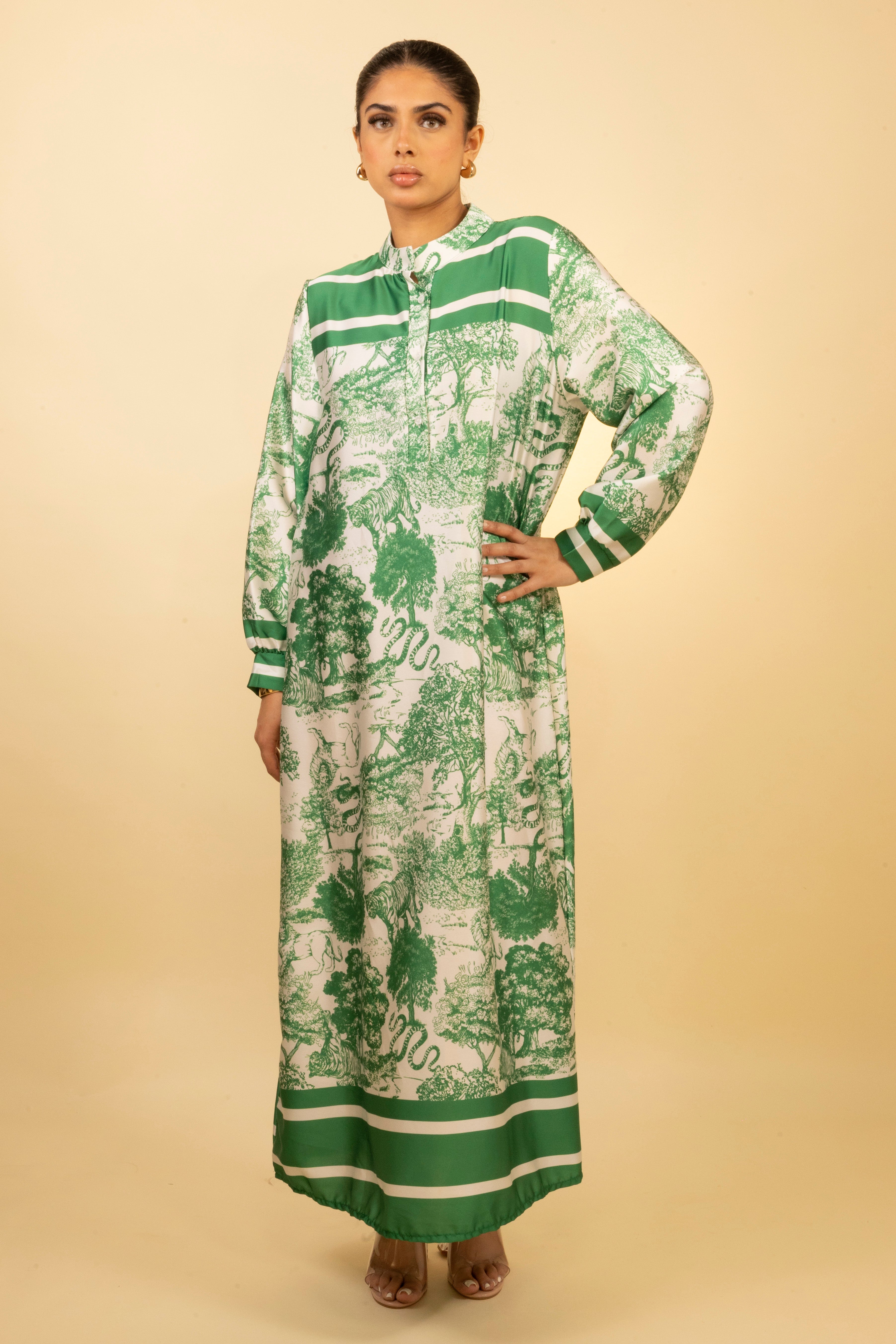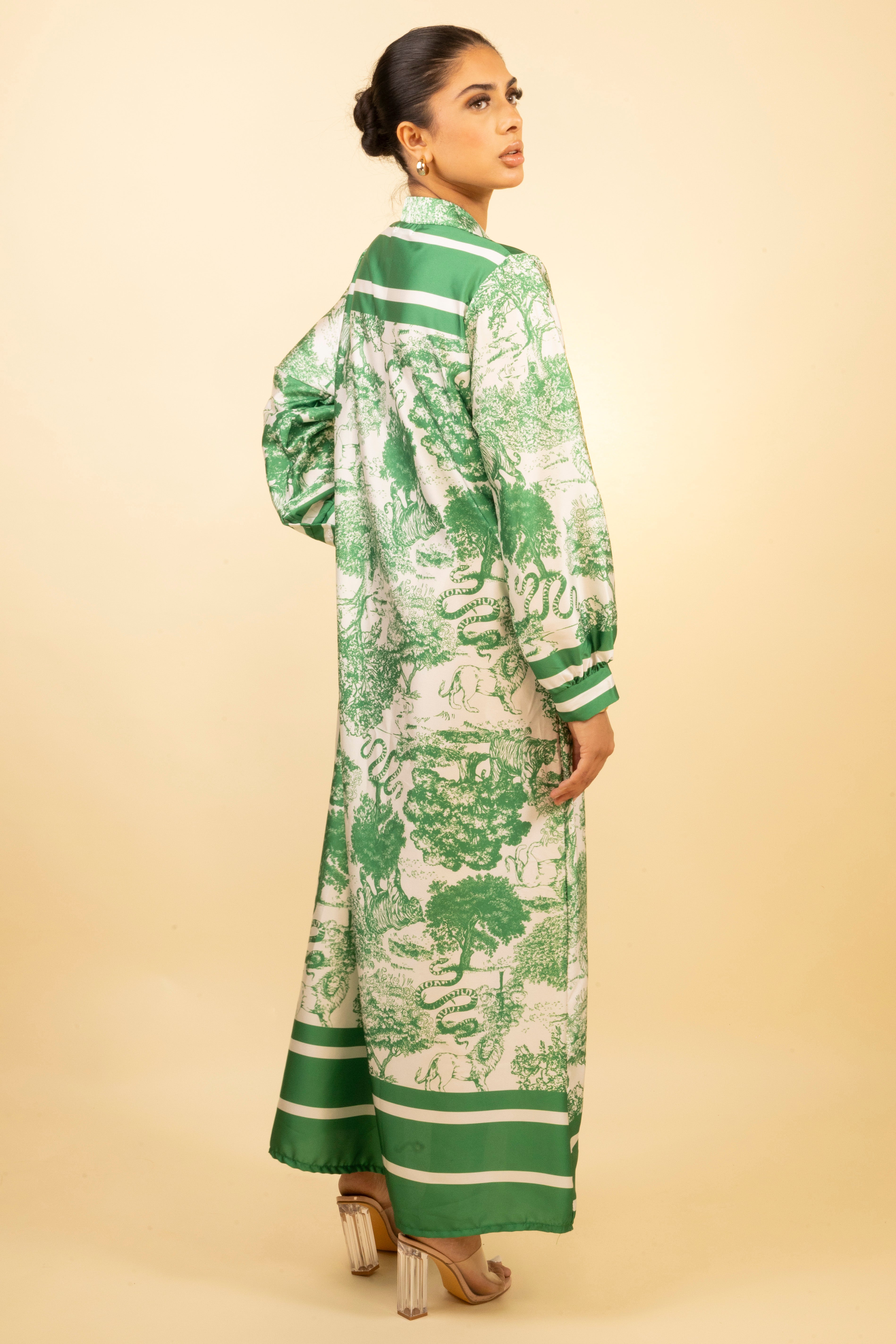 Bring a fresh burst of nature to your wardrobe with this green satin maxi dress, adorned in a lush toile-inspired jungle print. The elegant high collar and concealed button placket lend a clean, tailored look, while the relaxed silhouette ensures all-day comfort. Featuring forest green stripe detailing on the cuffs, shoulders, and hem, this dress strikes the perfect balance between classic charm and contemporary flair. A standout choice for effortless daytime elegance or dressed-up occasions.