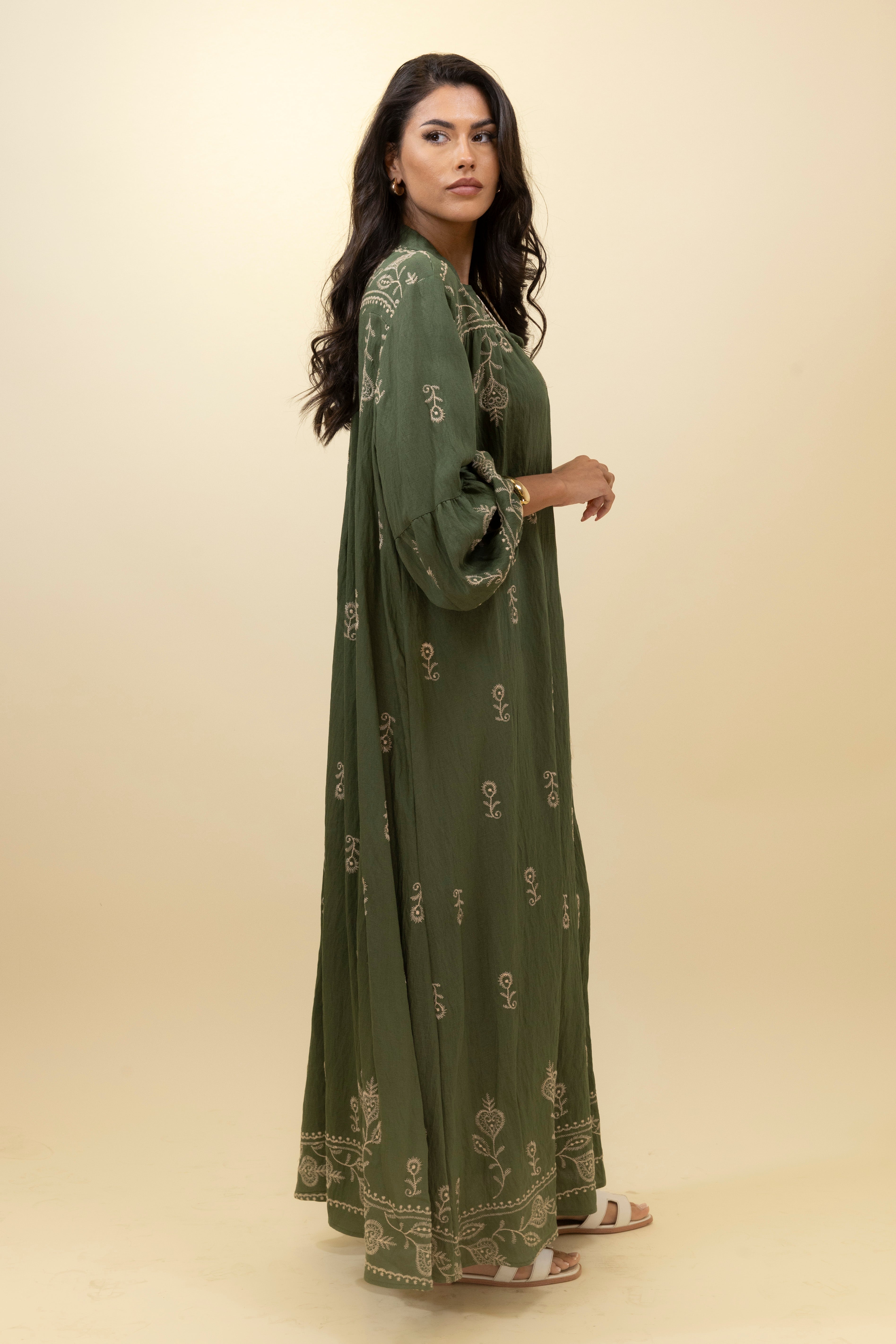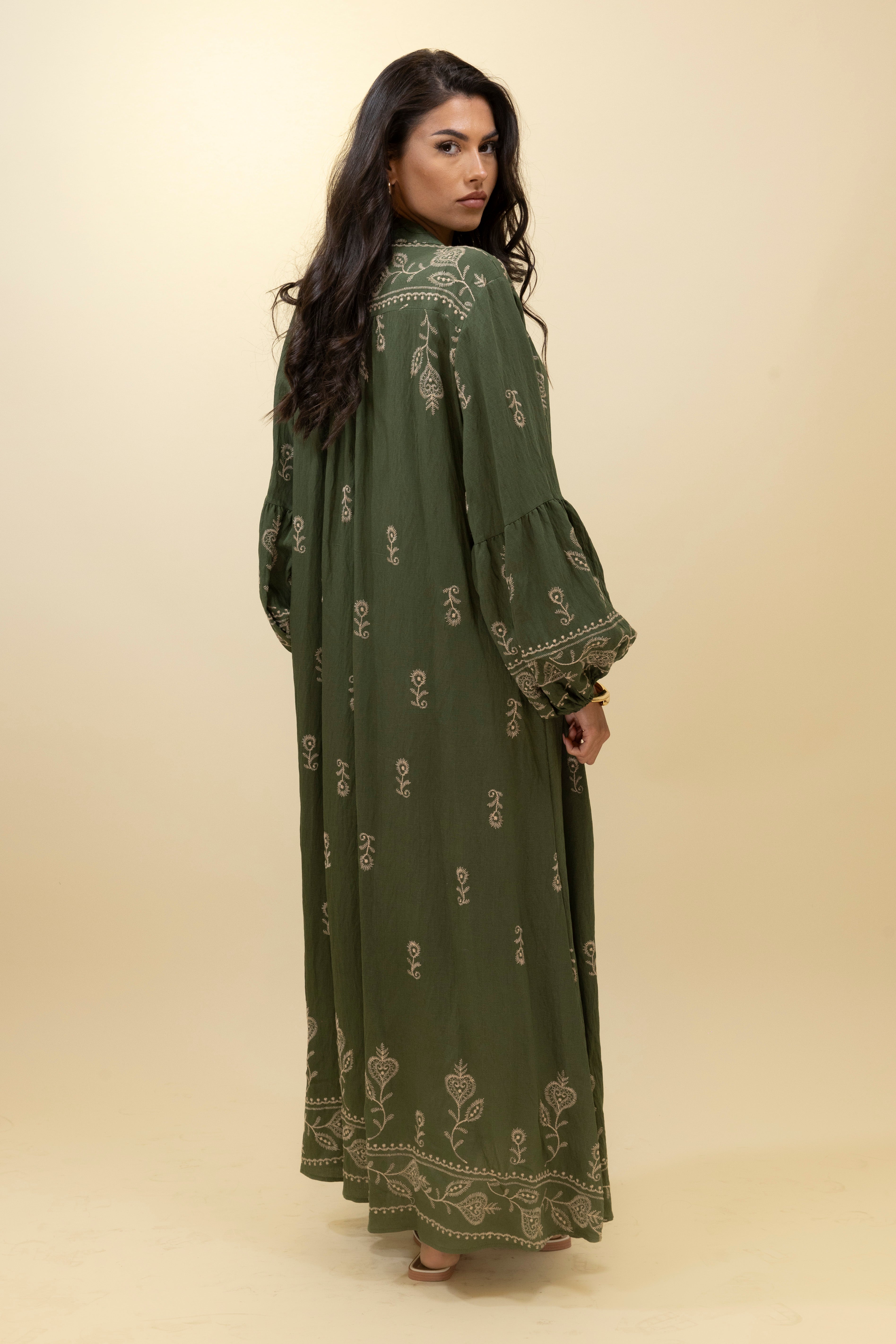 Laid-back yet elegant, this khaki maxi dress is infused with bohemian charm and artisanal detail. Made from a softly textured fabric, it features intricate cream embroidery in floral and paisley-inspired motifs across the bodice, sleeves, and hemline. The relaxed fit drapes naturally over the body, while voluminous sleeves gathered at the cuffs add a graceful, romantic touch. A tasseled tie at the neckline offers styling versatility—wear it open for a carefree look or tied for a touch of polish. Perfect for sunny days, travel, or effortless everyday wear, this piece radiates natural beauty and ease.