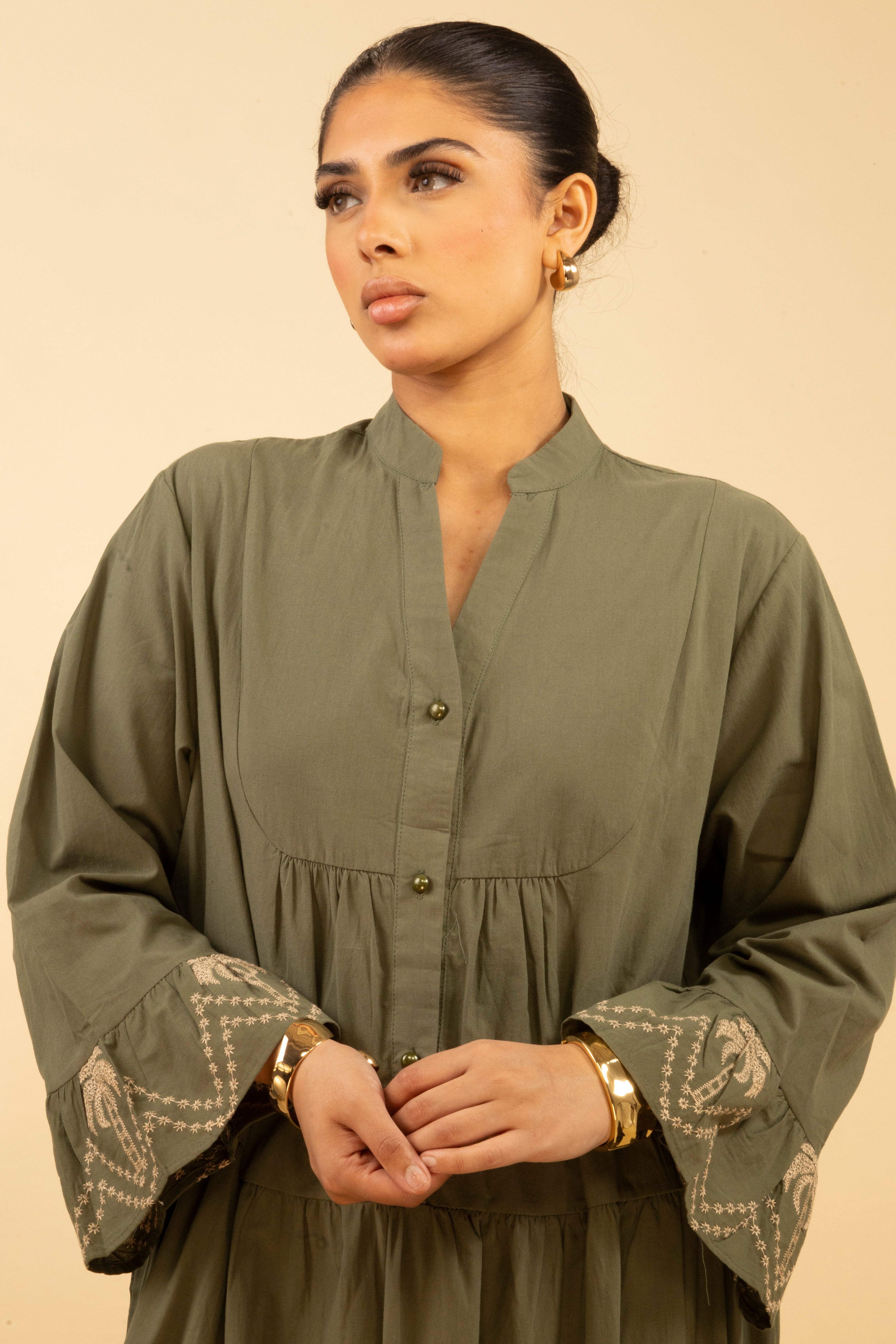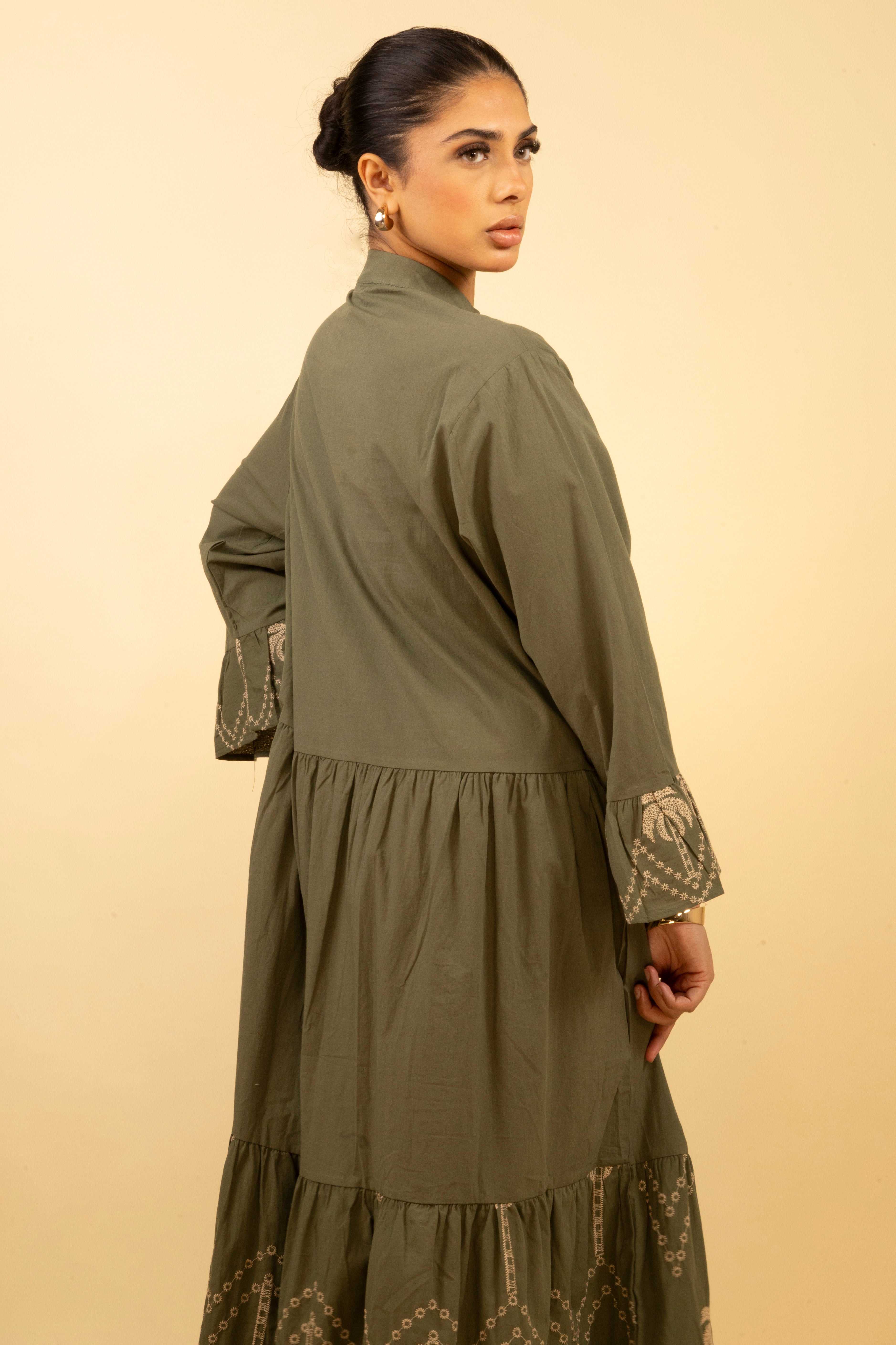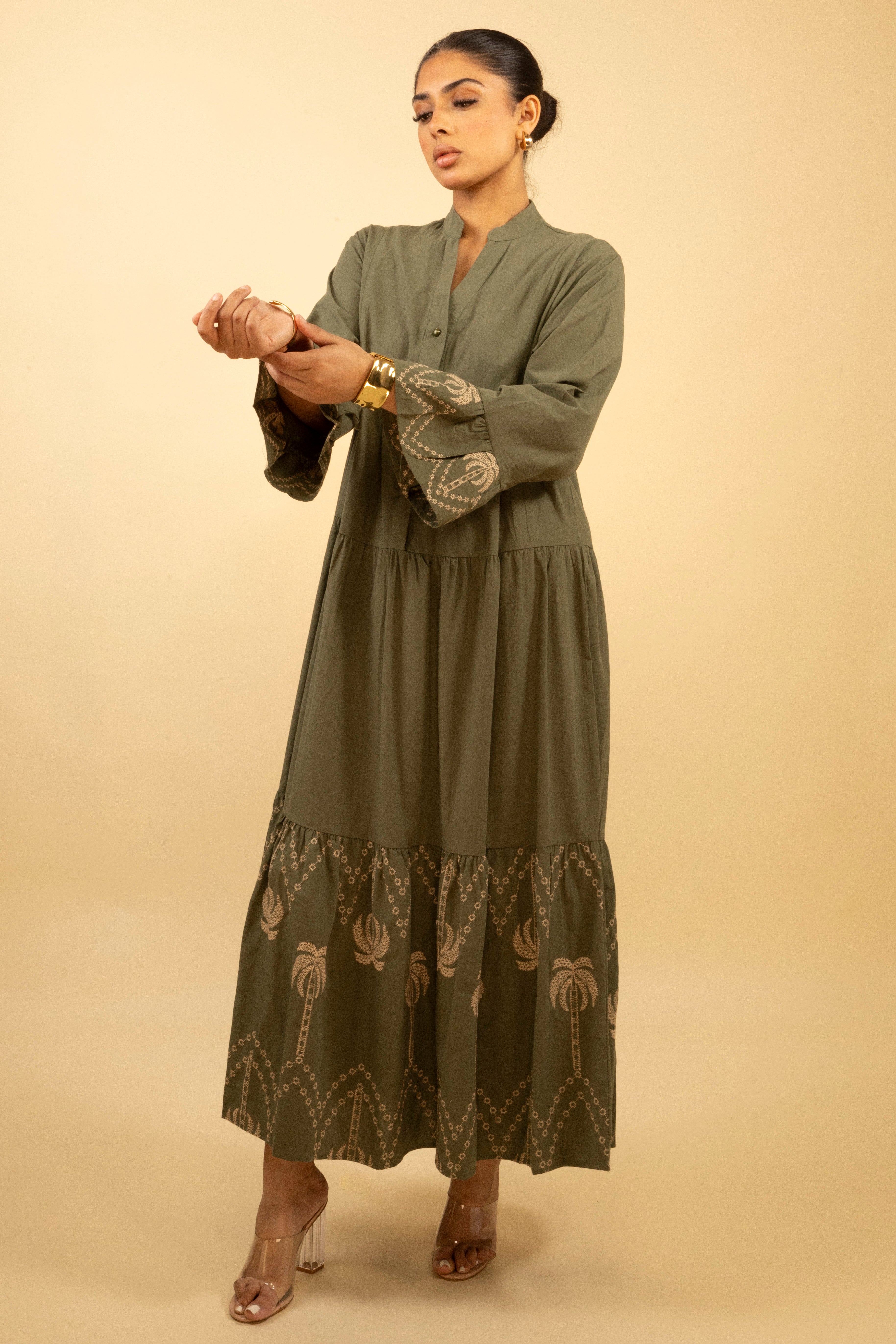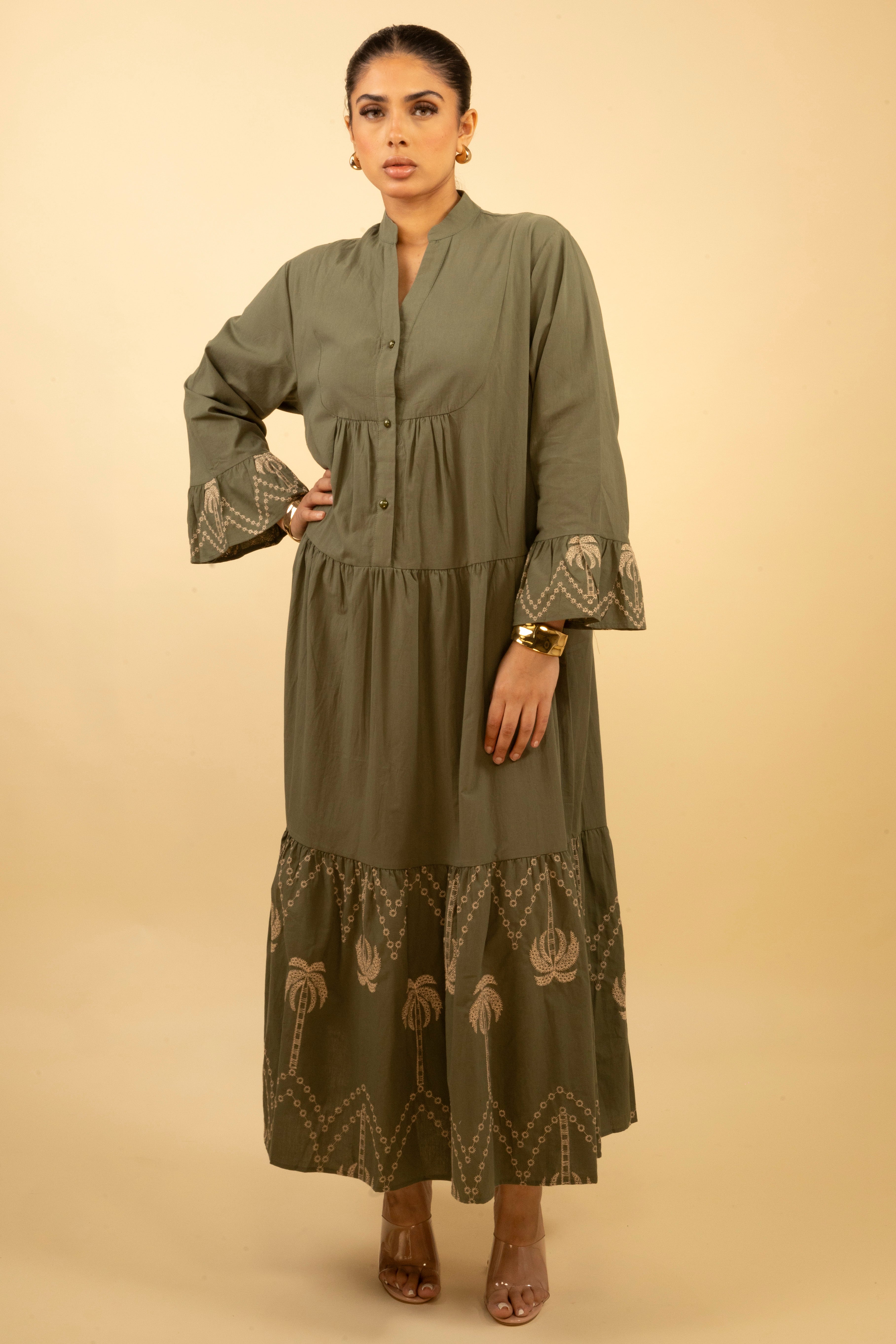Rooted in natural tones and crafted with thoughtful detail, this khaki maxi dress delivers laid-back elegance with a modern twist. The breathable cotton-blend fabric is shaped into a relaxed tiered silhouette, offering graceful flow and ease of wear. Featuring a soft stand collar and button-down neckline, it pairs structure with femininity. Embroidered palm and geometric motifs embellish the fluted sleeves and hem, bringing artisanal flair and a hint of wanderlust. Ideal for spring outings, summer travels, or everyday styling with a refined edge, this dress is as versatile as it is effortlessly stylish.