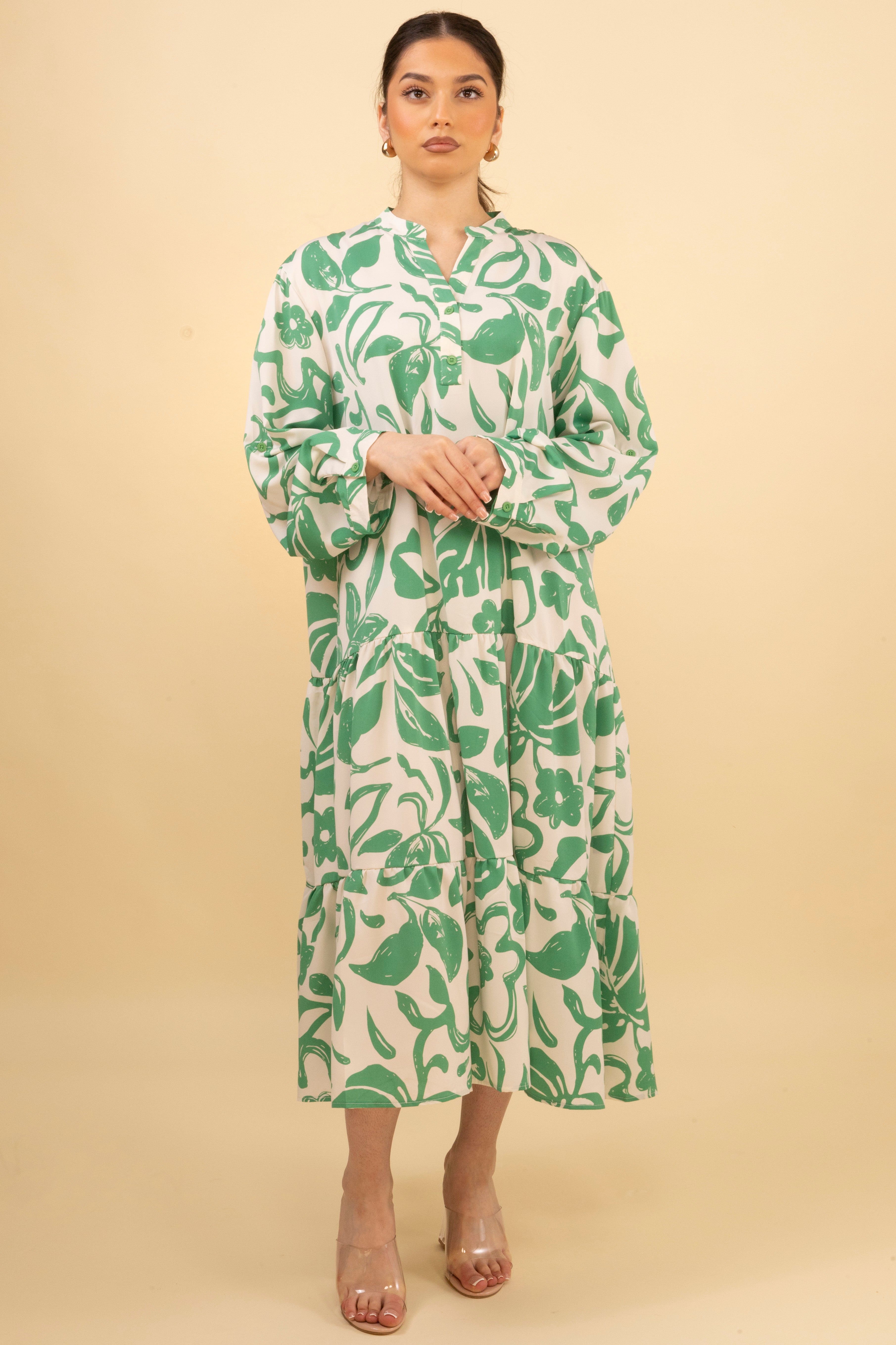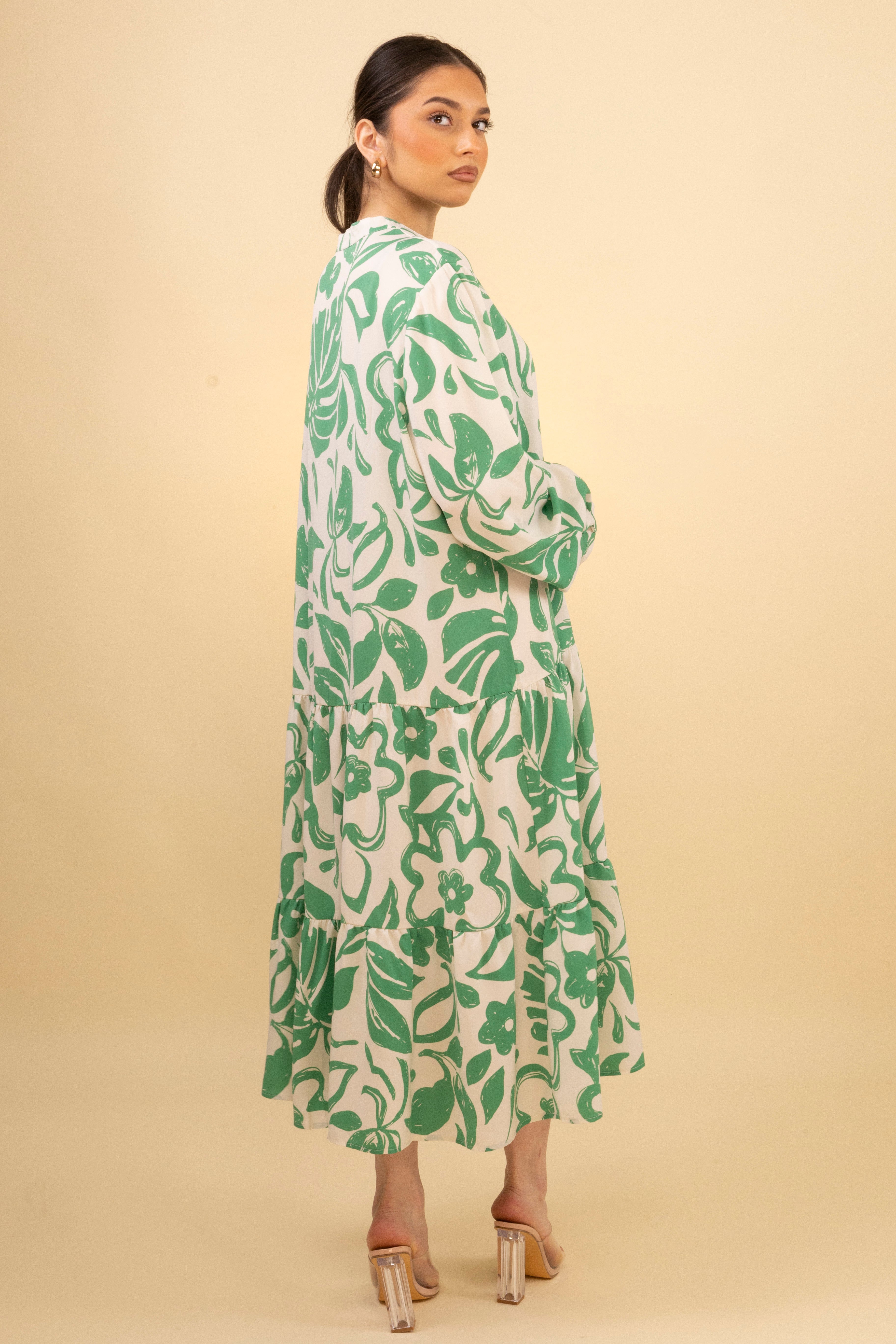 The design features a notch neckline and soft collar detail, adding a touch of polish to the otherwise laid-back fit. Long sleeves with gently elasticated cuffs provide balance and comfort, while the tiered midi-length skirt creates beautiful movement and a floaty feel. The length makes it perfect for a casual daytime look or an elevated brunch outfit when paired with heels.