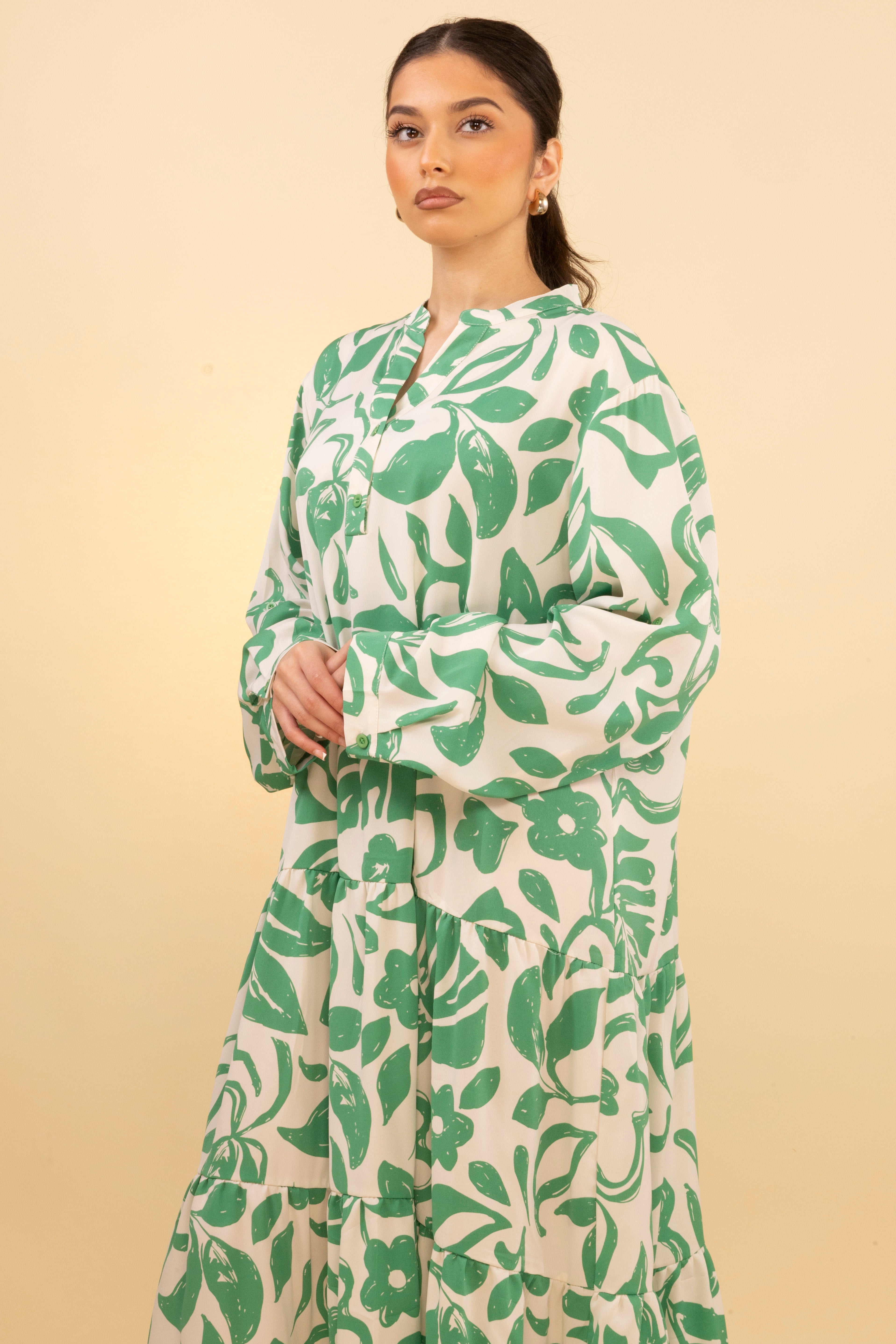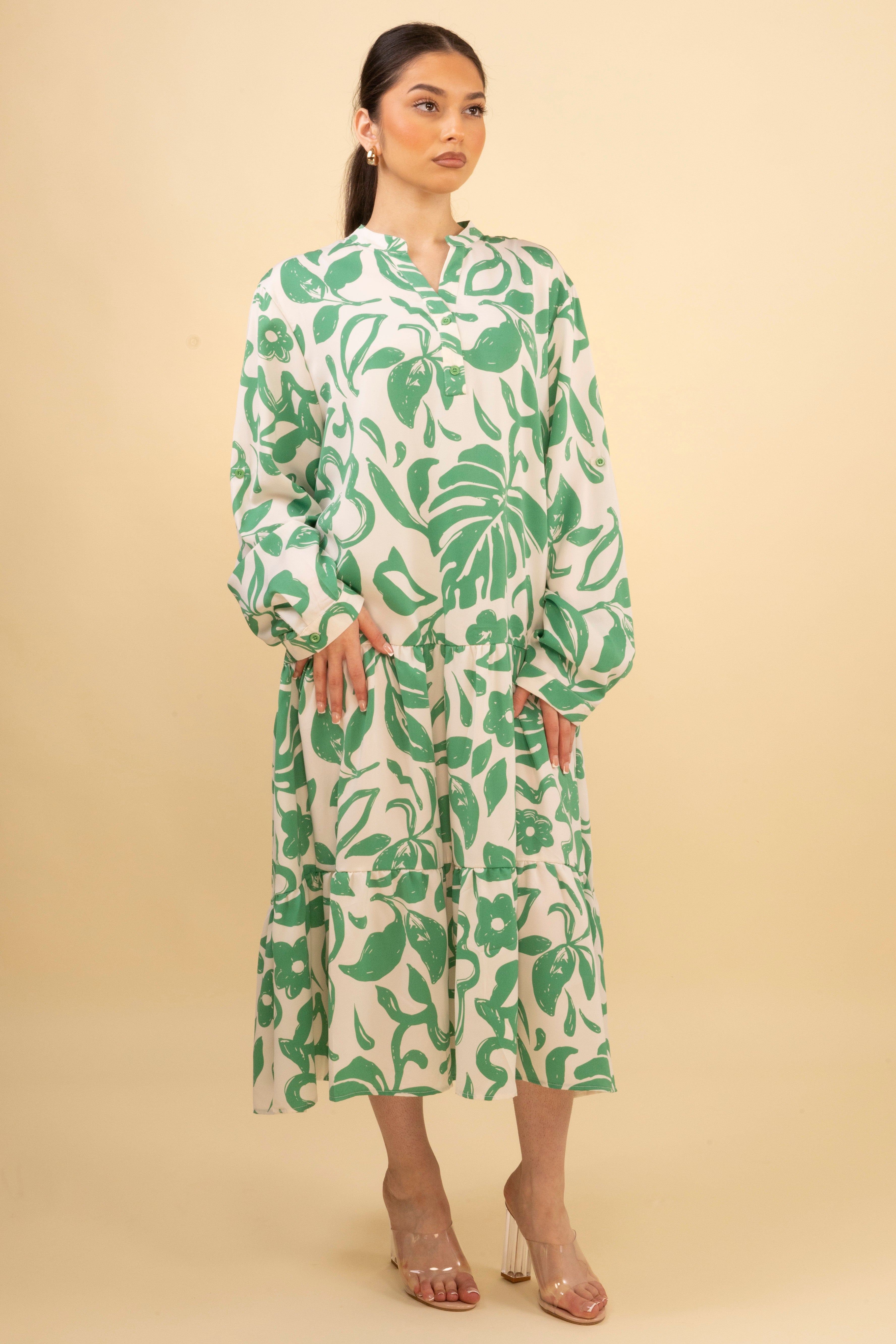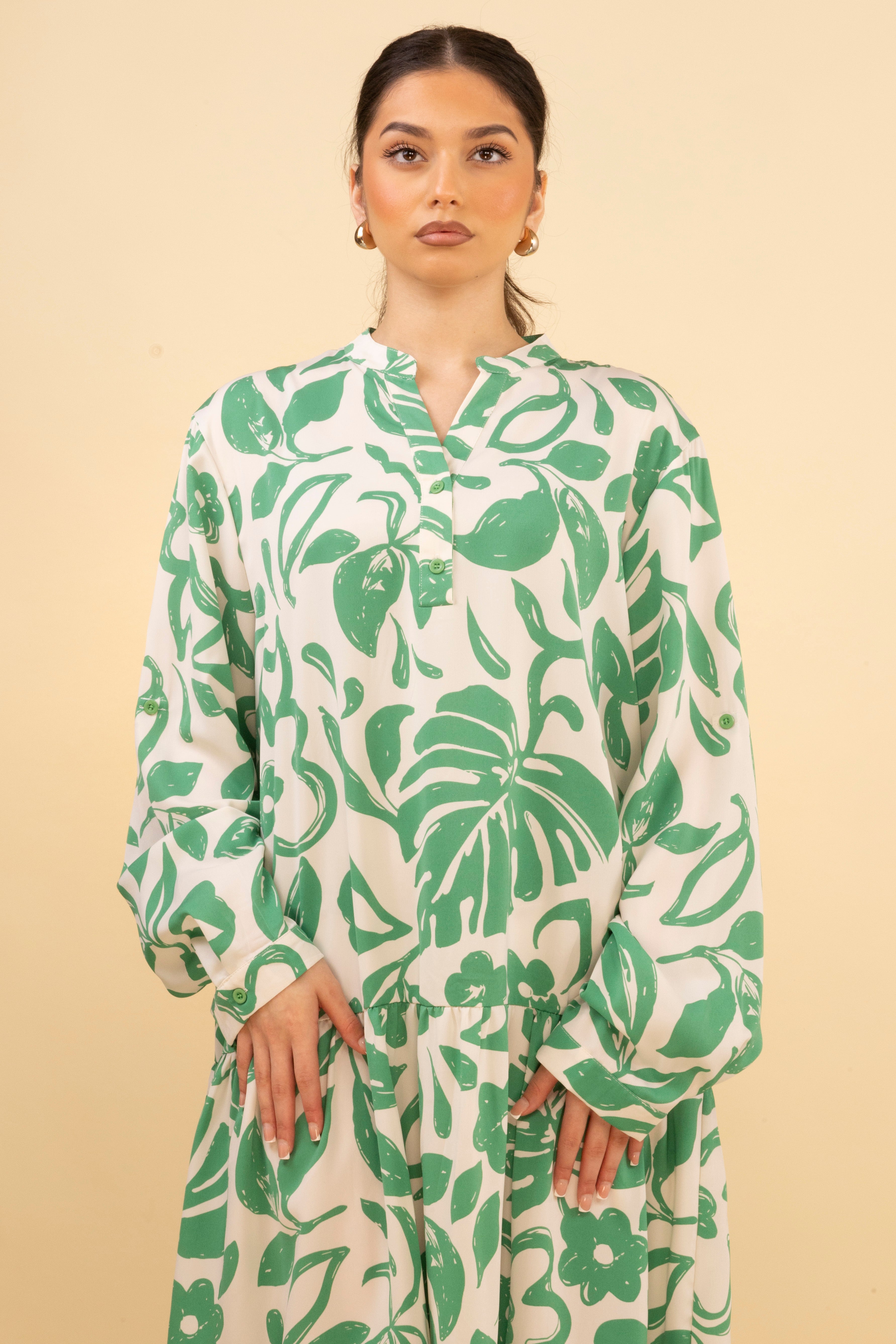 Refresh your wardrobe with this mint green and cream tropical print midi dress — the perfect blend of playful charm and effortless elegance. The vibrant mint botanical print pops against the soft cream base, creating a standout piece that’s ideal for spring and summer days. Crafted from a light, breathable fabric, this dress offers a relaxed, flowy silhouette that flatters all body shapes.