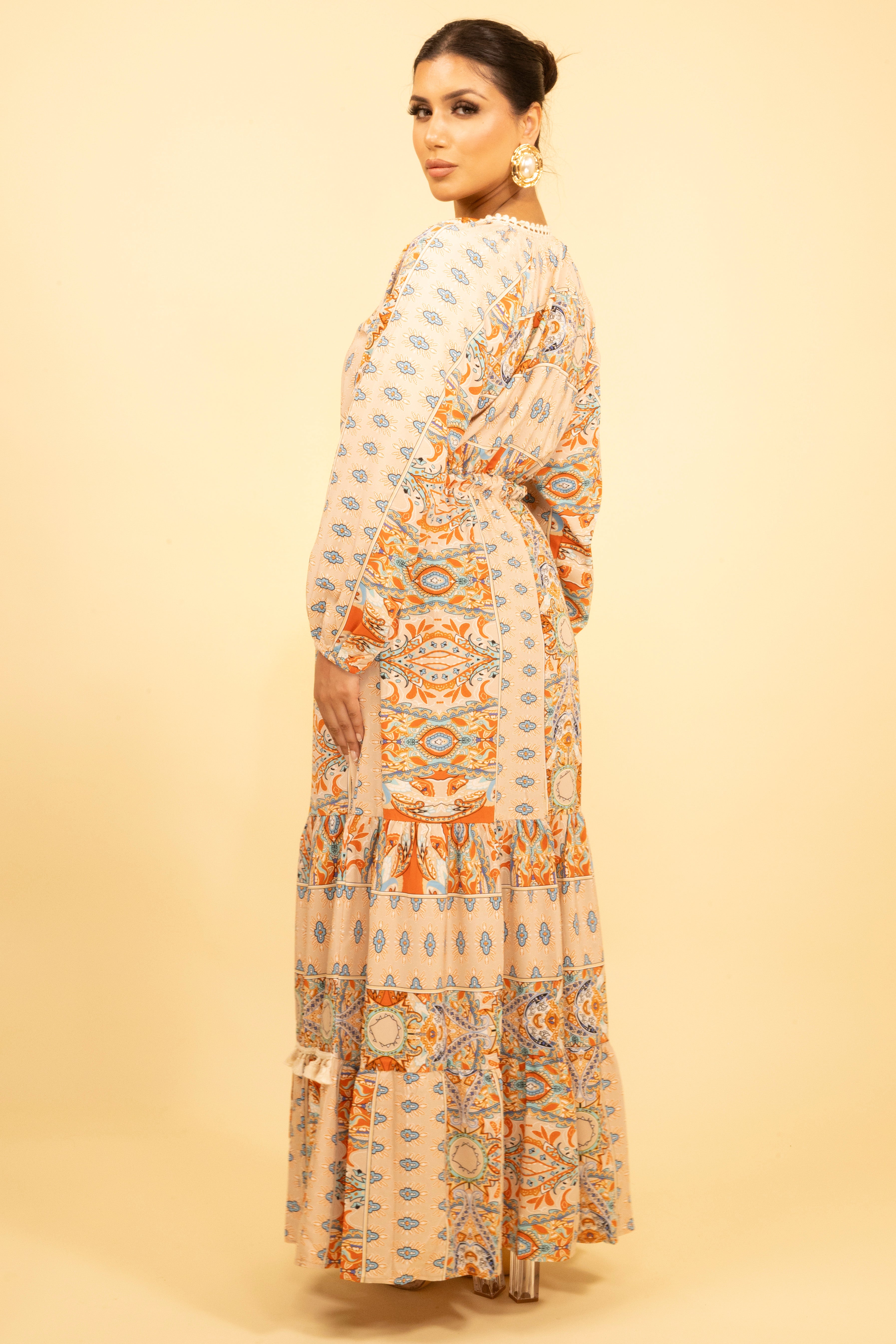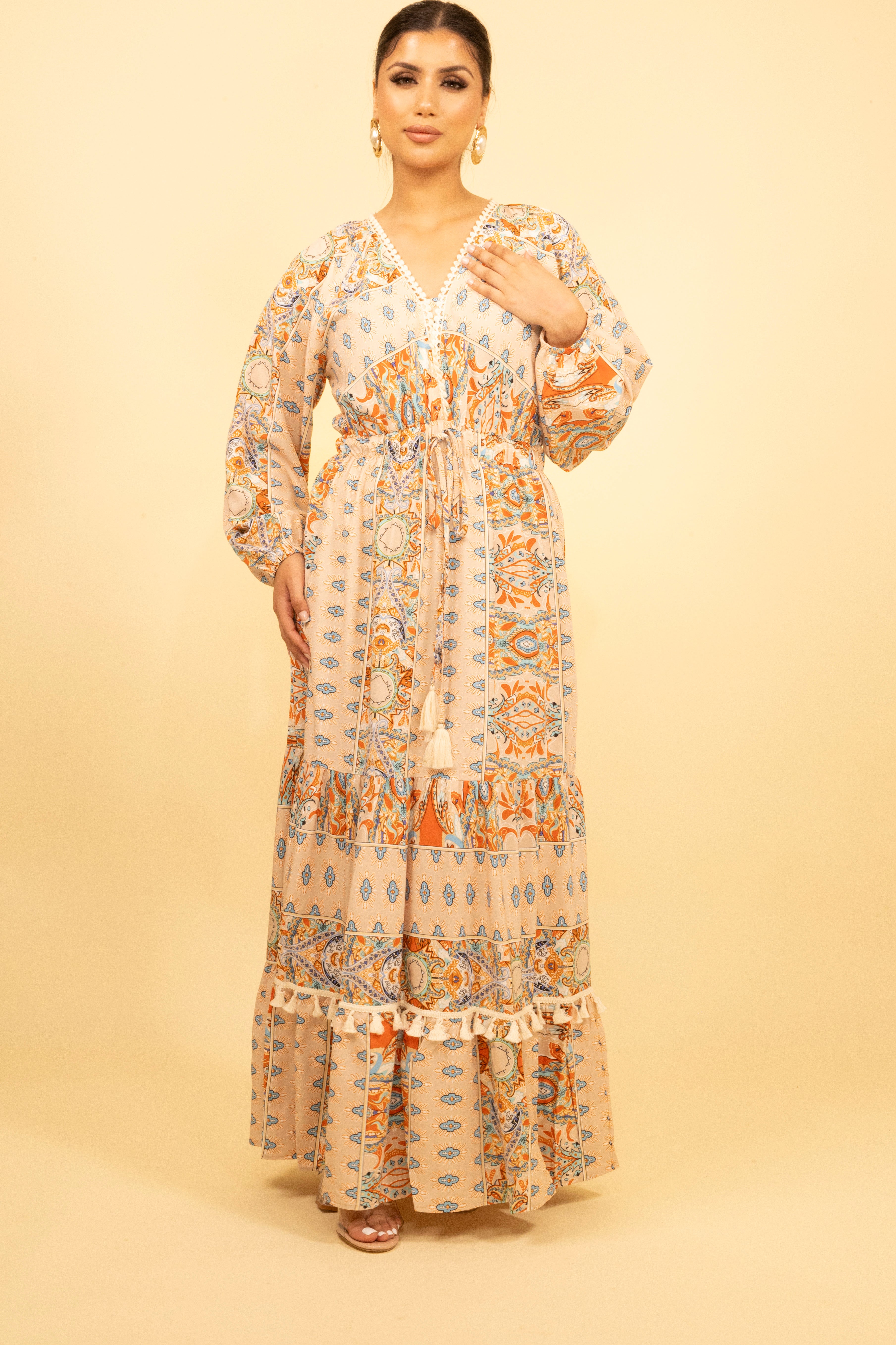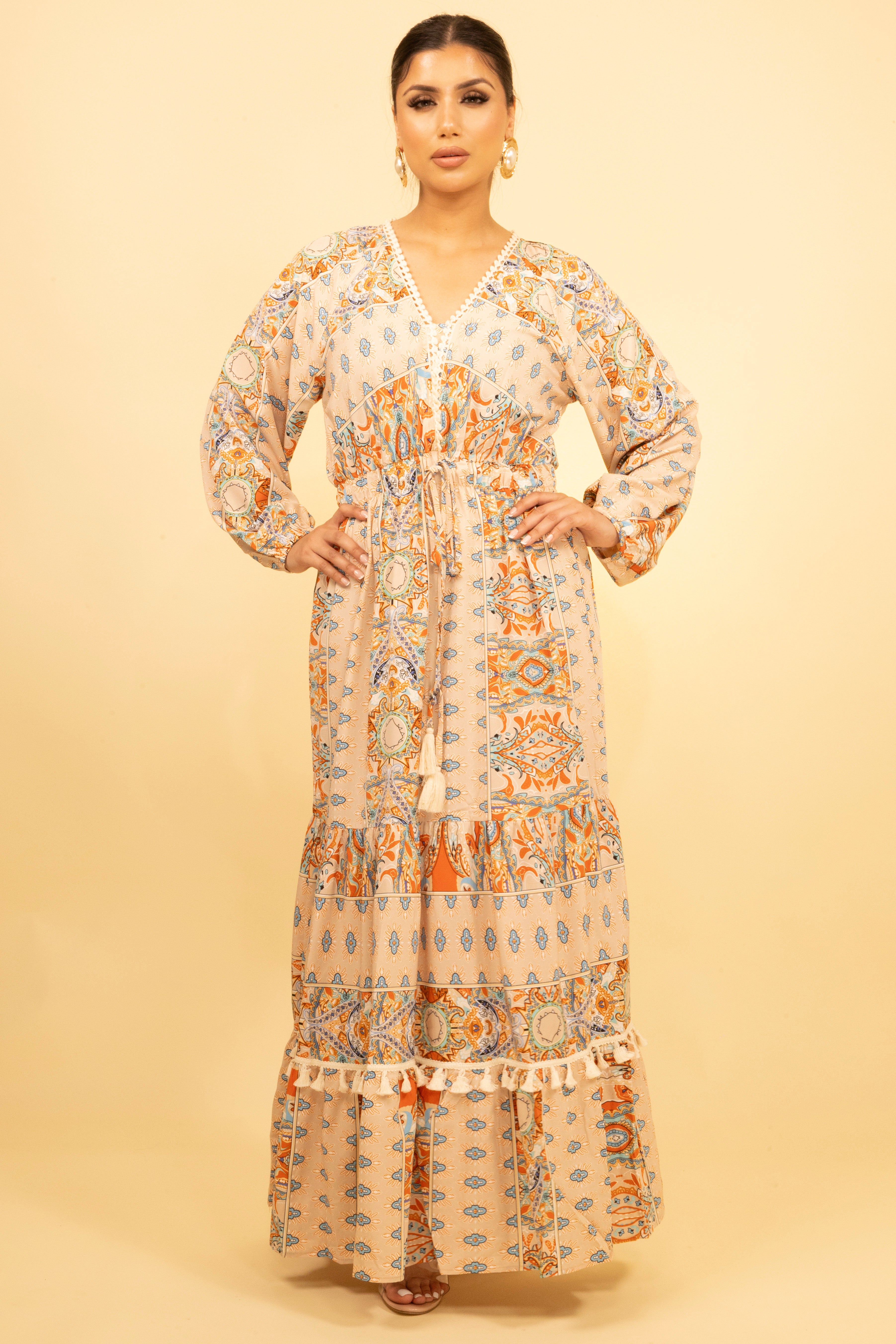 Tiered panelling and tassel accents at the waist create a flattering drape that moves beautifully as you walk. Perfect for holiday getaways or warm-weather events, it pairs effortlessly with gold accessories and strappy sandals for a chic, put-together look.