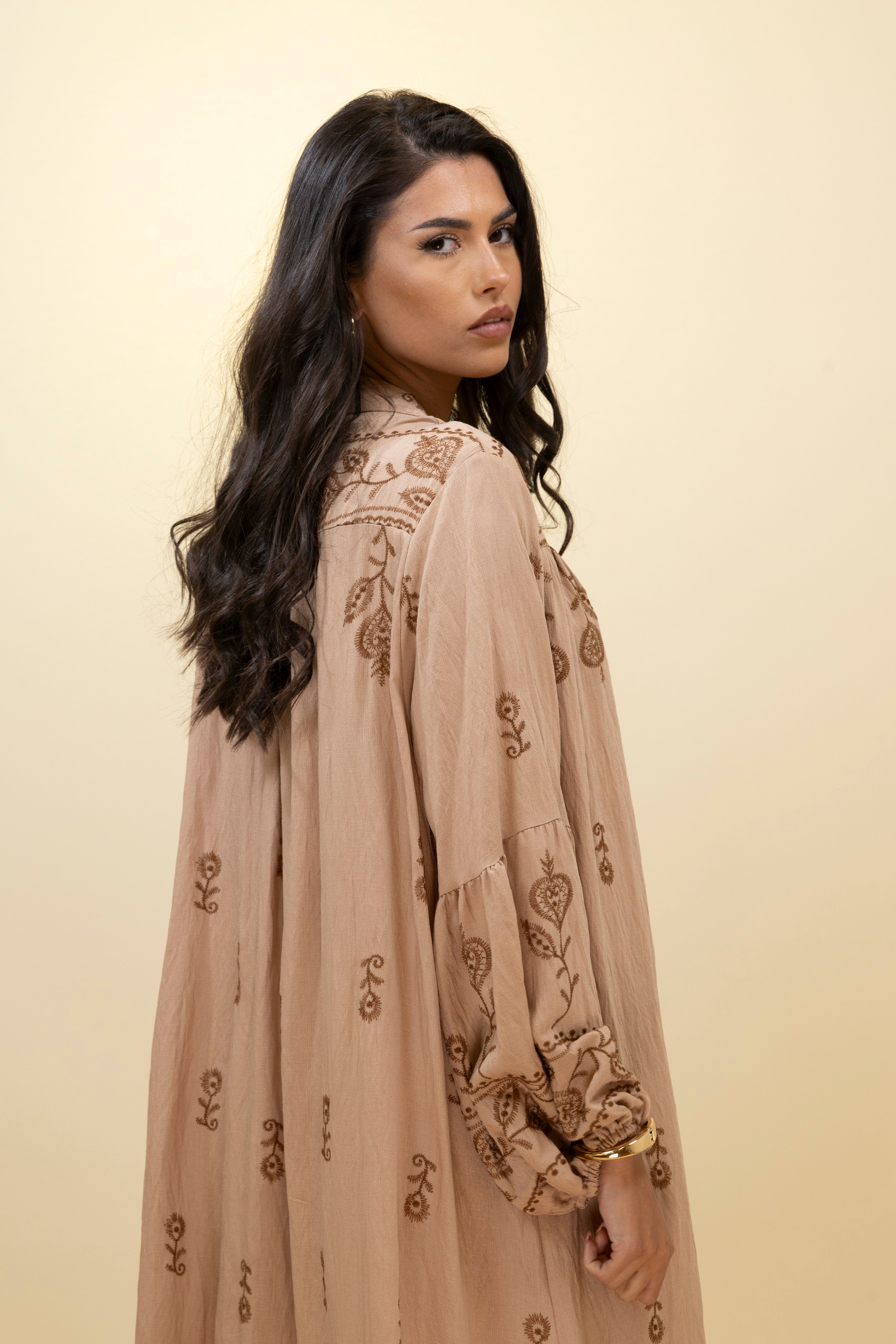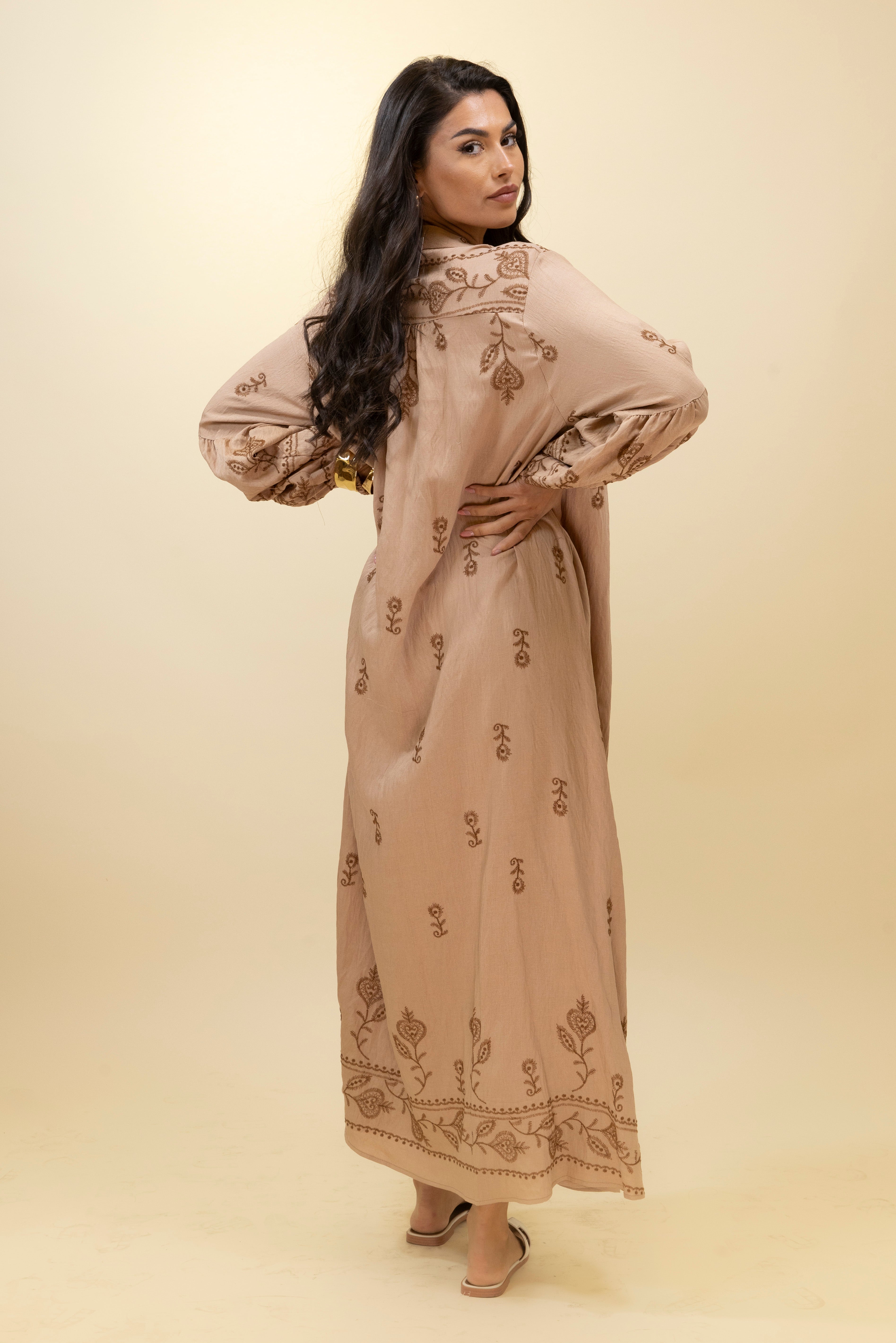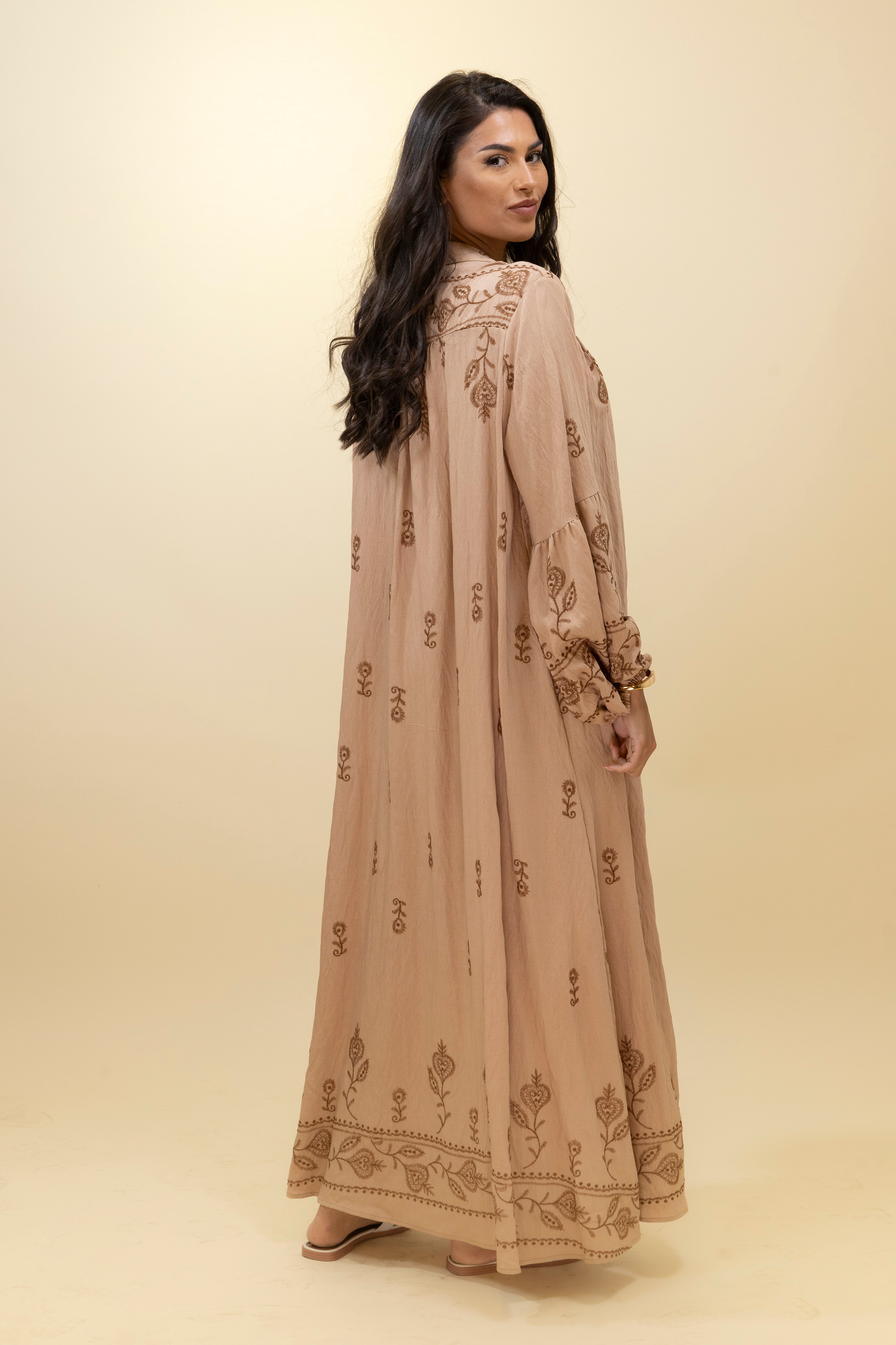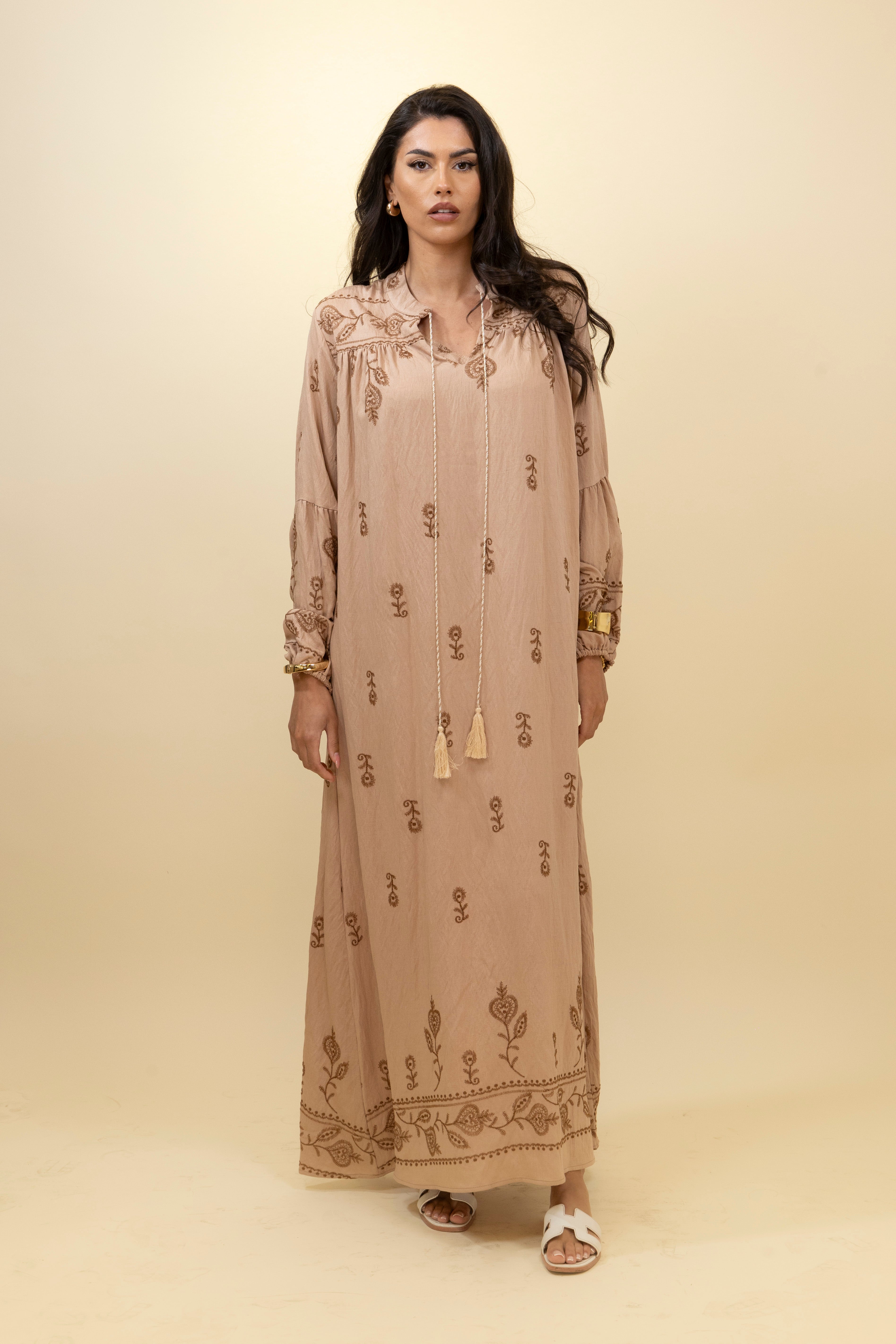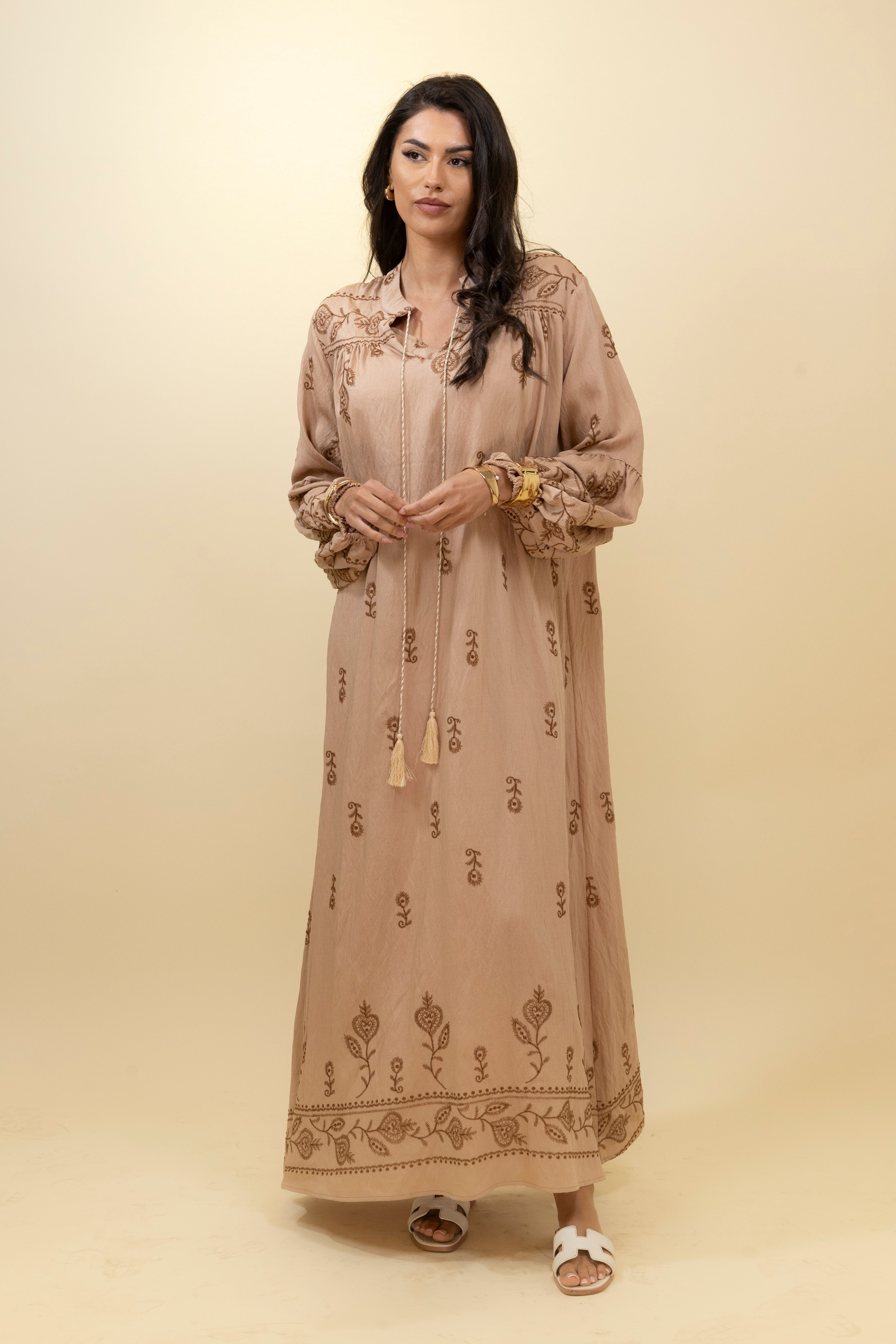 Chic and effortlessly bohemian, this taupe maxi dress blends soft structure with rich detail. Crafted from a lightweight, textured fabric, it features warm-toned embroidery in delicate floral motifs across the chest, sleeves, and hemline, giving it an artisanal, handcrafted feel. The relaxed, straight-cut silhouette drapes gracefully over the body, while the gathered neckline is finished with a long tasseled tie that adds movement and character. Voluminous sleeves with gathered cuffs enhance the laid-back elegance of the piece, making it ideal for sunny getaways, casual brunches, or relaxed everyday style.