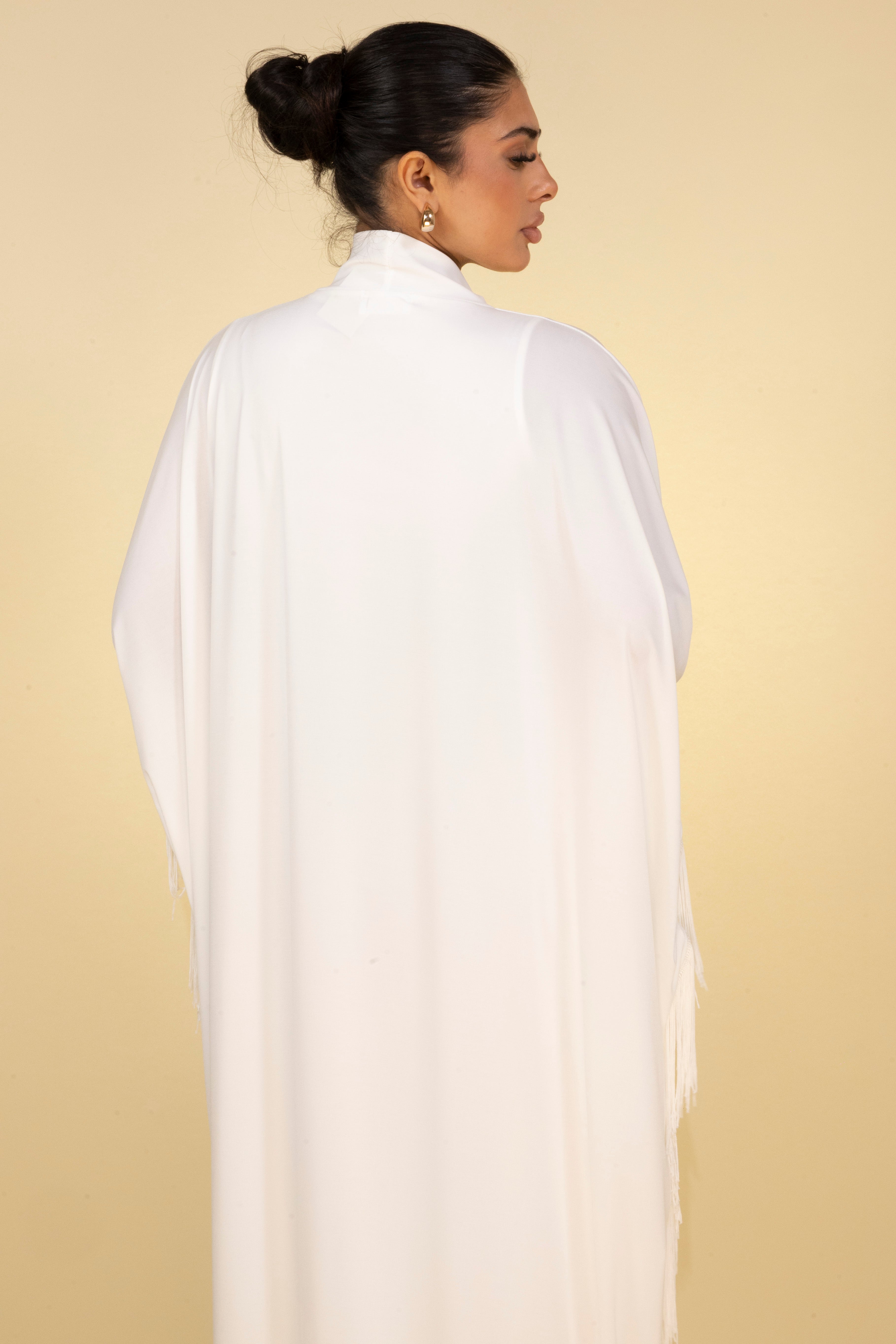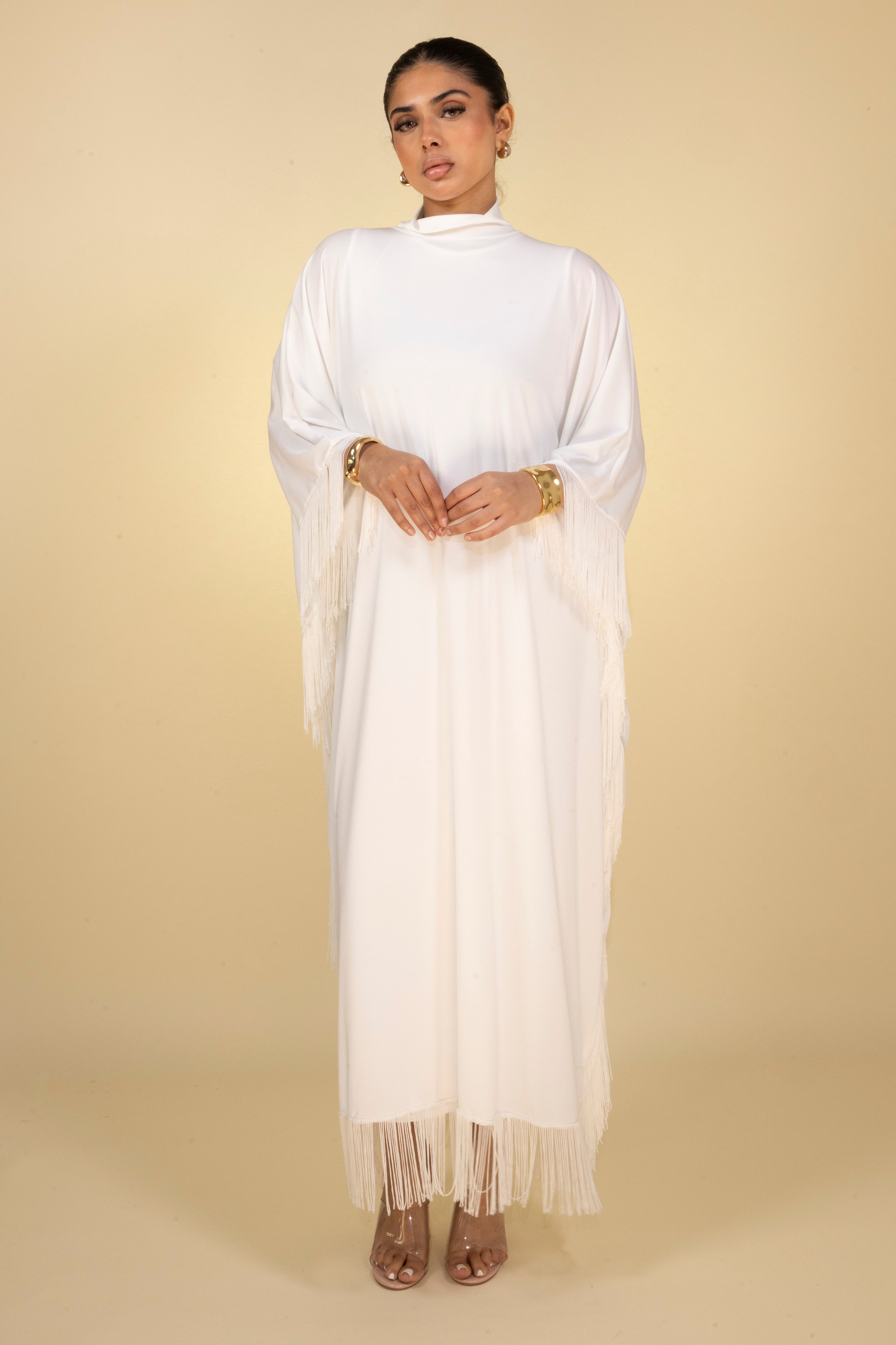 Radiate timeless elegance with this stunning white maxi dress, designed to make an impression. The dress features a graceful high neckline and relaxed, flowing silhouette that drapes effortlessly for ultimate sophistication. Wide batwing sleeves and hemline are adorned with intricate fringe details, adding a touch of playful movement and glamour to this minimalistic design.