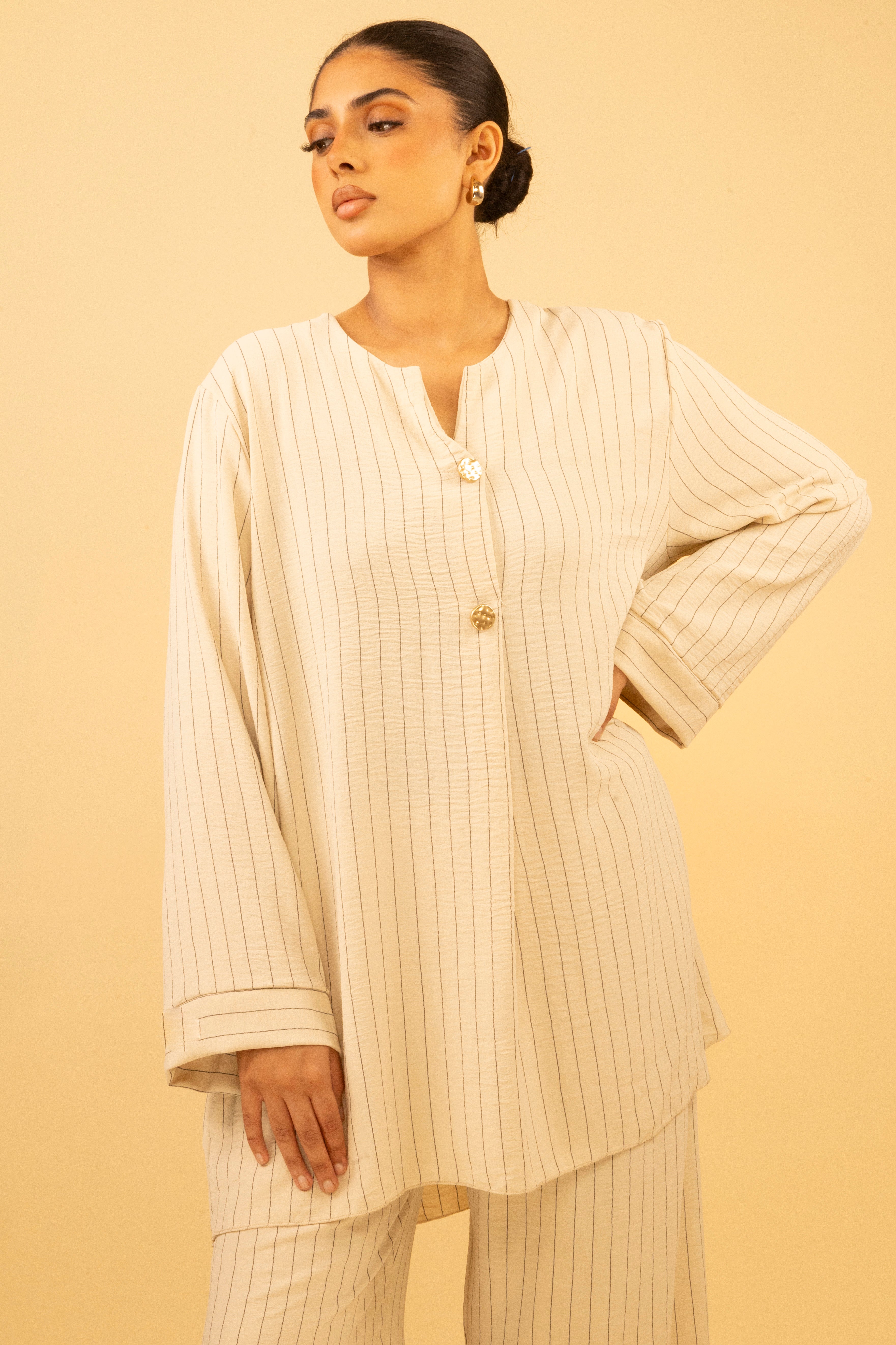 This beige co-ord set is a timeless choice for your wardrobe, crafted from lightweight fabric with subtle pinstripes for an elevated touch. The longline top features a round neckline, statement gold buttons, and wide sleeves for effortless elegance and all-day comfort.