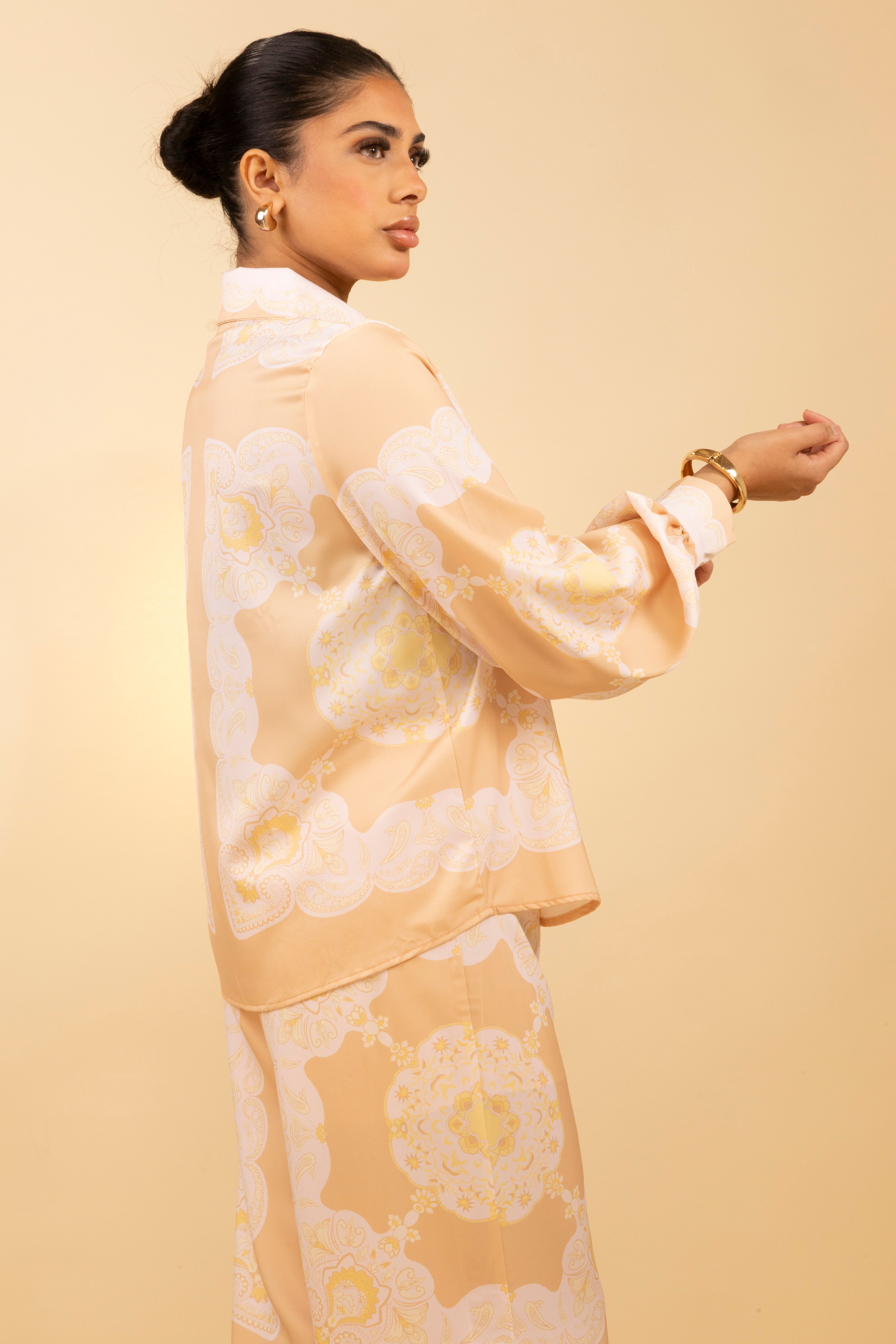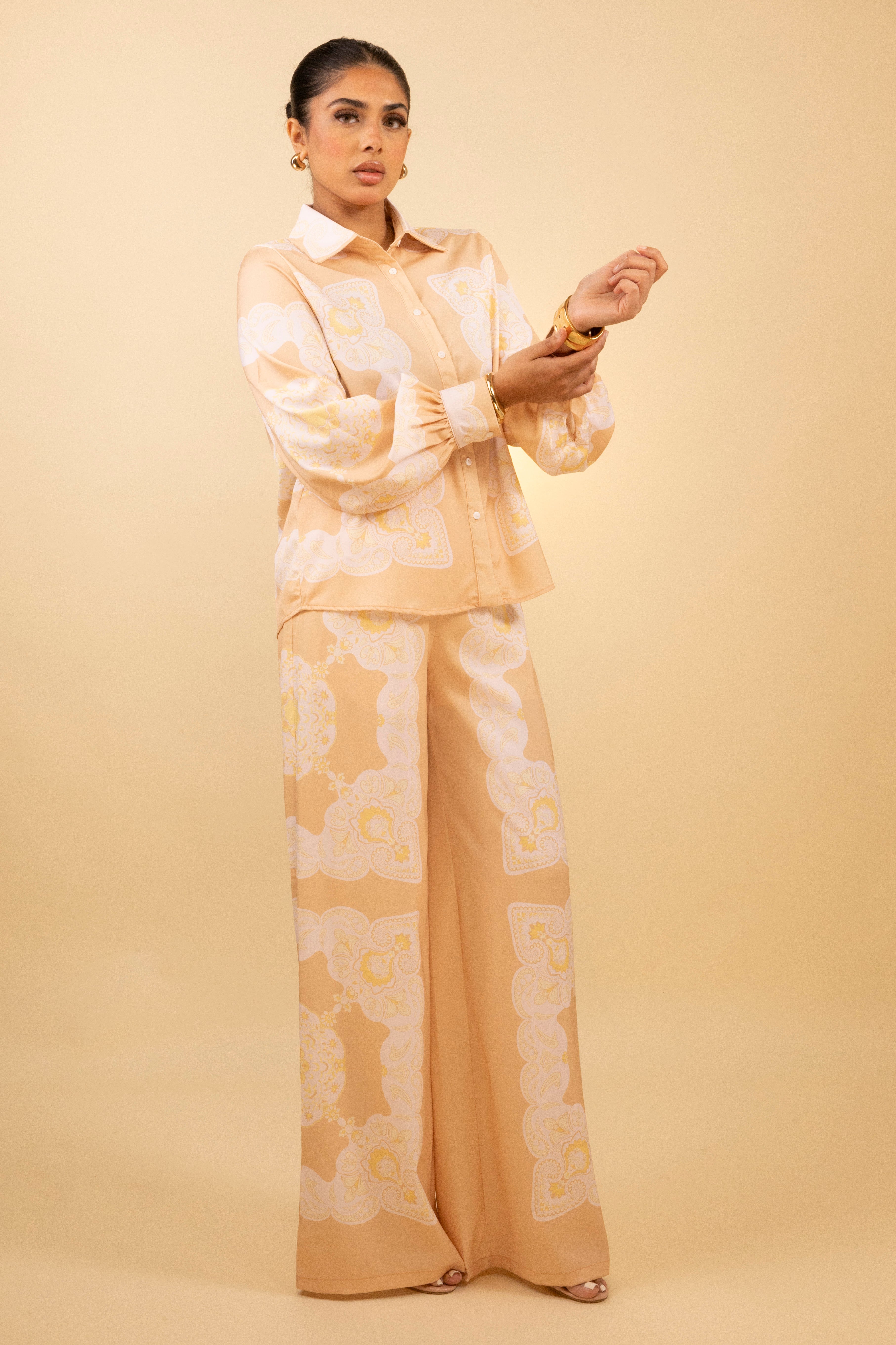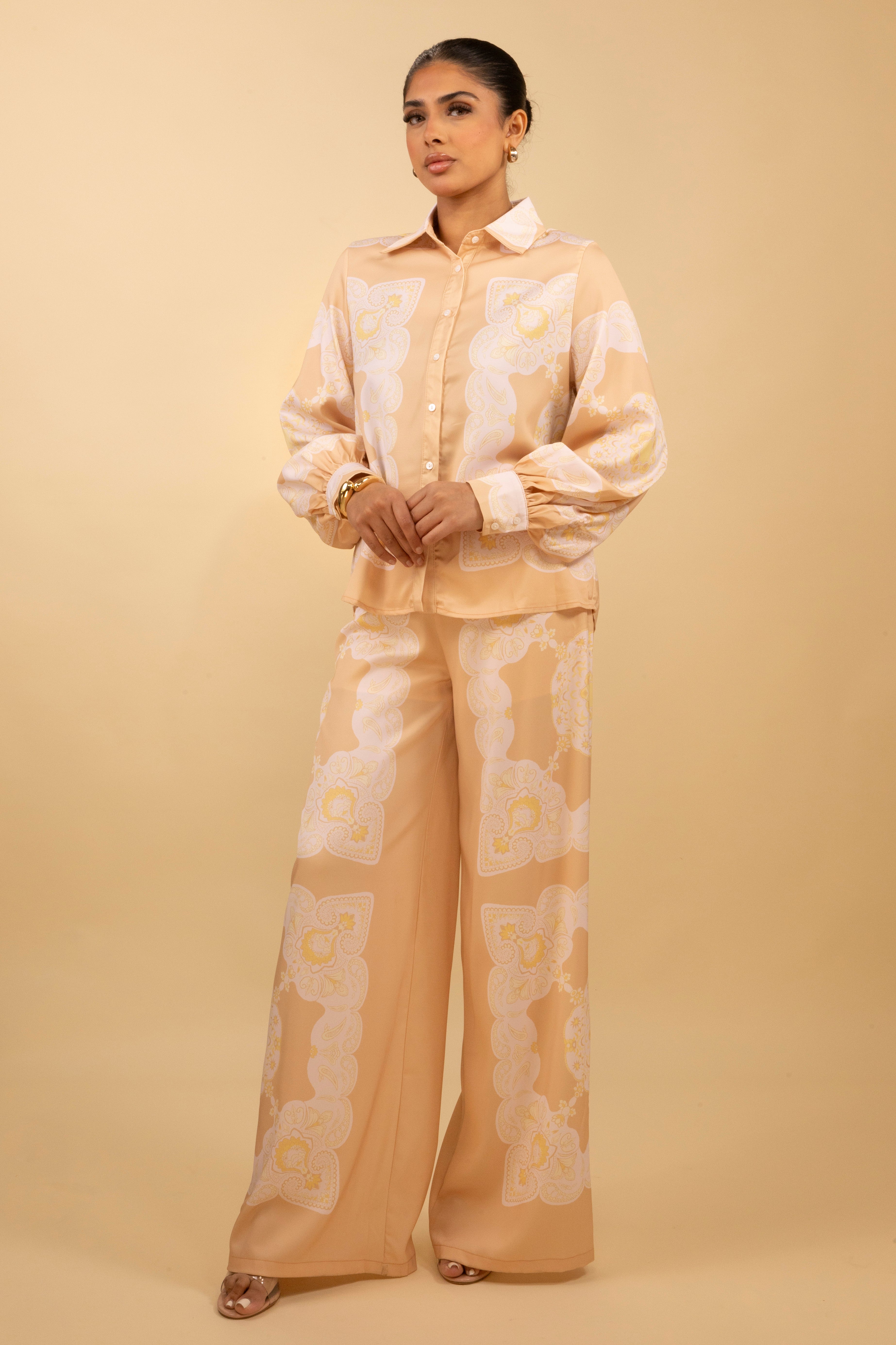 This beige co-ord set brings soft elegance with a polished finish. The satin-style fabric features a delicate white and gold scarf print, adding a subtle vintage feel. The button-down shirt has a classic collar and gently puffed sleeves, paired with wide-leg trousers that offer a relaxed yet elevated silhouette. Perfect for smart daytime dressing or easy glam evenings.