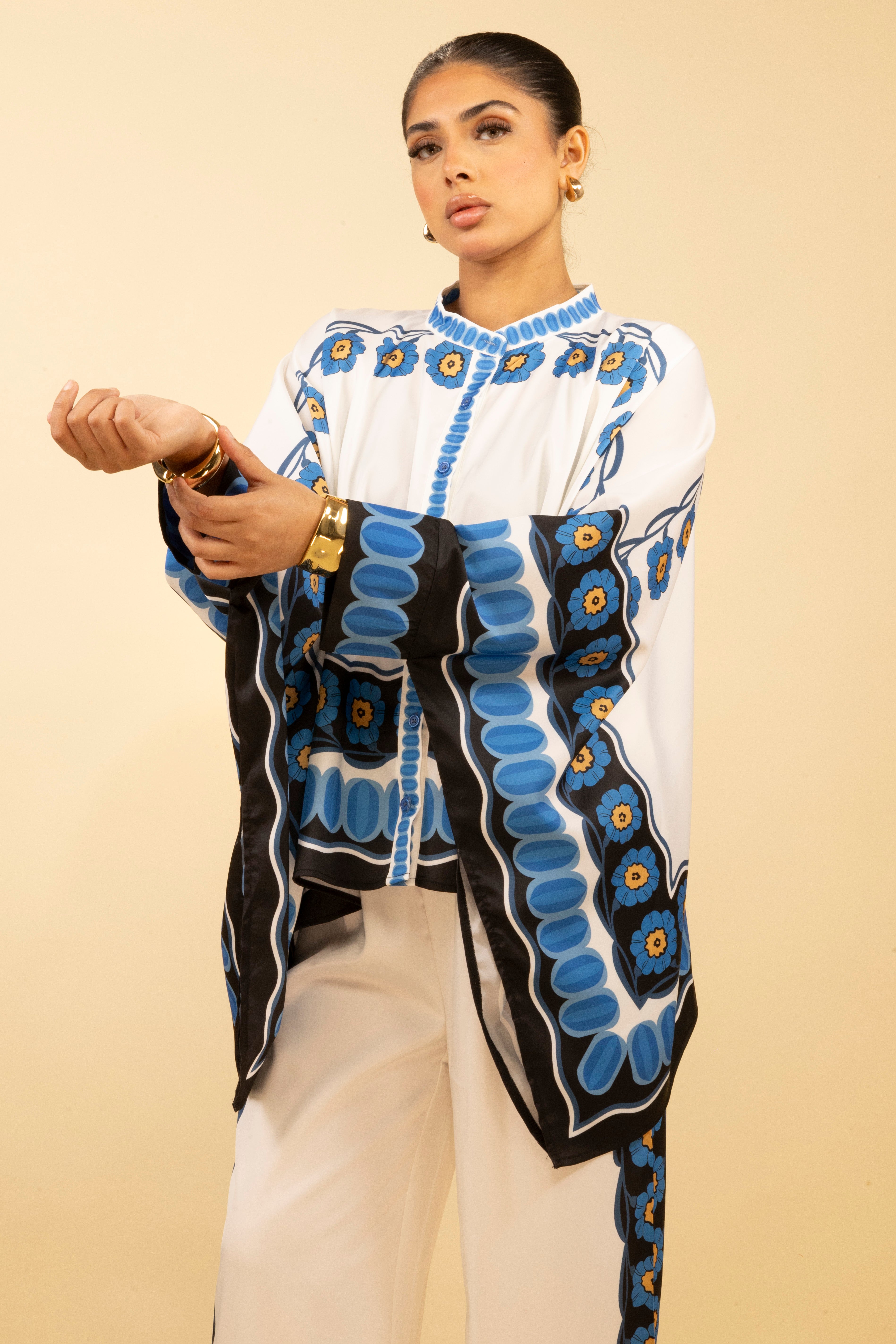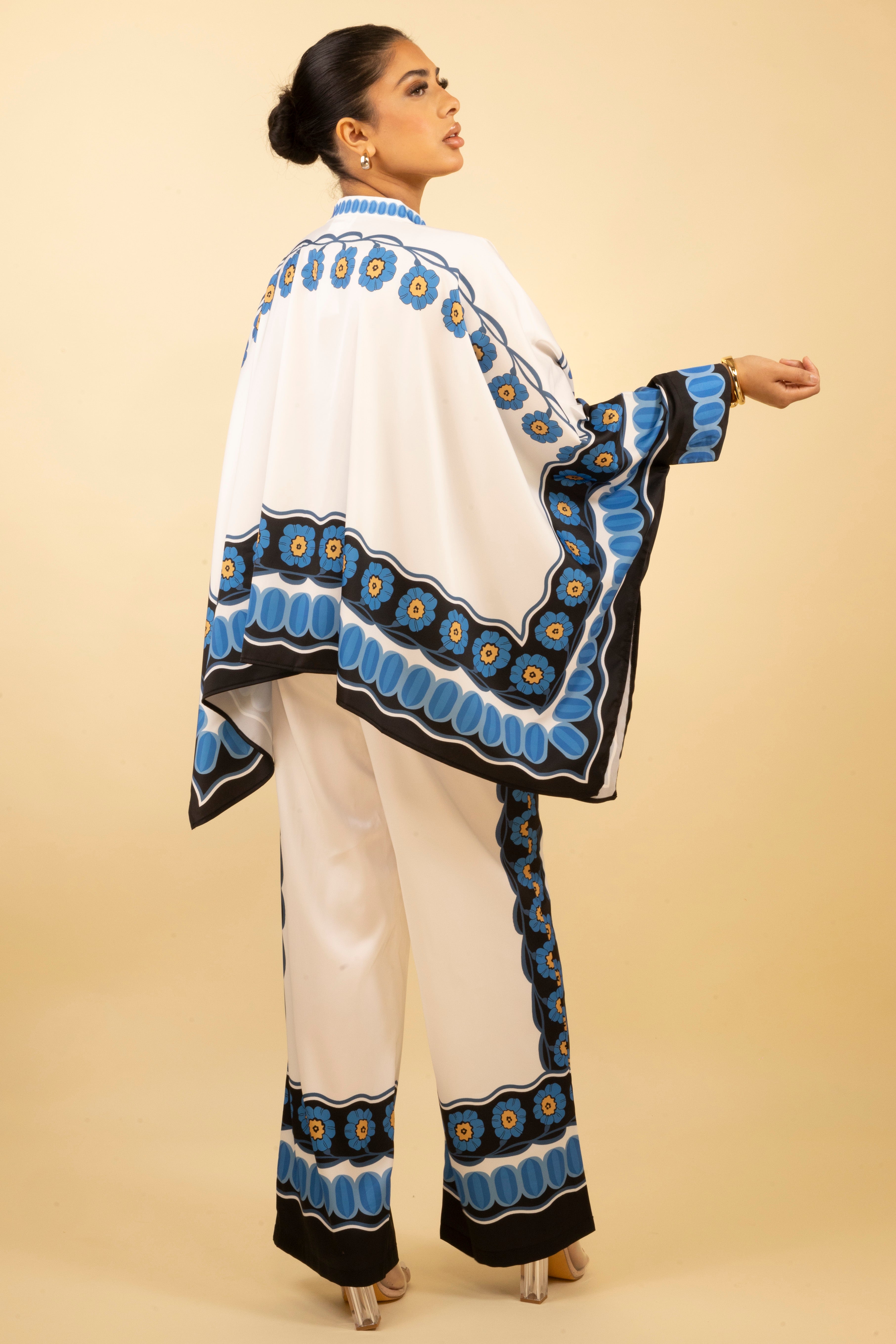 This eye-catching co-ord set features a flowy, poncho-style top and wide-leg trousers, printed with bold blue florals and geometric borders. The top fastens down the front with tonal buttons and has a high neckline, lending structure to its breezy silhouette.