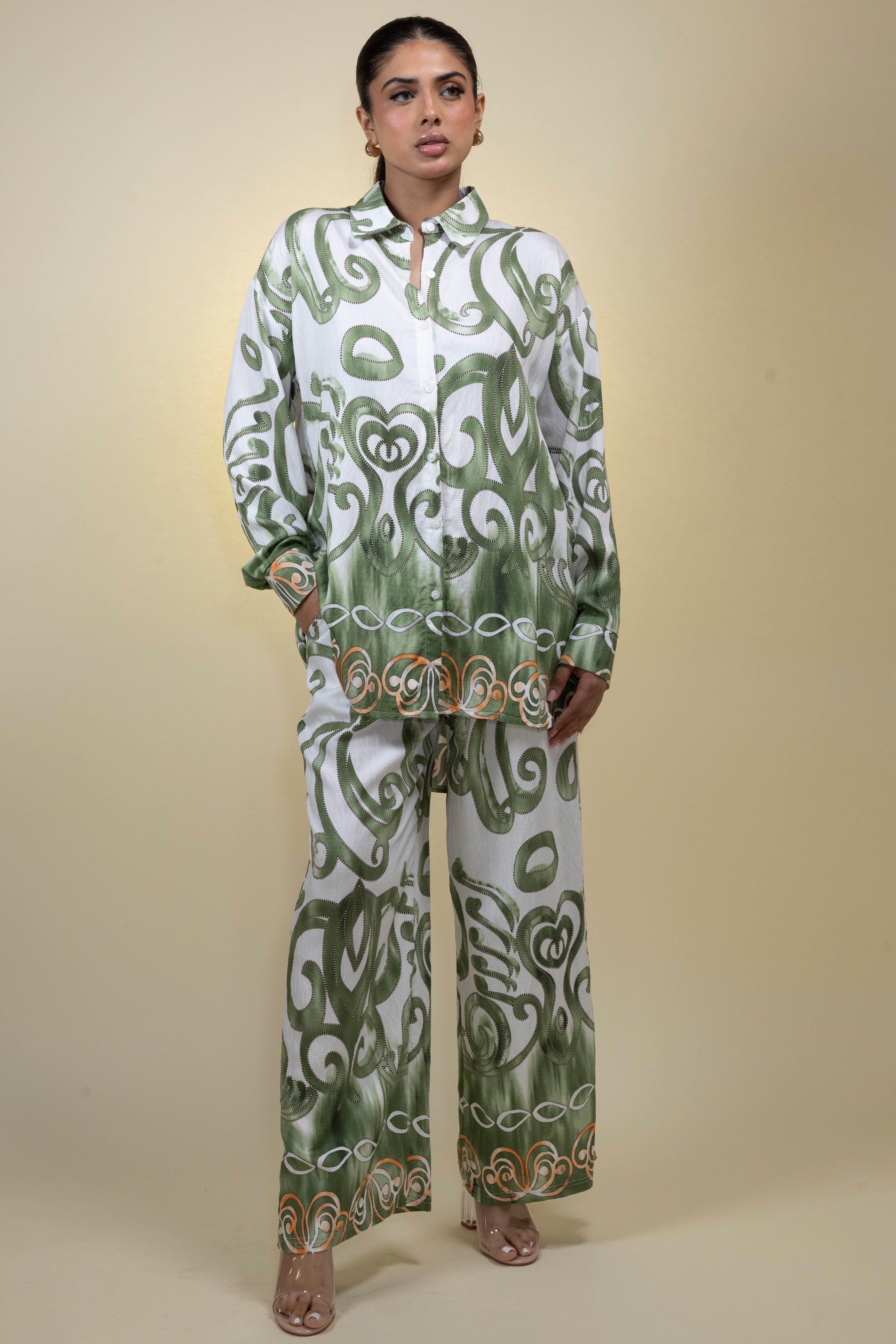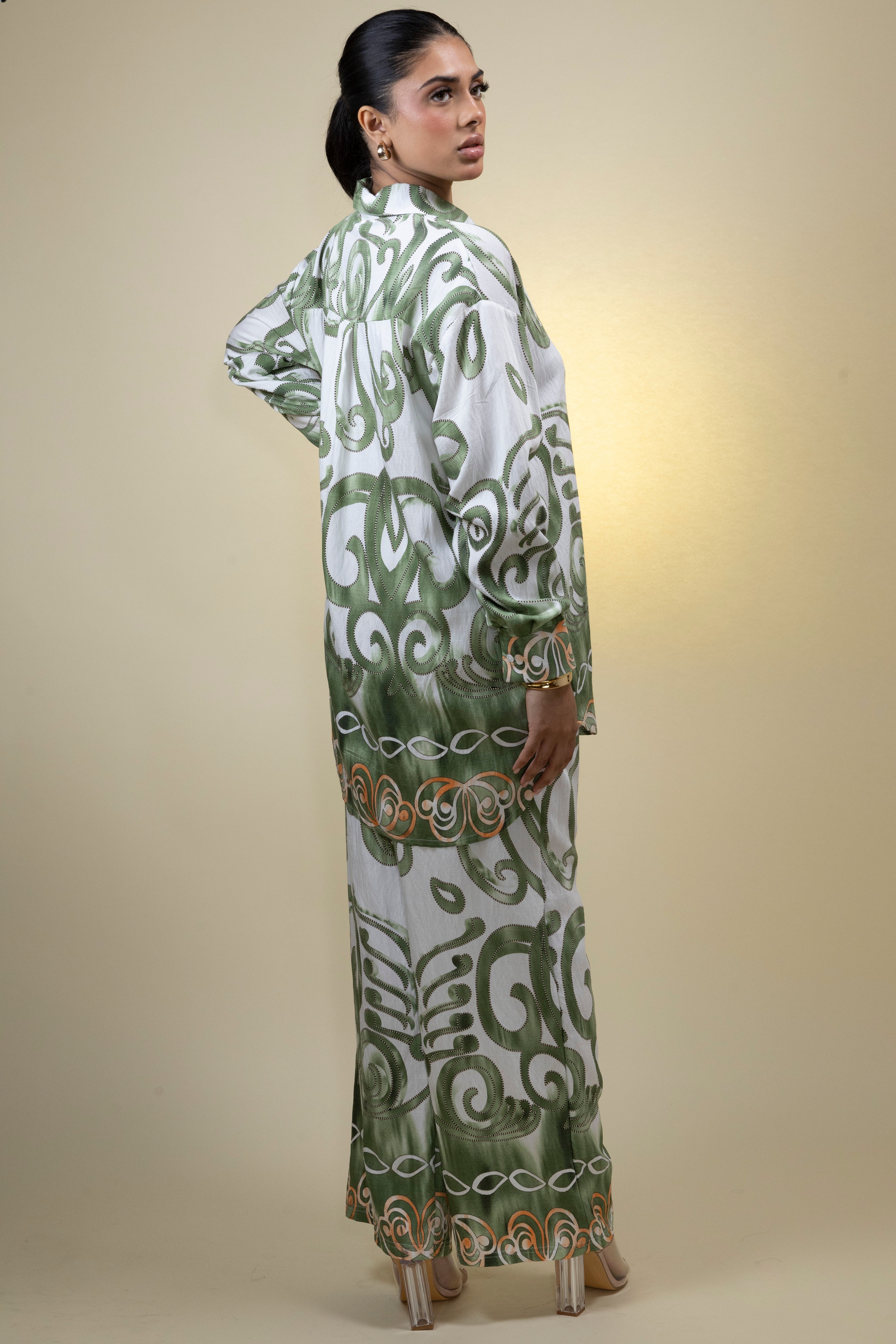 This green co-ord set is a refreshing statement piece that blends boldness with sophistication. The design features an expressive swirling print in earthy green tones across a white base, evoking nature-inspired elegance. The shirt is cut in a longline silhouette with a pointed collar and button-down front, exuding a structured yet relaxed vibe. The hem and cuffs are finished with intricate accents in orange and ochre, adding warmth and contrast to the cool green palette.