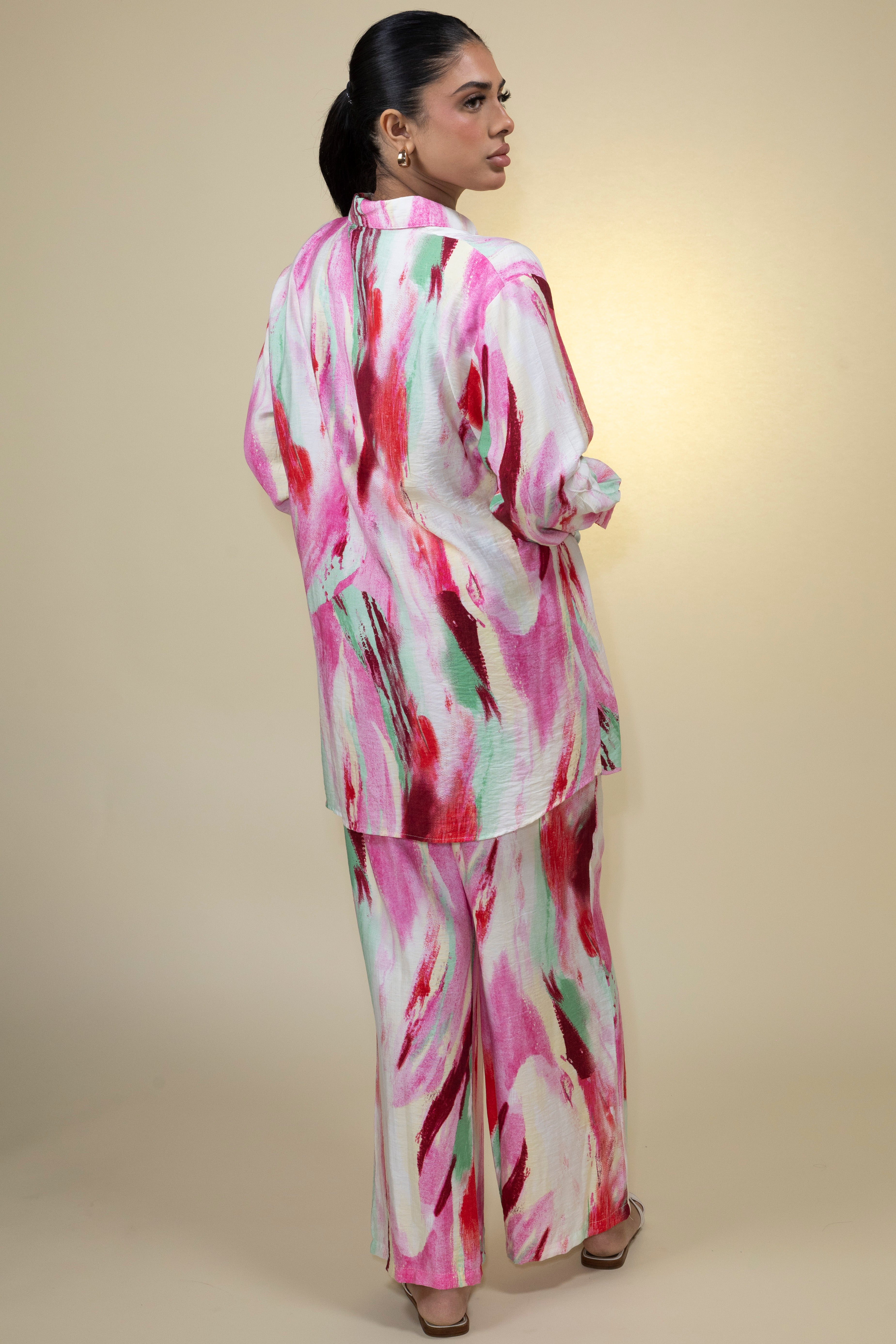 This pink co-ord set is a vibrant burst of artistic energy, perfect for bold summer days or statement-ready moments. Featuring an abstract brushstroke print in shades of hot pink, crimson, mint green, and soft white, the shirt has a relaxed, longline fit with a pointed collar and button-down front. The flowing fabric enhances the painterly design, giving it a lively, expressive feel that stands out without overwhelming.