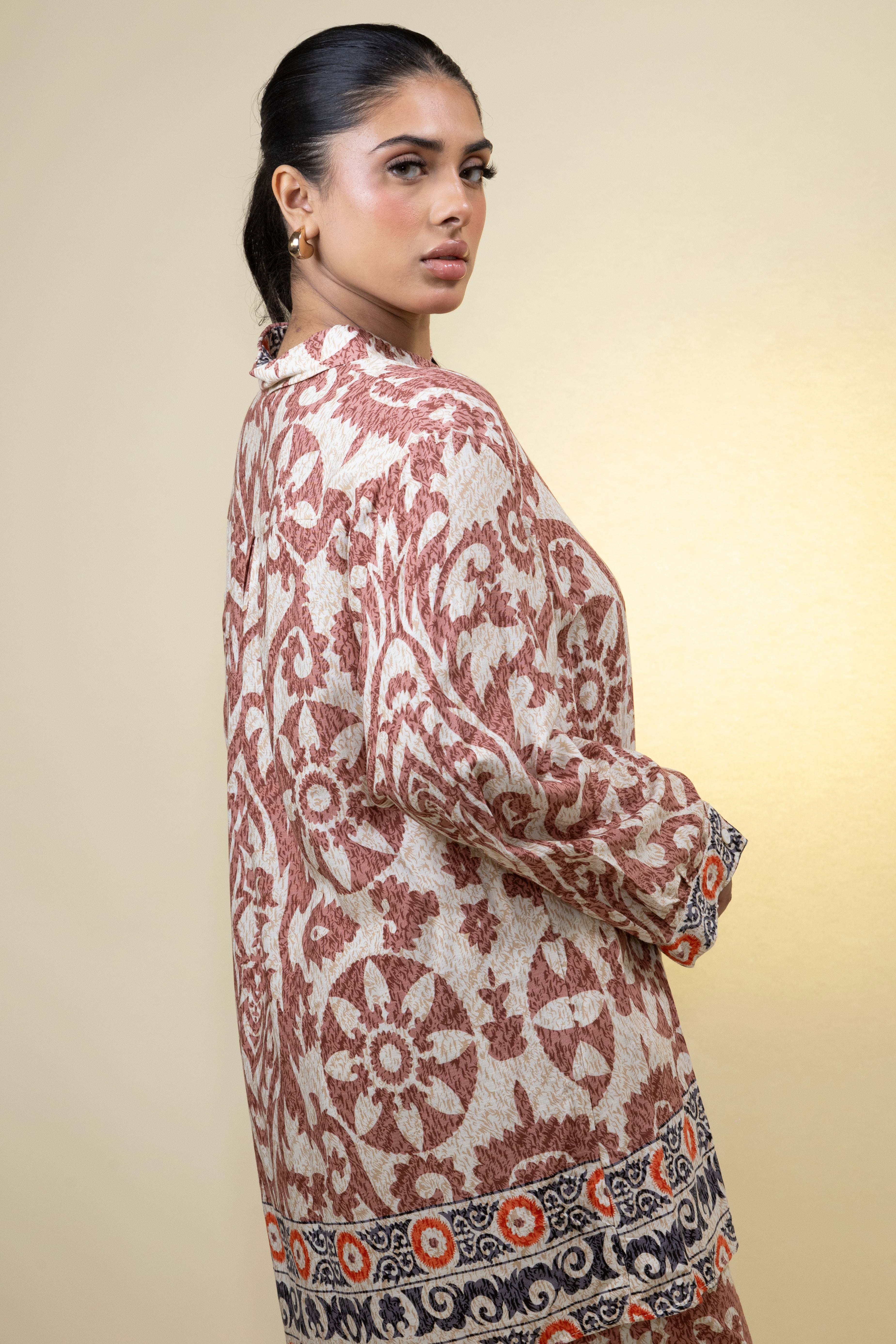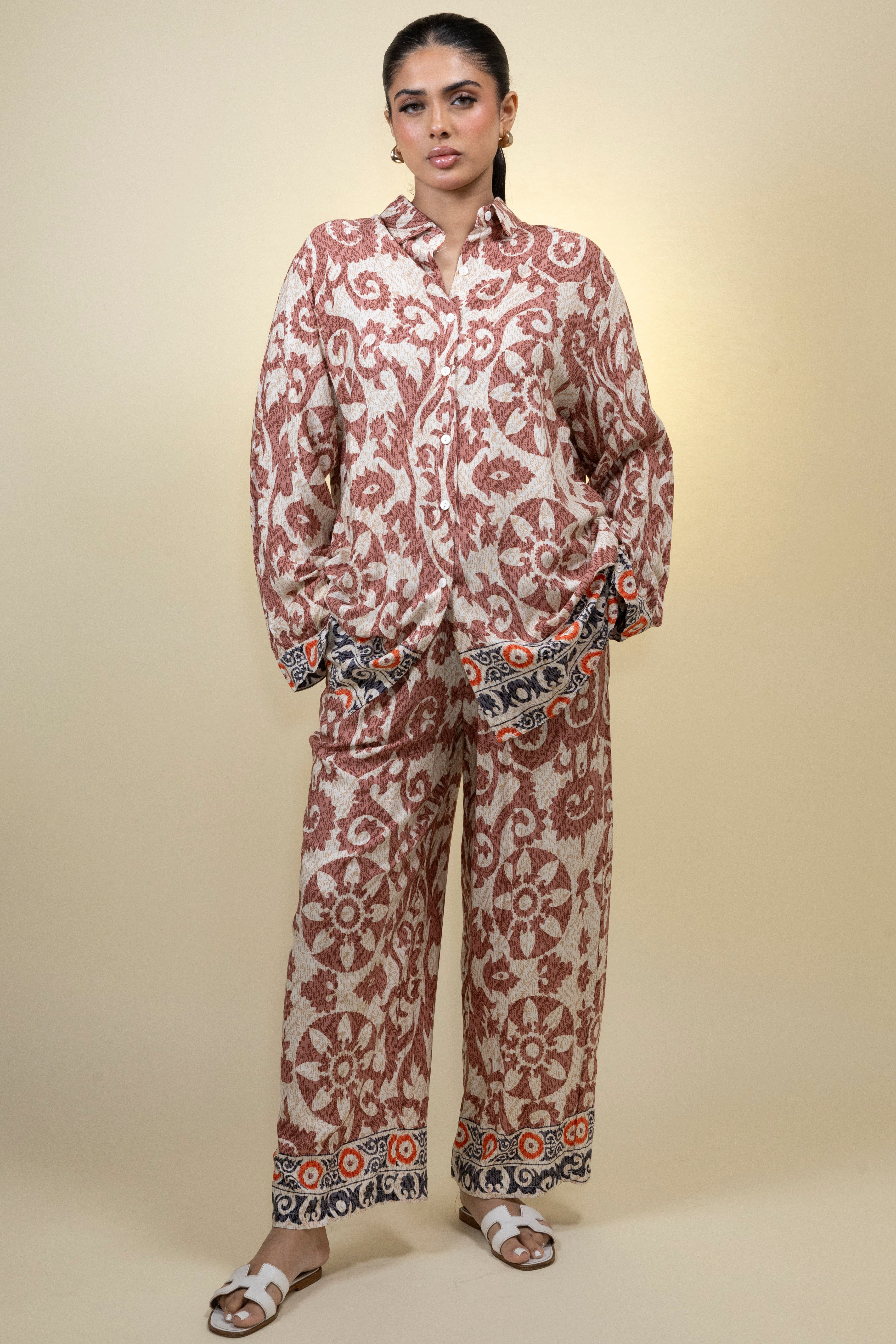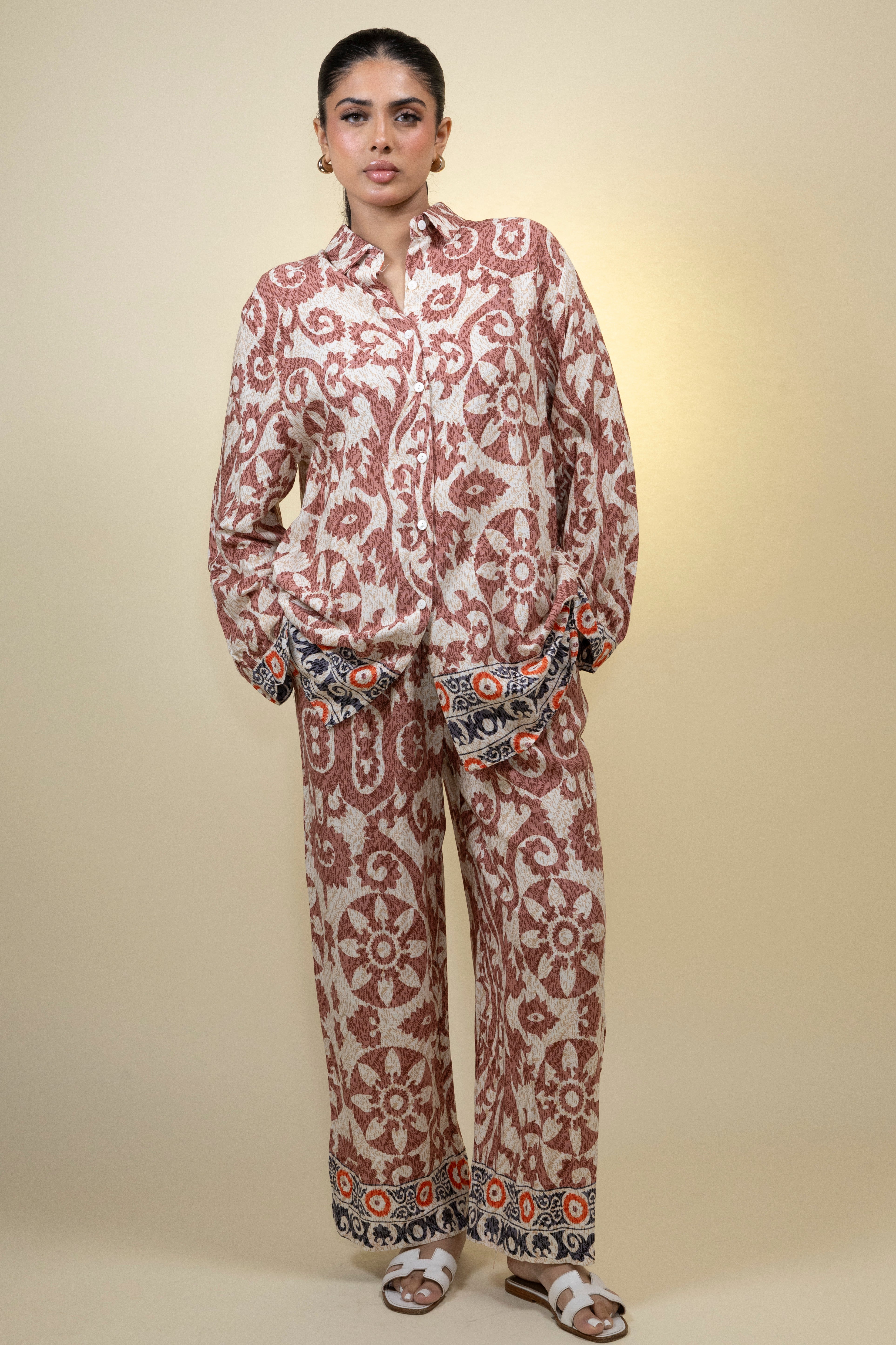 This red co-ord set is a bold fusion of traditional charm and contemporary ease. Showcasing an all-over abstract floral and geometric pattern in earthy red tones, the button-down shirt is relaxed in silhouette with a classic collar and cuffed sleeves. Its standout feature lies in the contrasting navy, ivory, and orange embroidered detailing at the sleeve cuffs and hem — adding visual richness and a handcrafted feel.