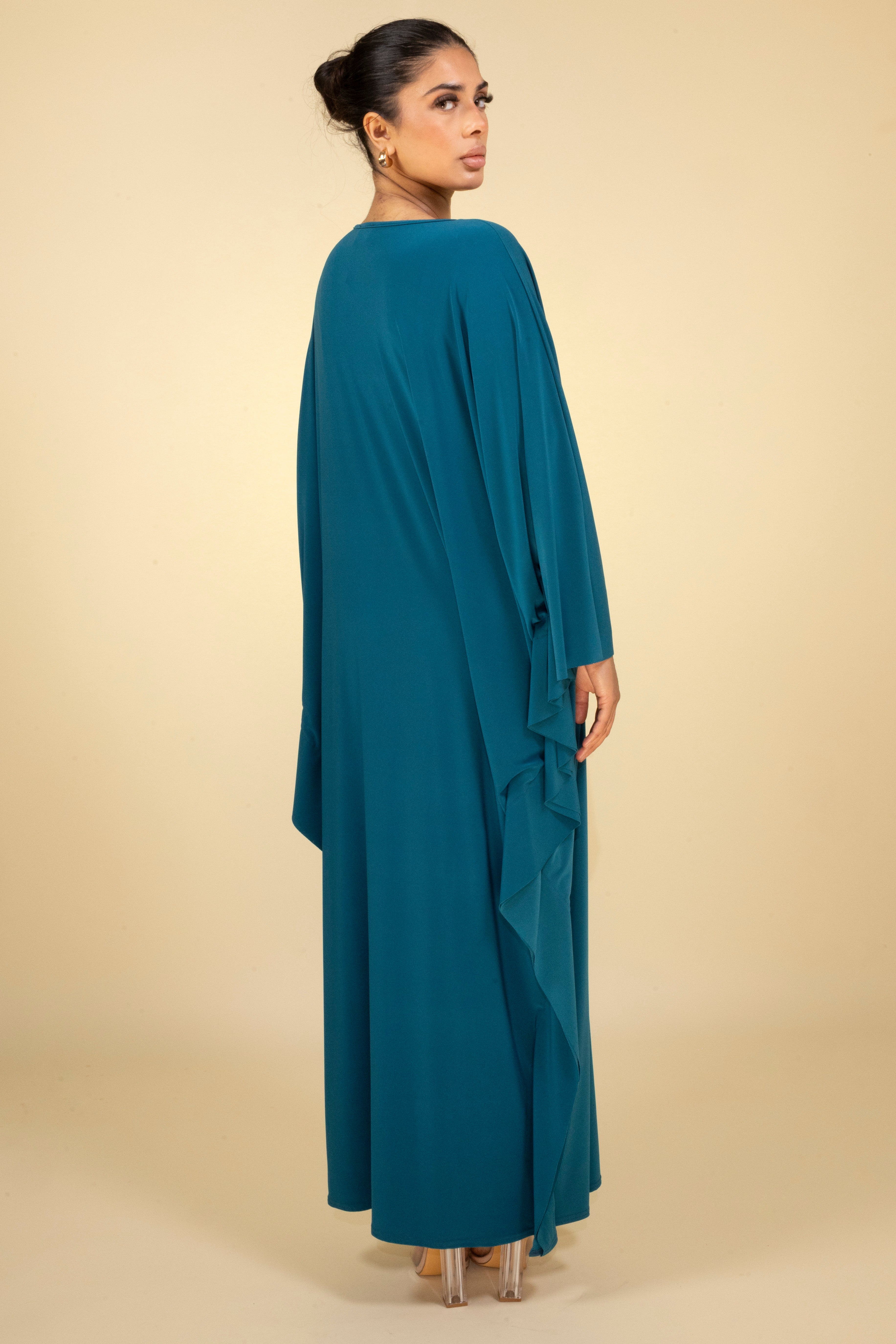 This elegant kaftan in a rich, deep teal shade is designed for effortless sophistication. The flowing, draped silhouette skims the body beautifully, offering a flattering and comfortable fit. Crafted from a soft, lightweight fabric, it moves gracefully with every step, making it perfect for both special occasions and everyday wear.