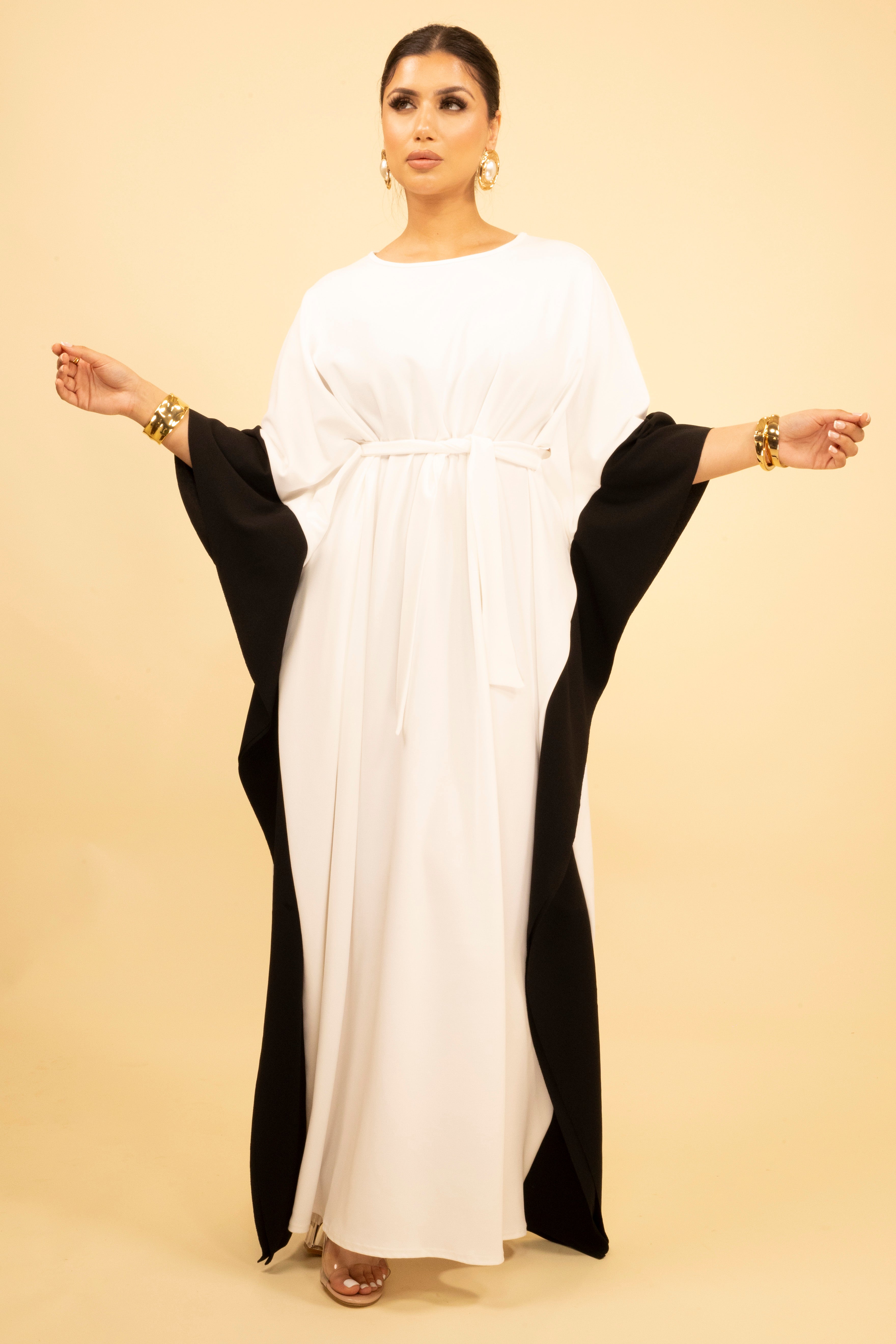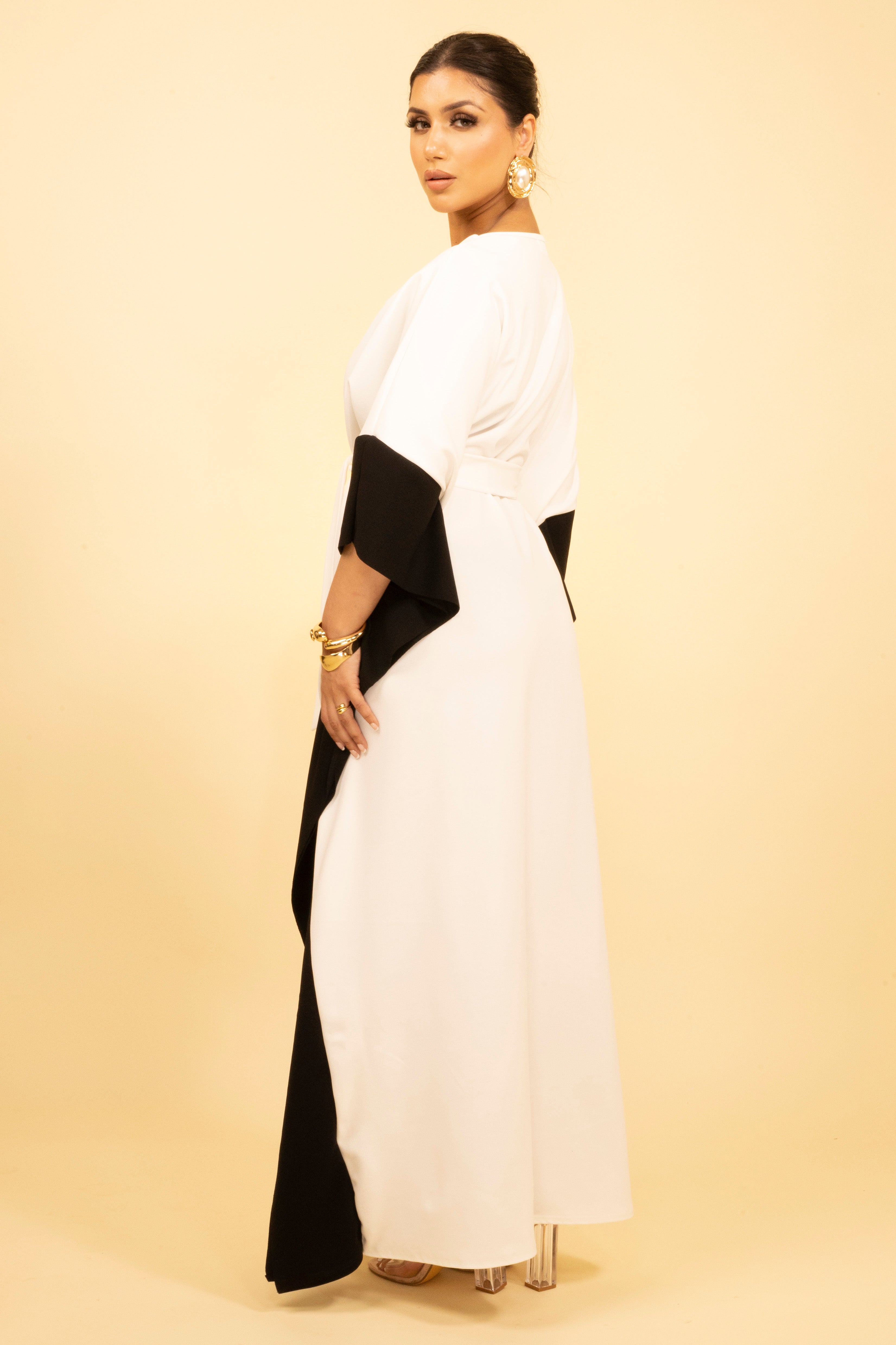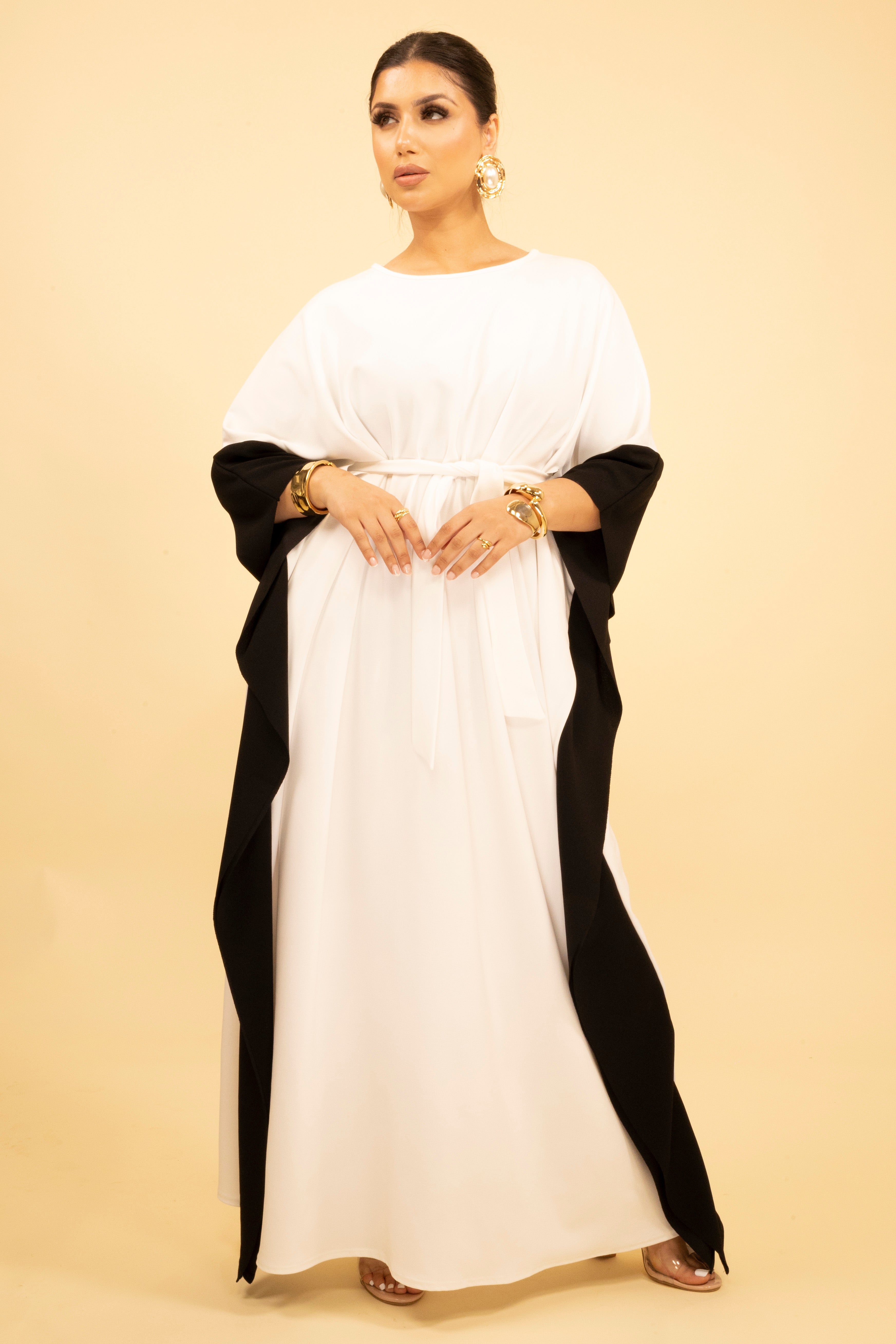 This white and black kaftan is a sophisticated choice for effortless elegance. The contrasting black accents create a striking design, while the flowing white base offers timeless appeal. Featuring a waist tie, this kaftan allows for a customised and flattering fit. The wide sleeves add a touch of drama, making it perfect for both formal occasions and elevated casual wear. Pair it with understated accessories to complete the polished look.