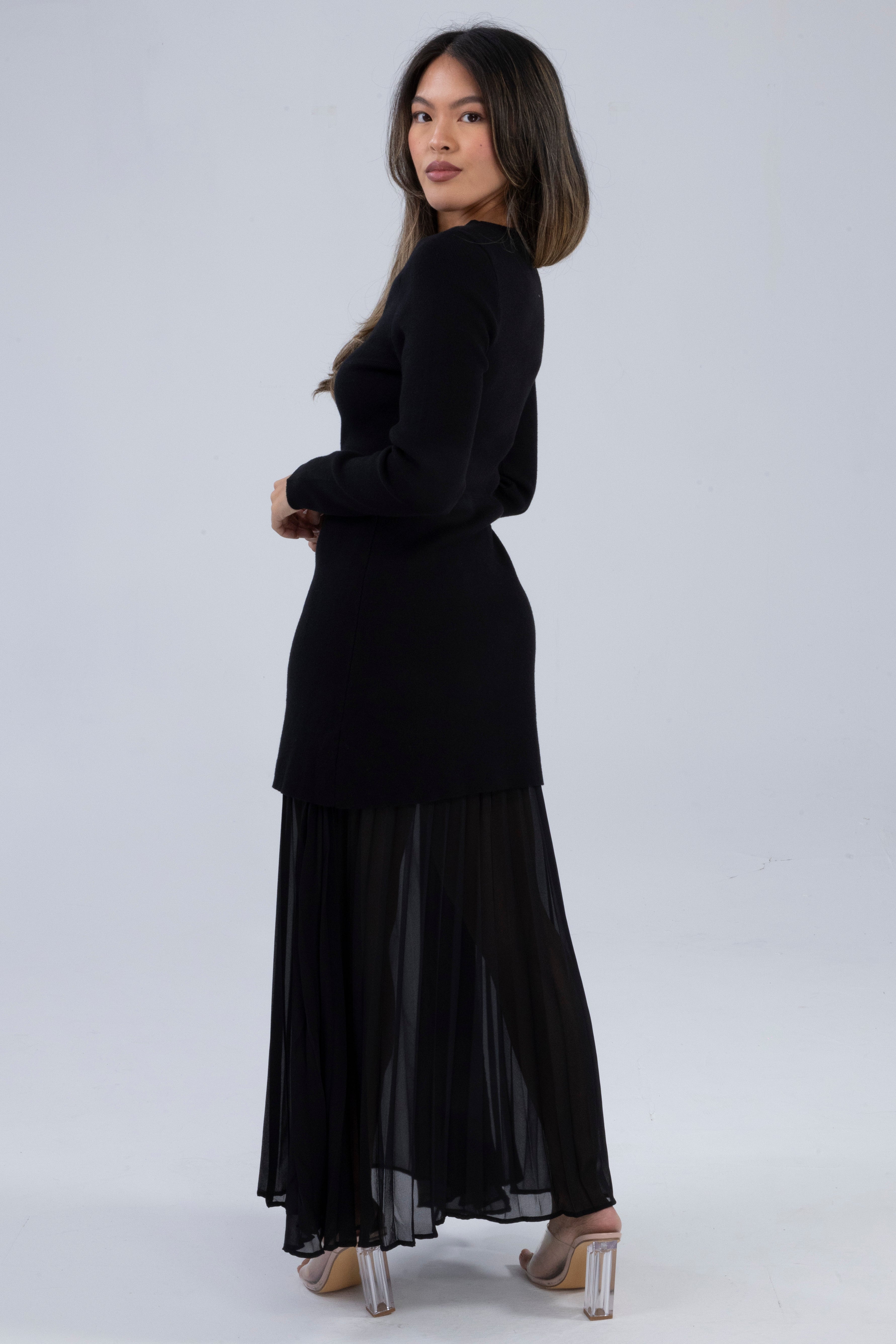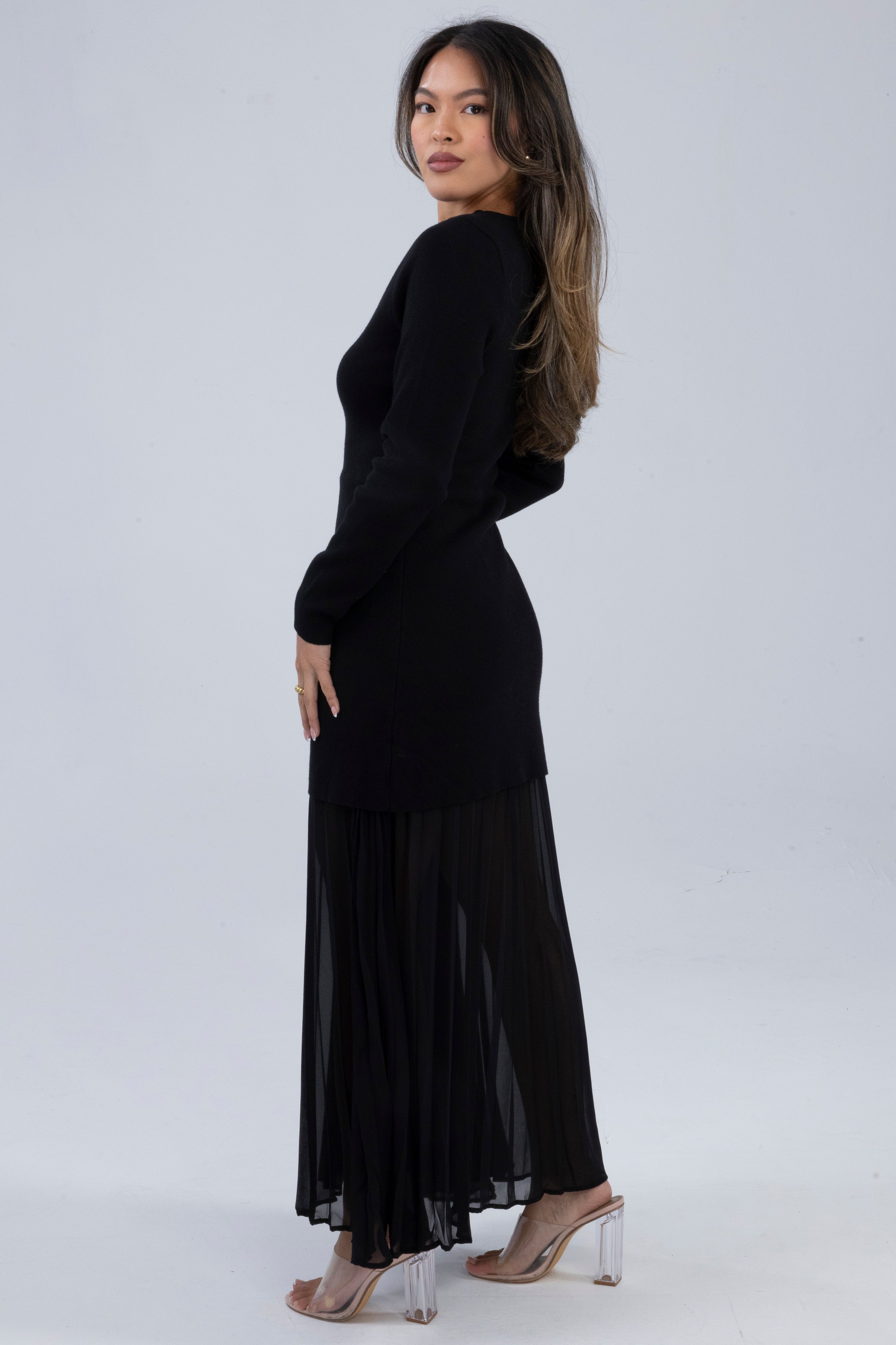 Chic and effortlessly refined, this black dress is a modern staple with elevated details. The top half features a soft, ribbed knit bodice with a flattering fitted shape and long sleeves, offering warmth and structure. Flowing from the waist, the sheer pleated skirt adds a delicate contrast, creating graceful movement with every step.