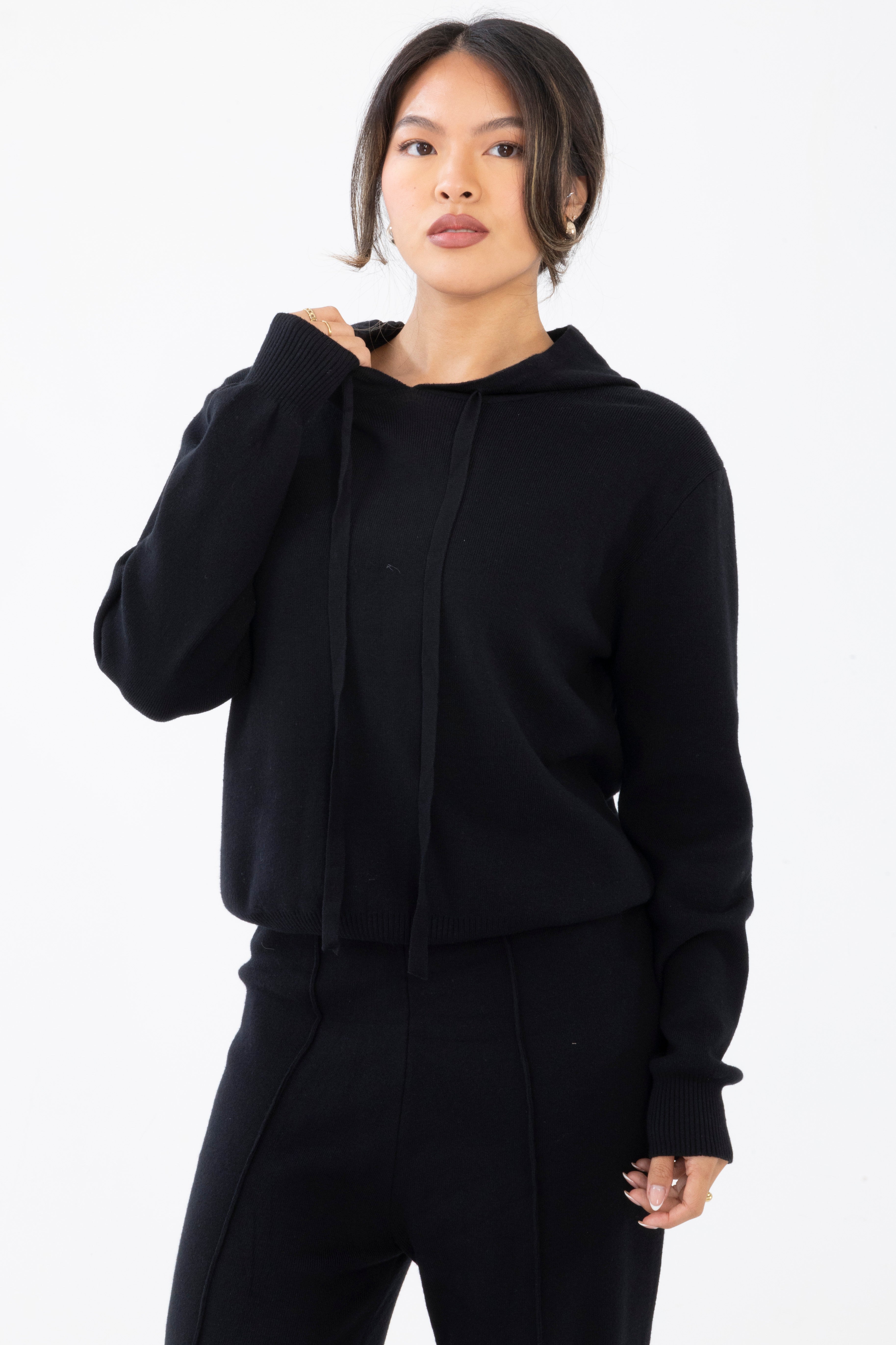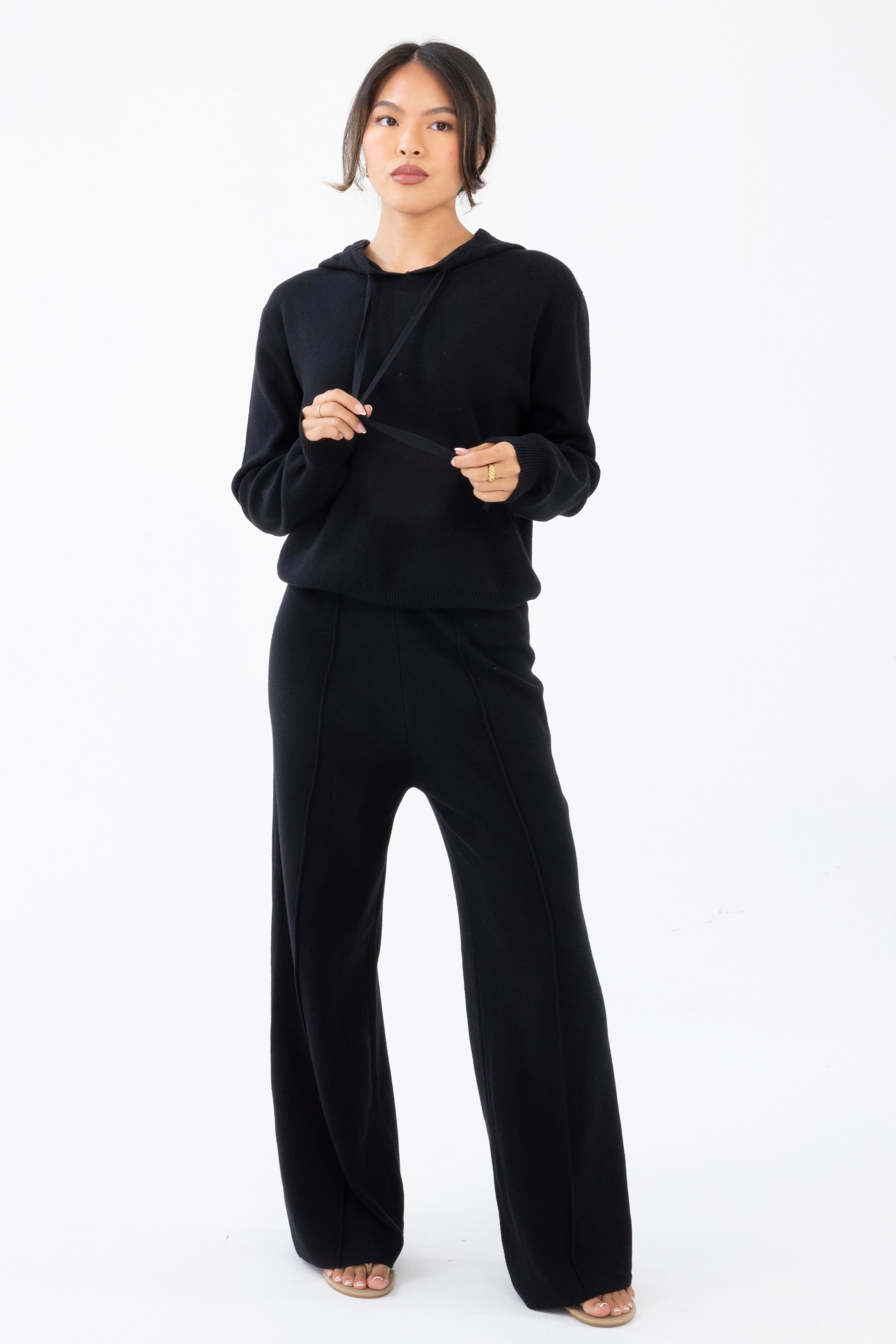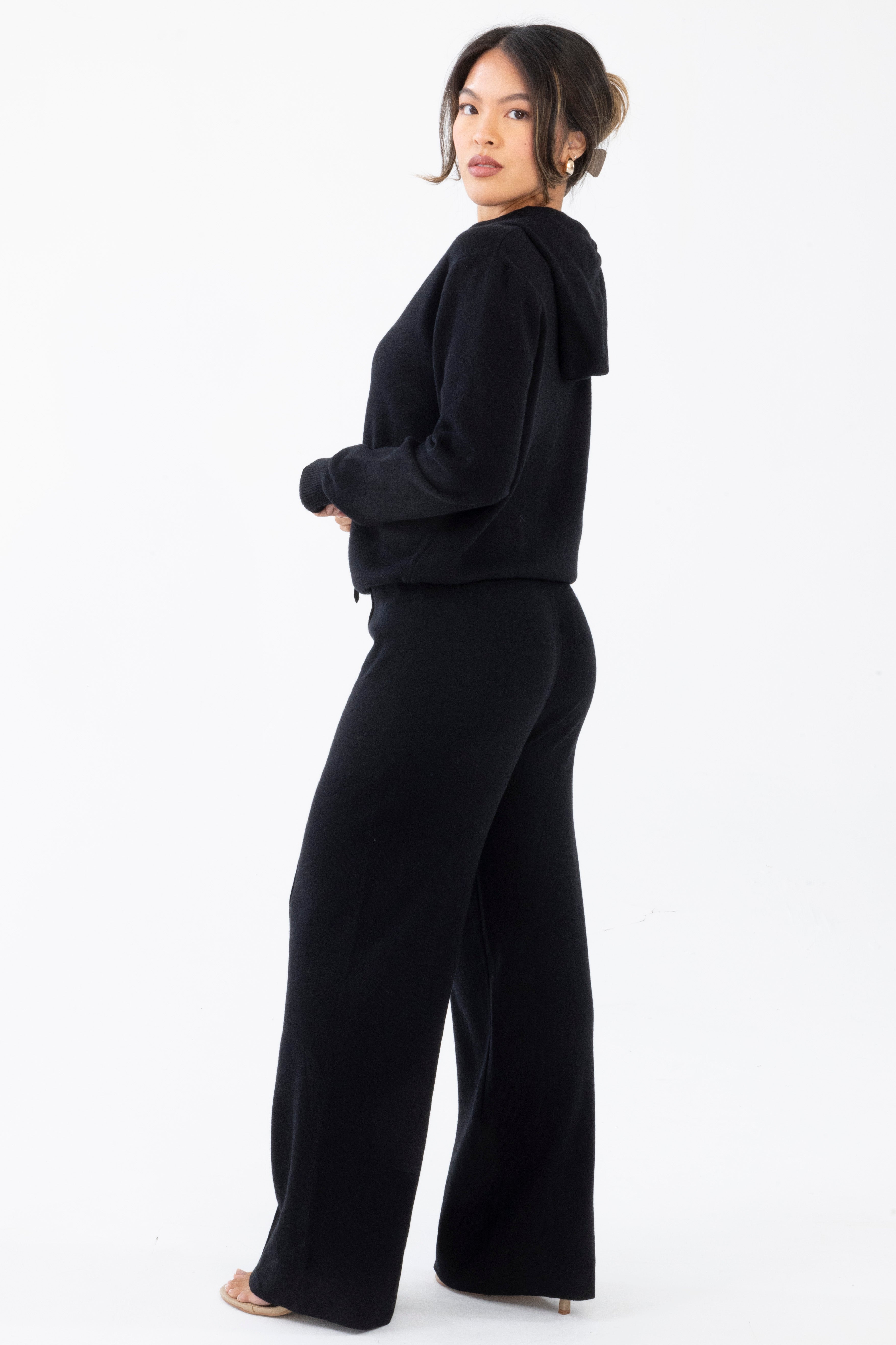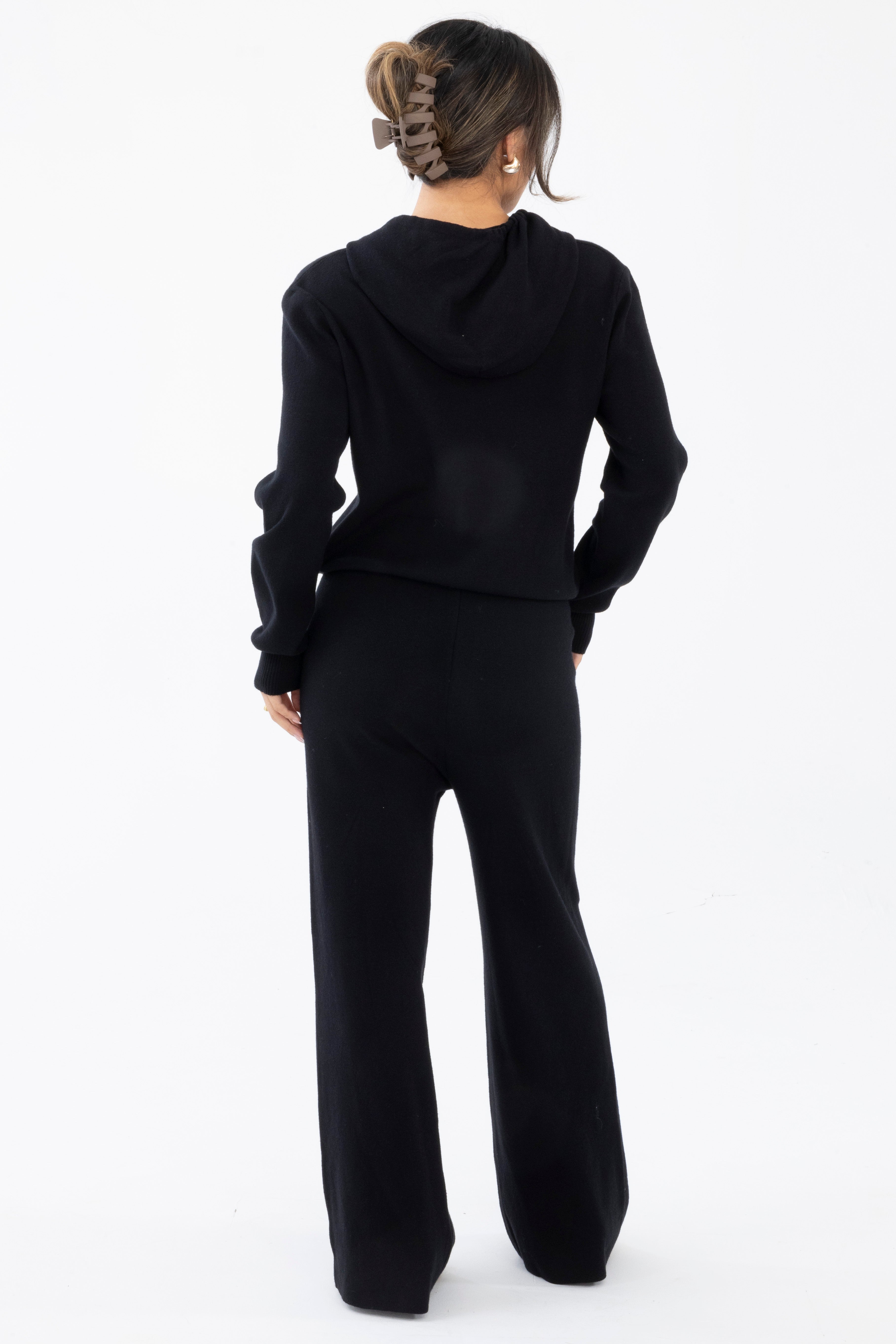 Keep things effortlessly cool in this black knit co-ord set, perfect for casual days or cosy evenings. The set includes a soft, fitted hoodie with drawstring detailing and ribbed cuffs, offering a sleek silhouette without compromising on comfort. Paired with high-waisted, wide-leg trousers featuring subtle seam detailing, this look brings just the right balance of style and ease.