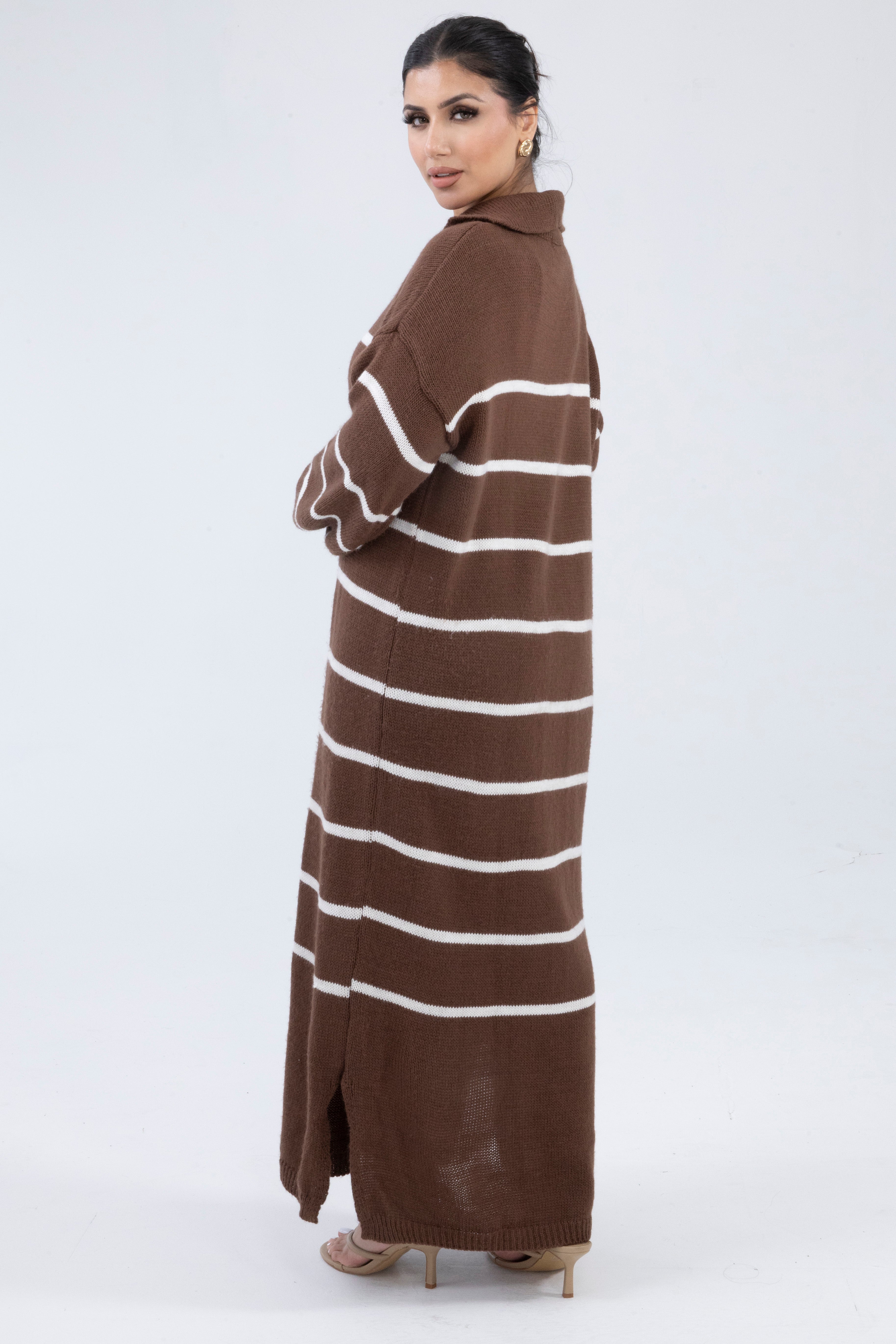 Cosy meets cool in this relaxed brown knit dress, designed with effortless comfort and laid-back charm. The soft, midweight knit features cream horizontal stripes throughout, adding a classic touch to the contemporary silhouette. The open collar and V-neckline create a flattering frame, while the long sleeves and maxi length offer full coverage for cooler days.