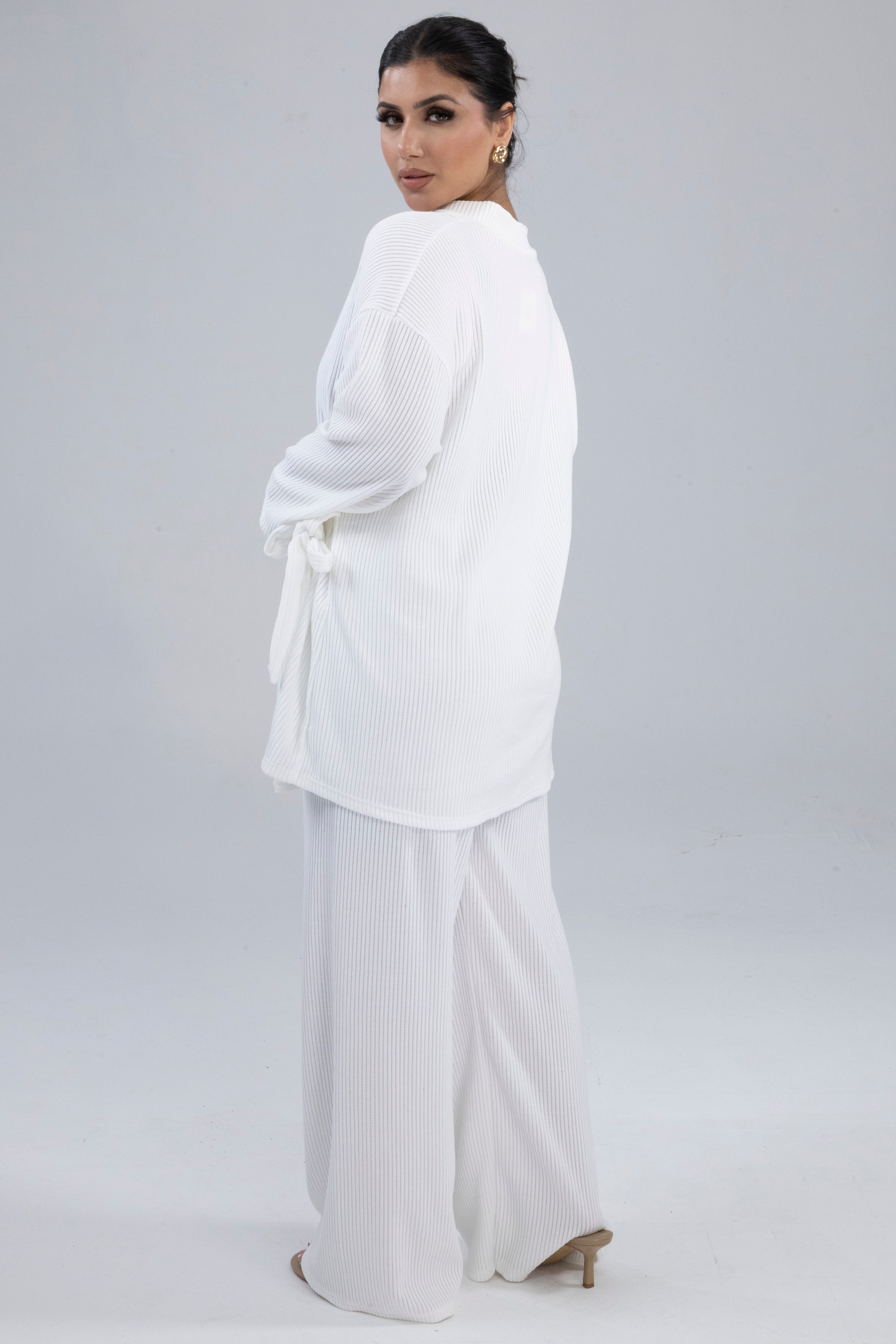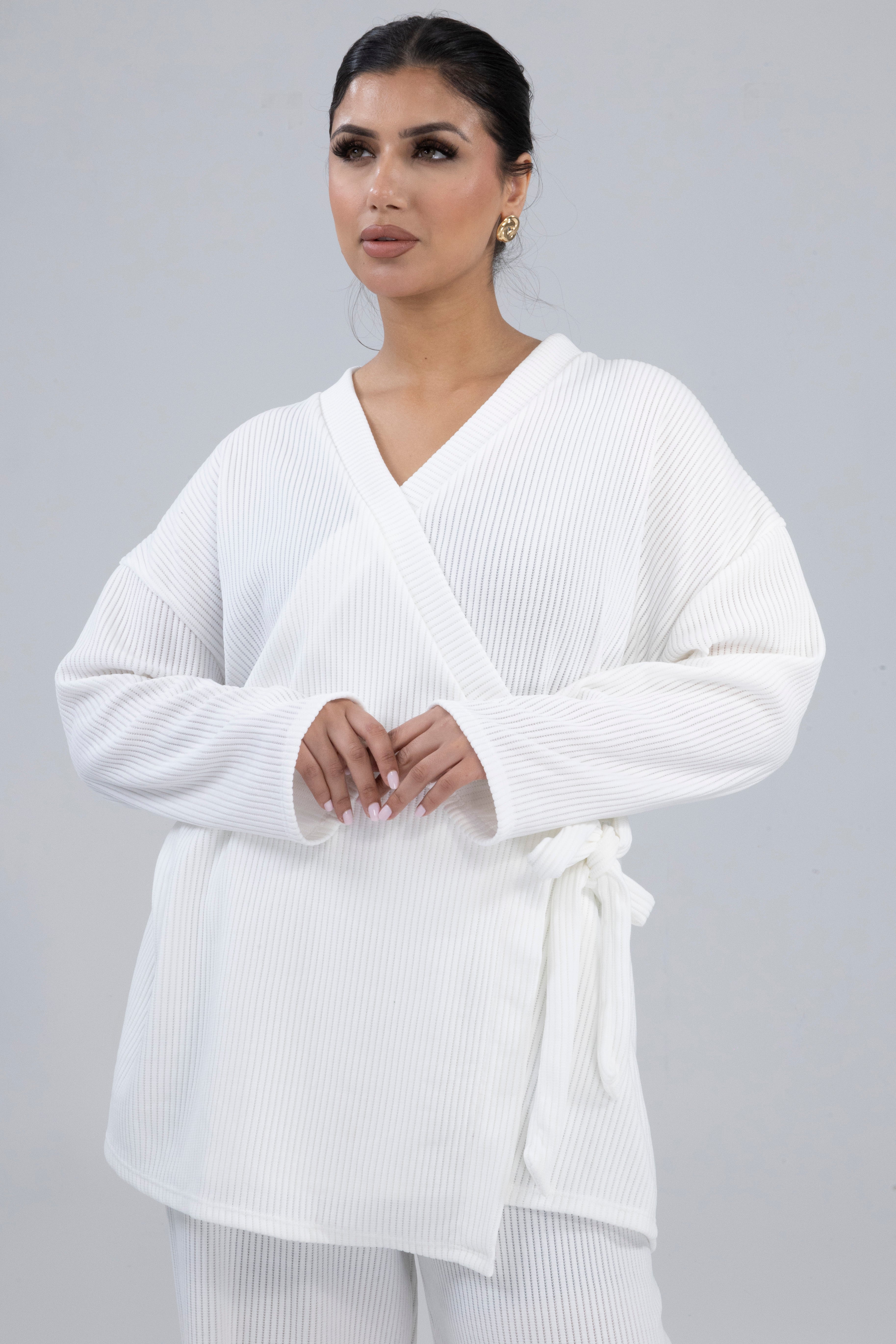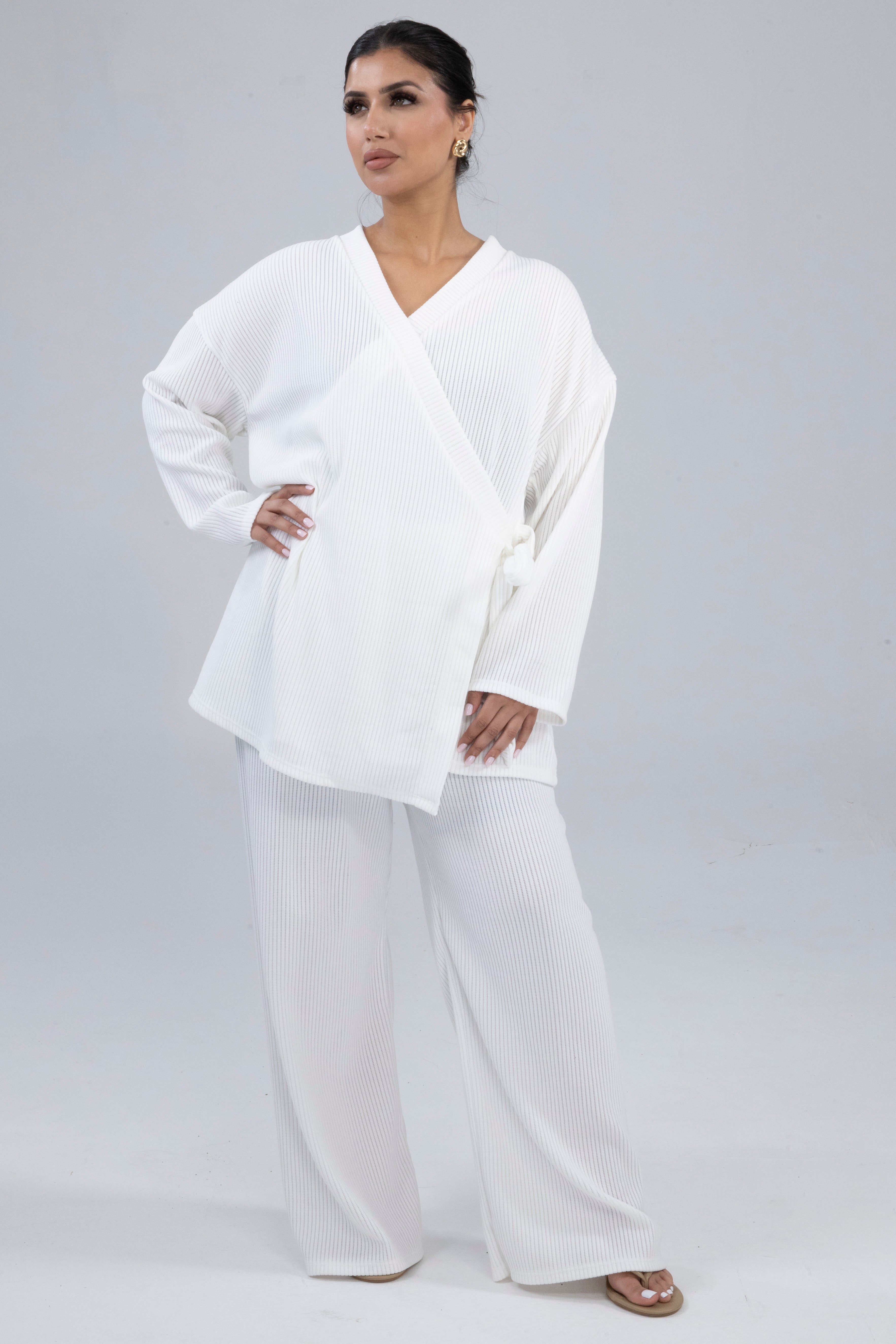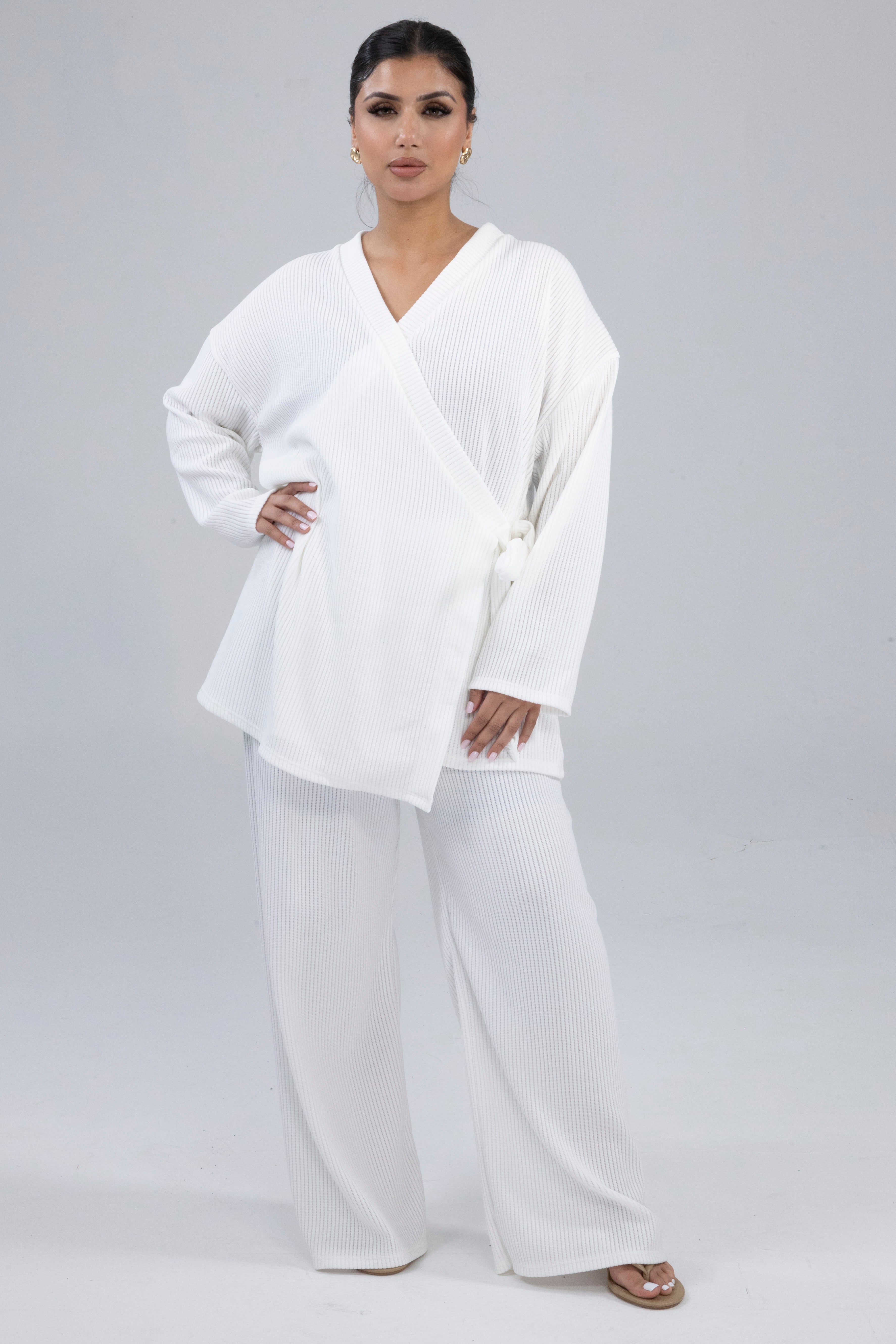 Elevate your off-duty wardrobe with this crisp white co-ord set, designed in a soft ribbed corduroy-style fabric that drapes effortlessly. The wrap-style top is cut in a relaxed silhouette with wide sleeves and a side-tie closure, creating a flattering yet laid-back look.