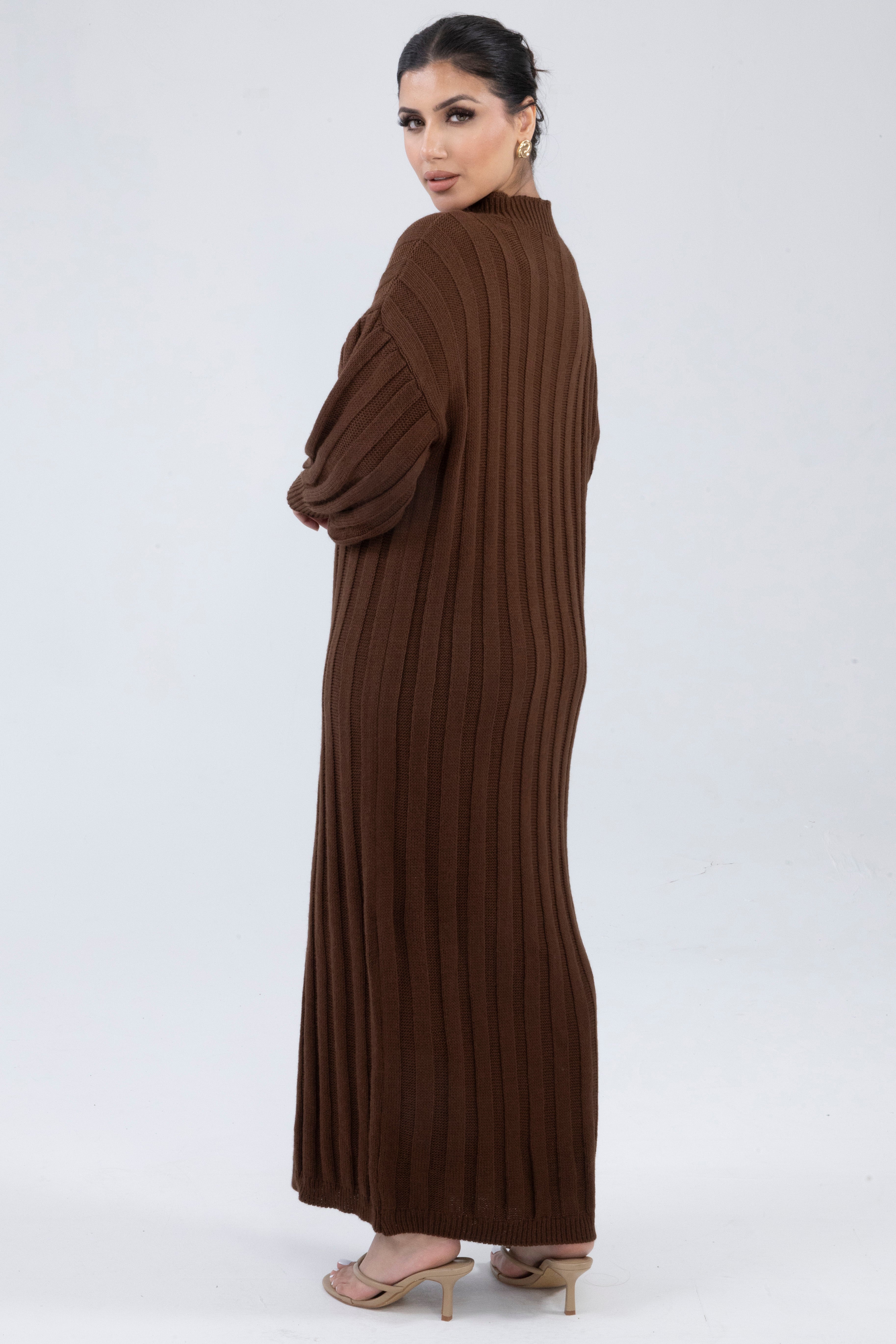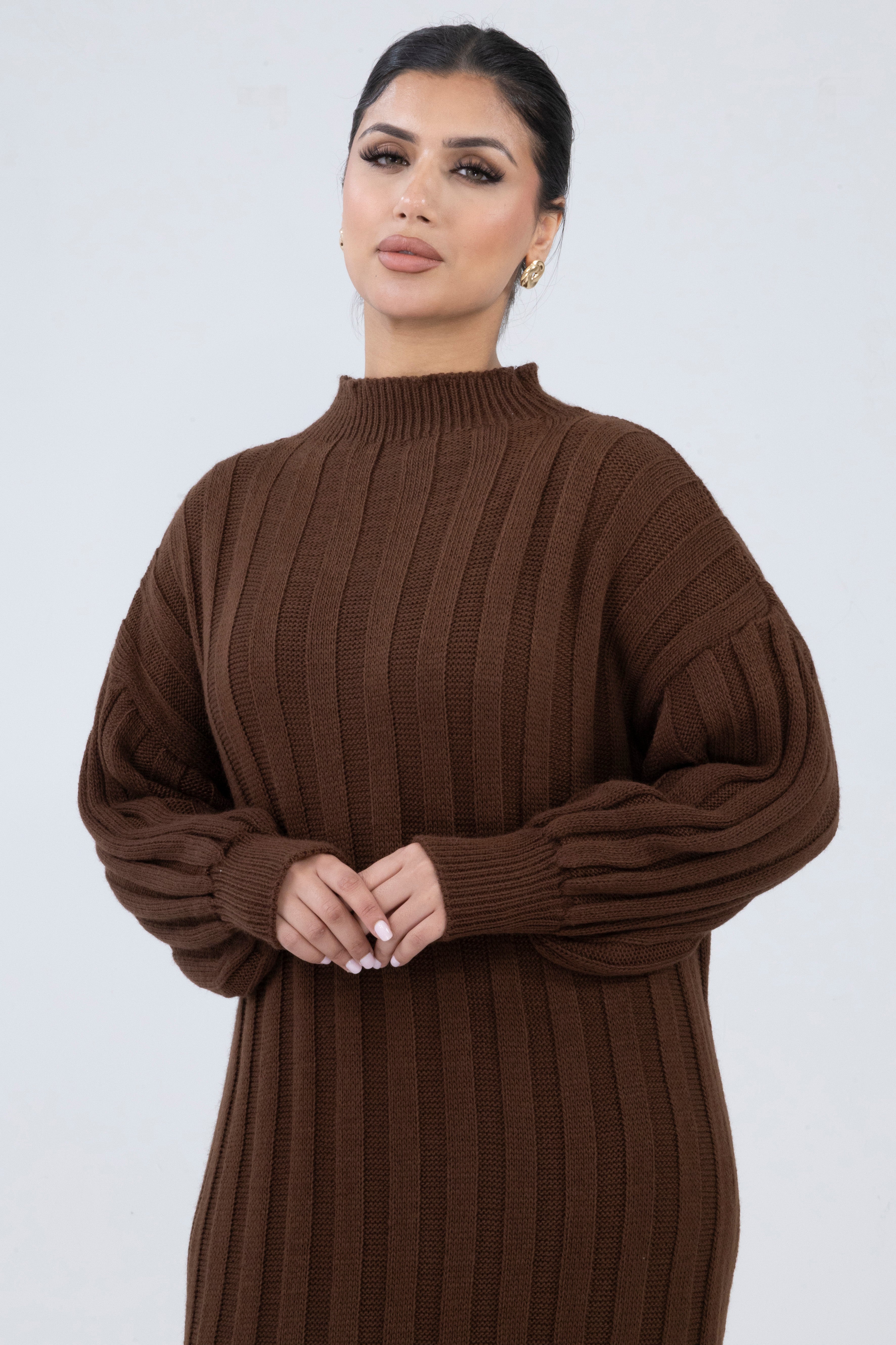 Step into cosy sophistication with this rich brown knit dress, crafted with thick ribbed texture and voluminous balloon sleeves for a statement silhouette. The high neckline and full-length cut provide both warmth and style, making it a versatile piece for seasonal layering or solo wear on crisp days.