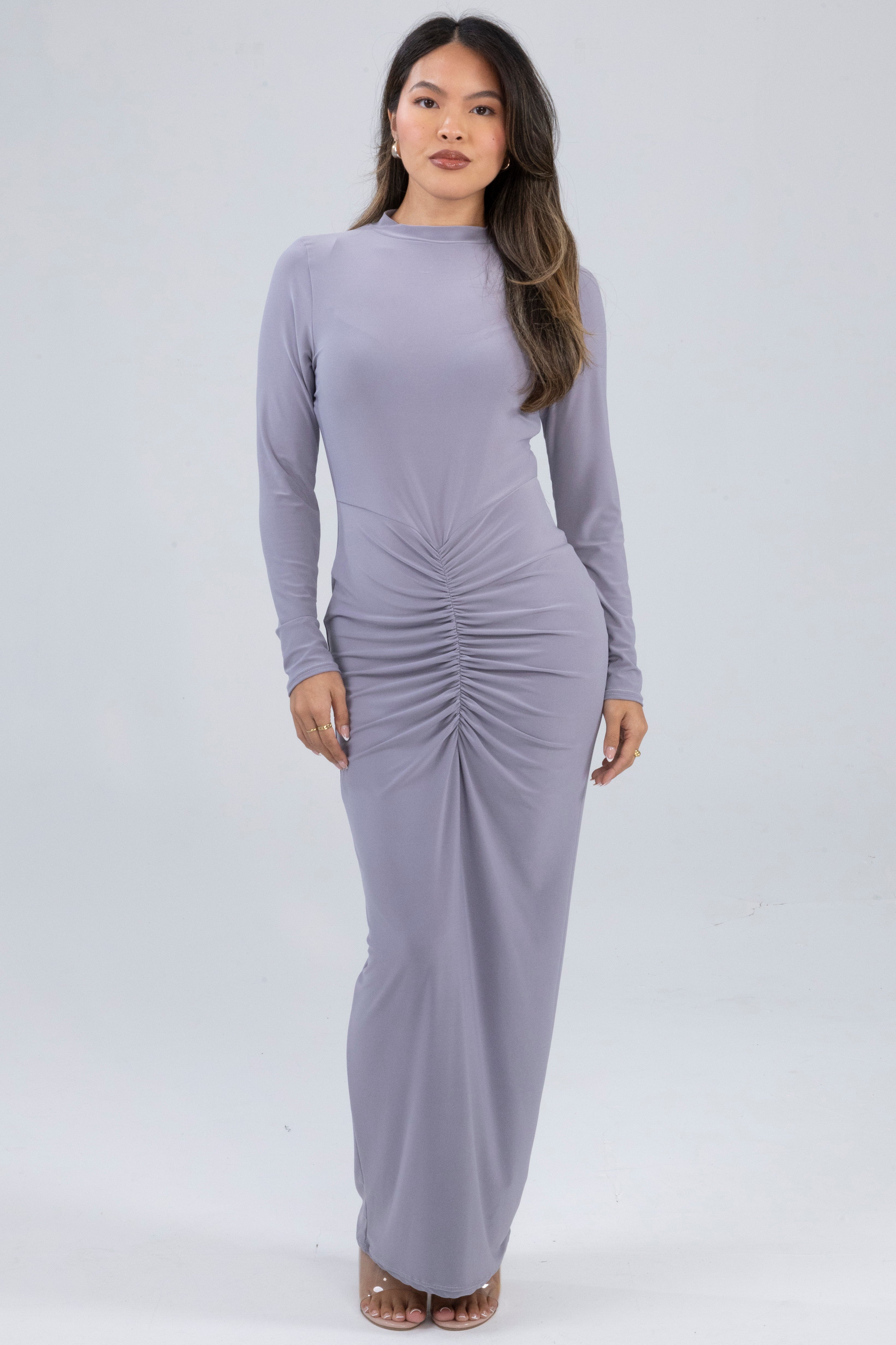 Exude effortless sophistication with this sleek grey ruched maxi dress. Designed with a high neckline and long sleeves, this elegant piece flatters with a subtle gathered waist detail that enhances your natural silhouette.