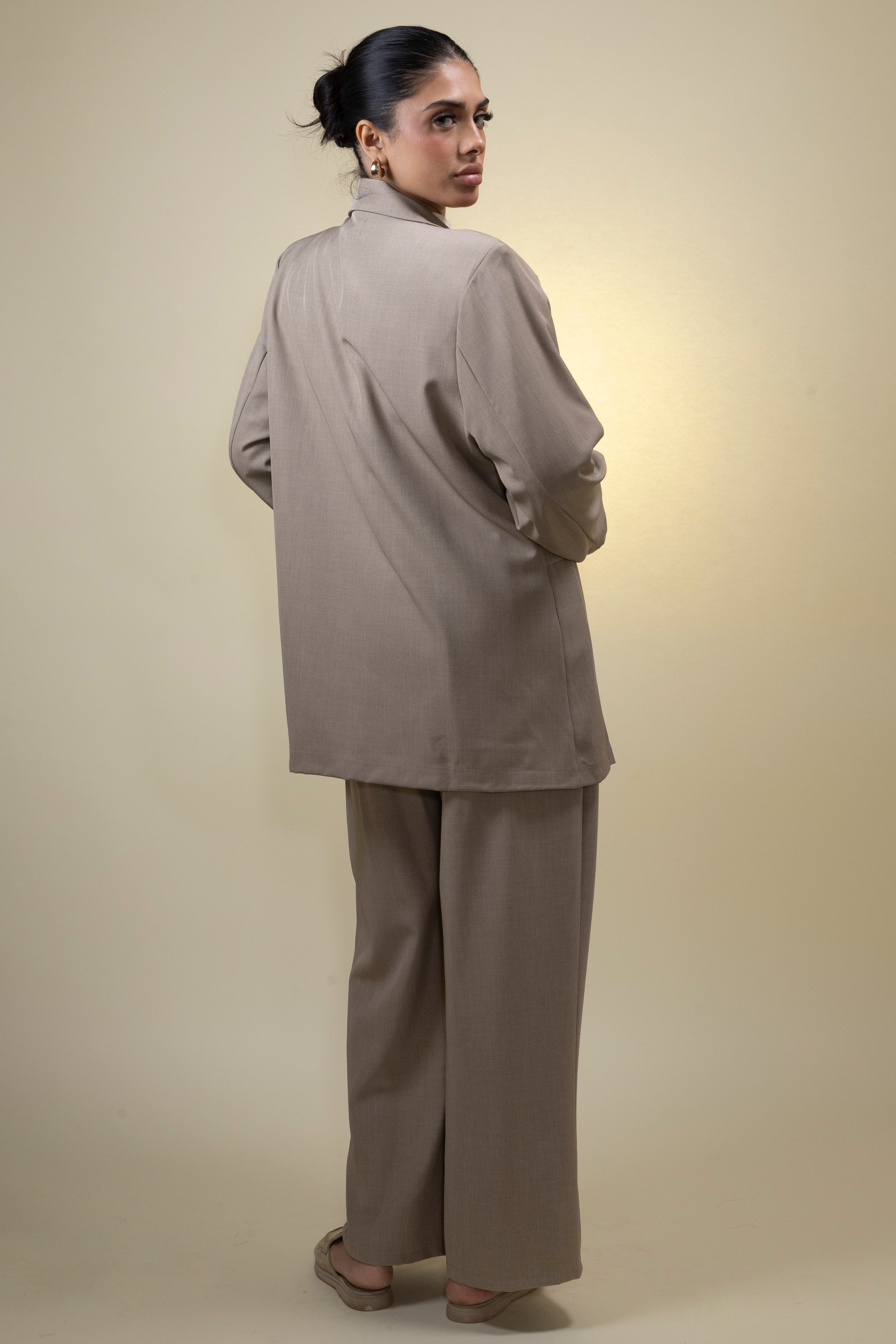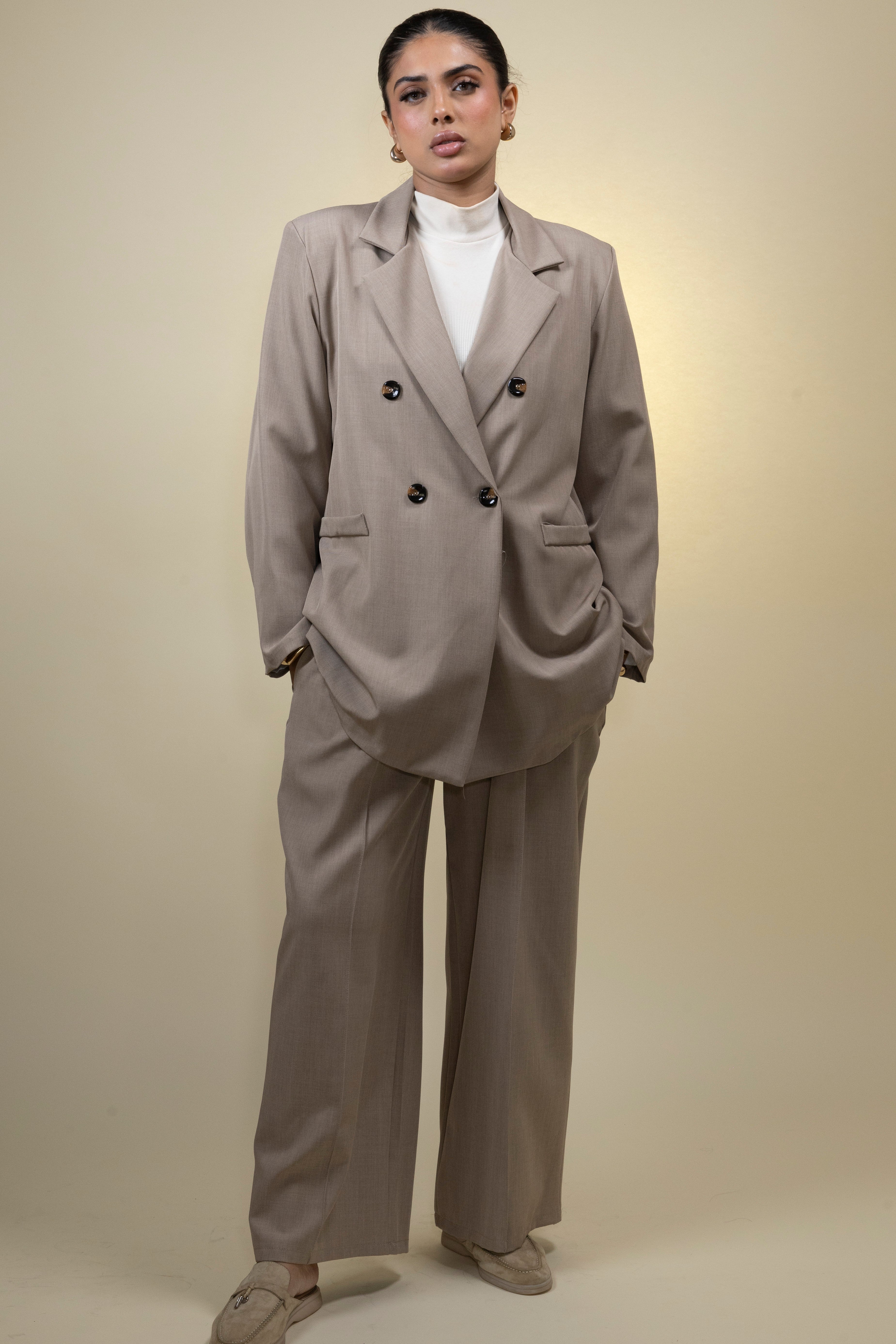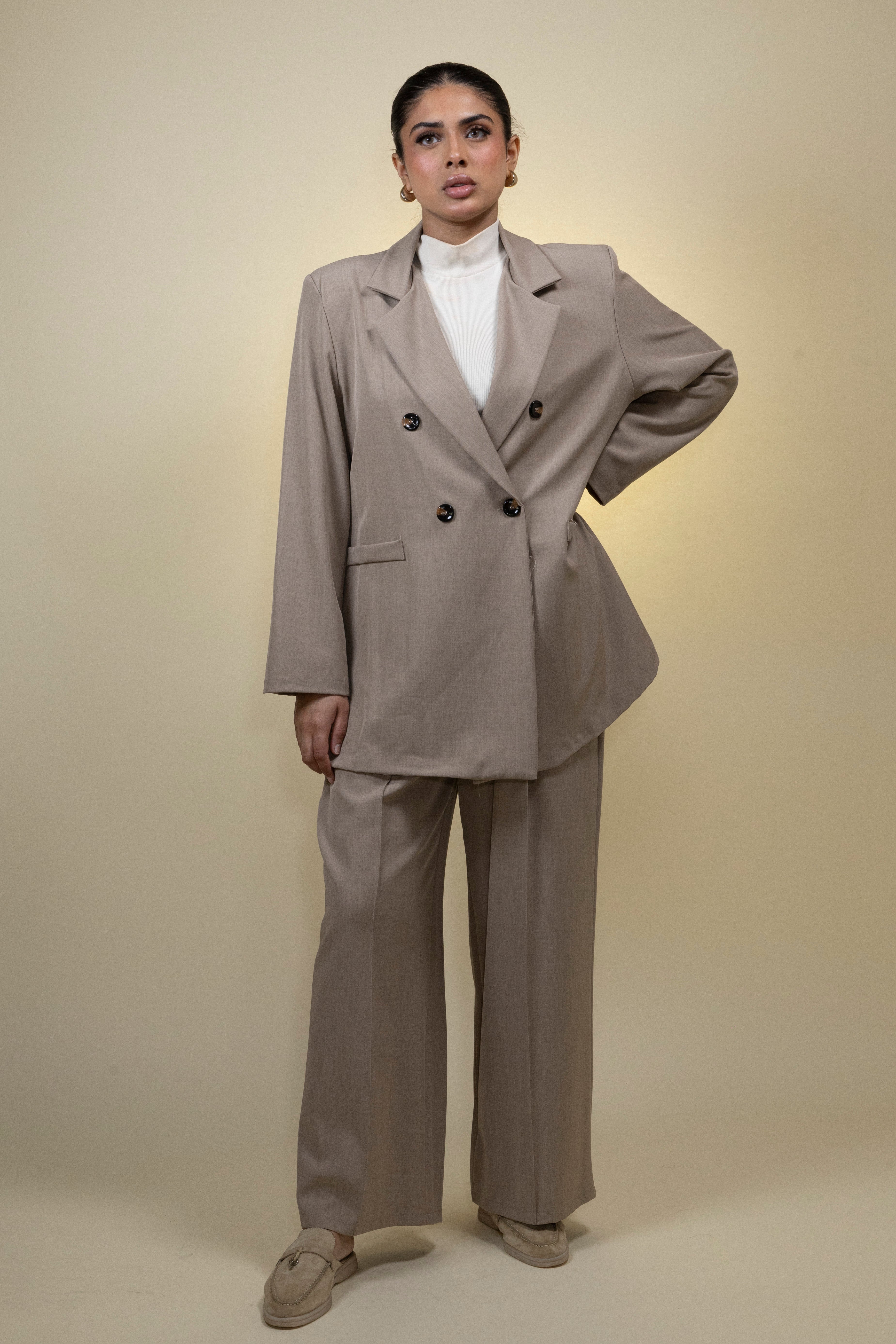 This beige co-ord set is a refined take on modern tailoring, perfect for transitional dressing and understated power dressing. Crafted in a soft, muted taupe-beige tone, the double-breasted blazer is structured yet relaxed, with wide lapels, sharp shoulders, and contrasting tortoiseshell buttons that add depth and polish. The oversized cut enhances the effortless silhouette while maintaining a timeless appeal.