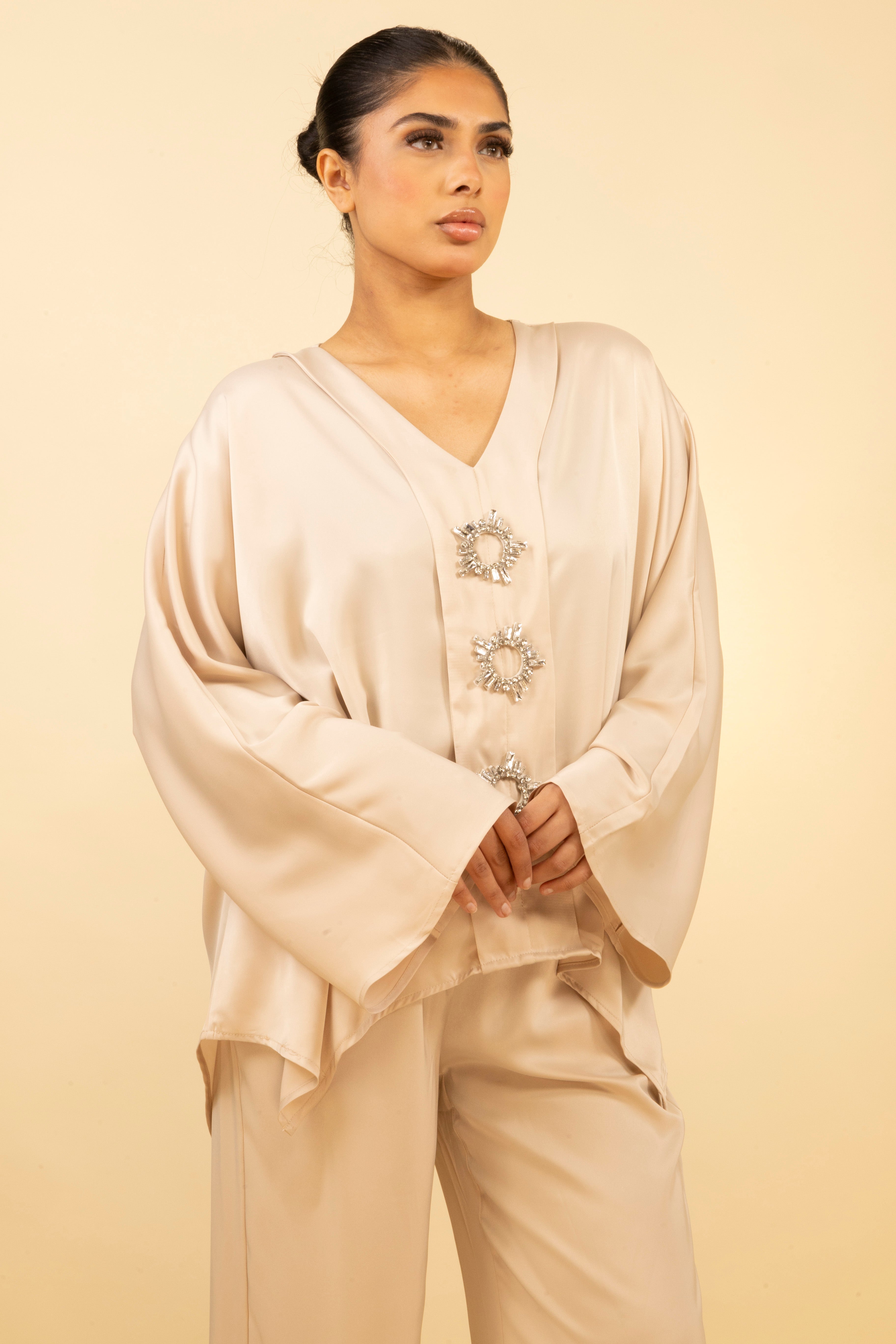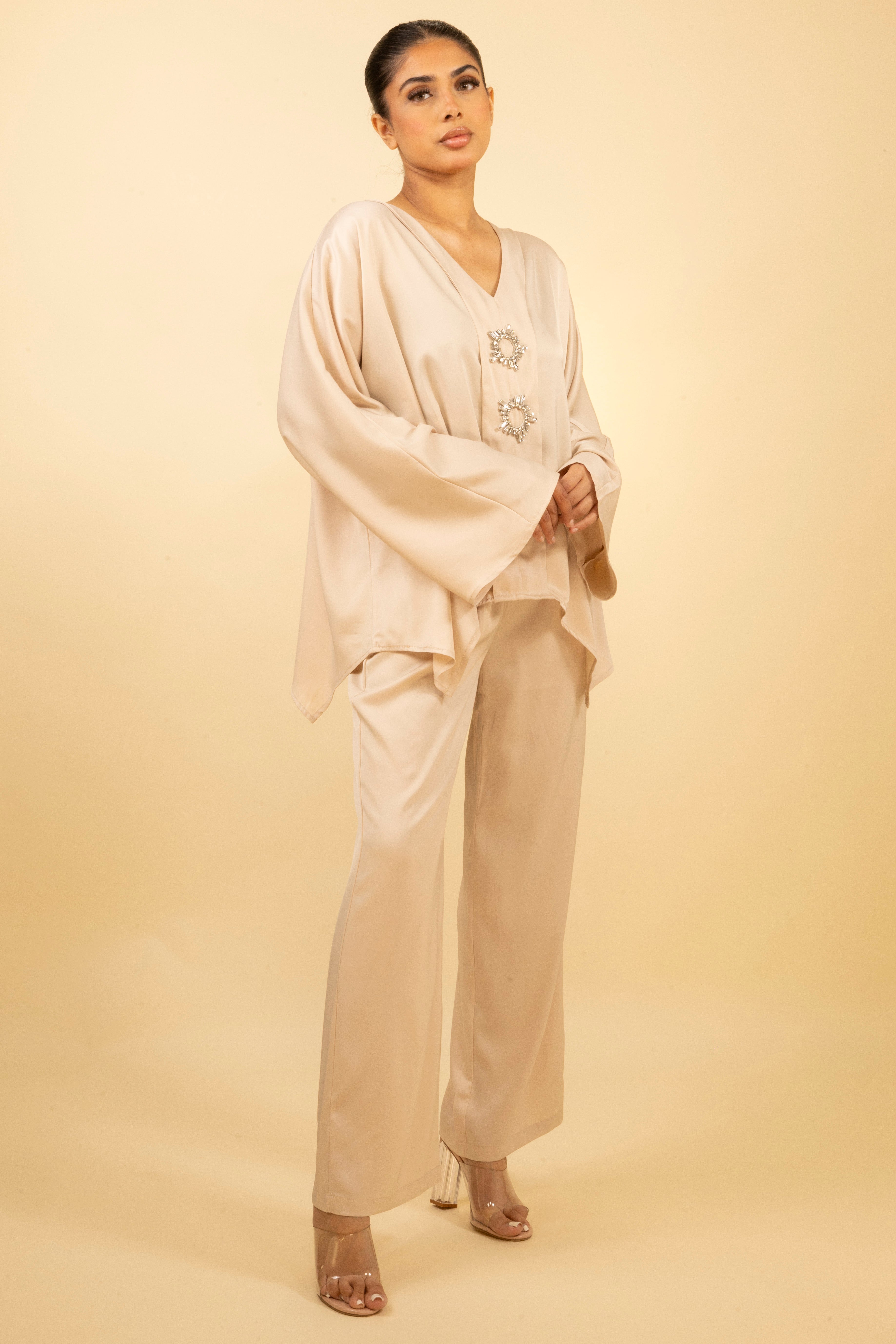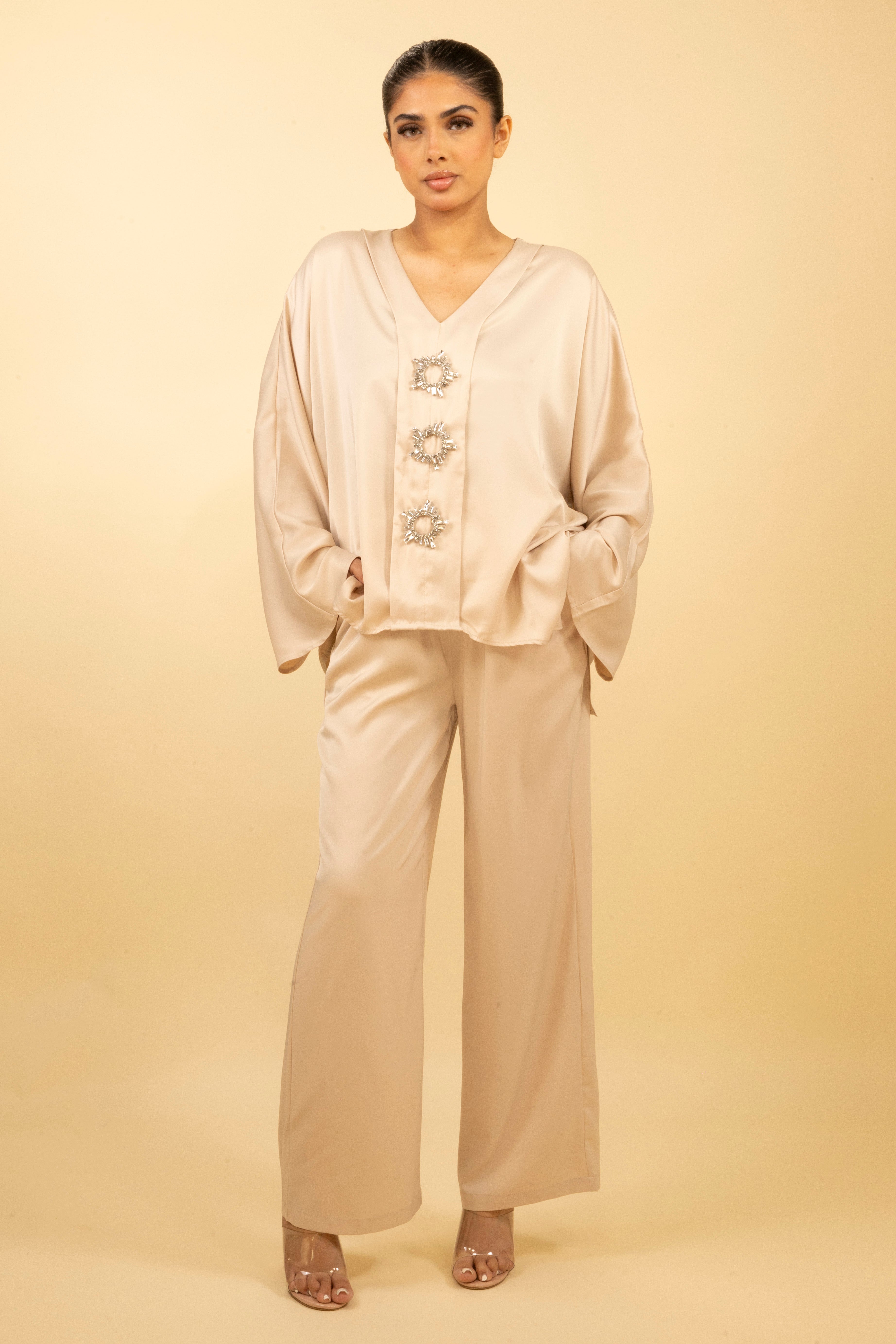 This beige satin co-ord set blends understated glamour with modern ease. The top features a soft V-neckline and a relaxed silhouette with wide sleeves, brought to life by three statement crystal starburst embellishments that add sparkle without overpowering. Its fluid drape makes it ideal for both day and evening wear.