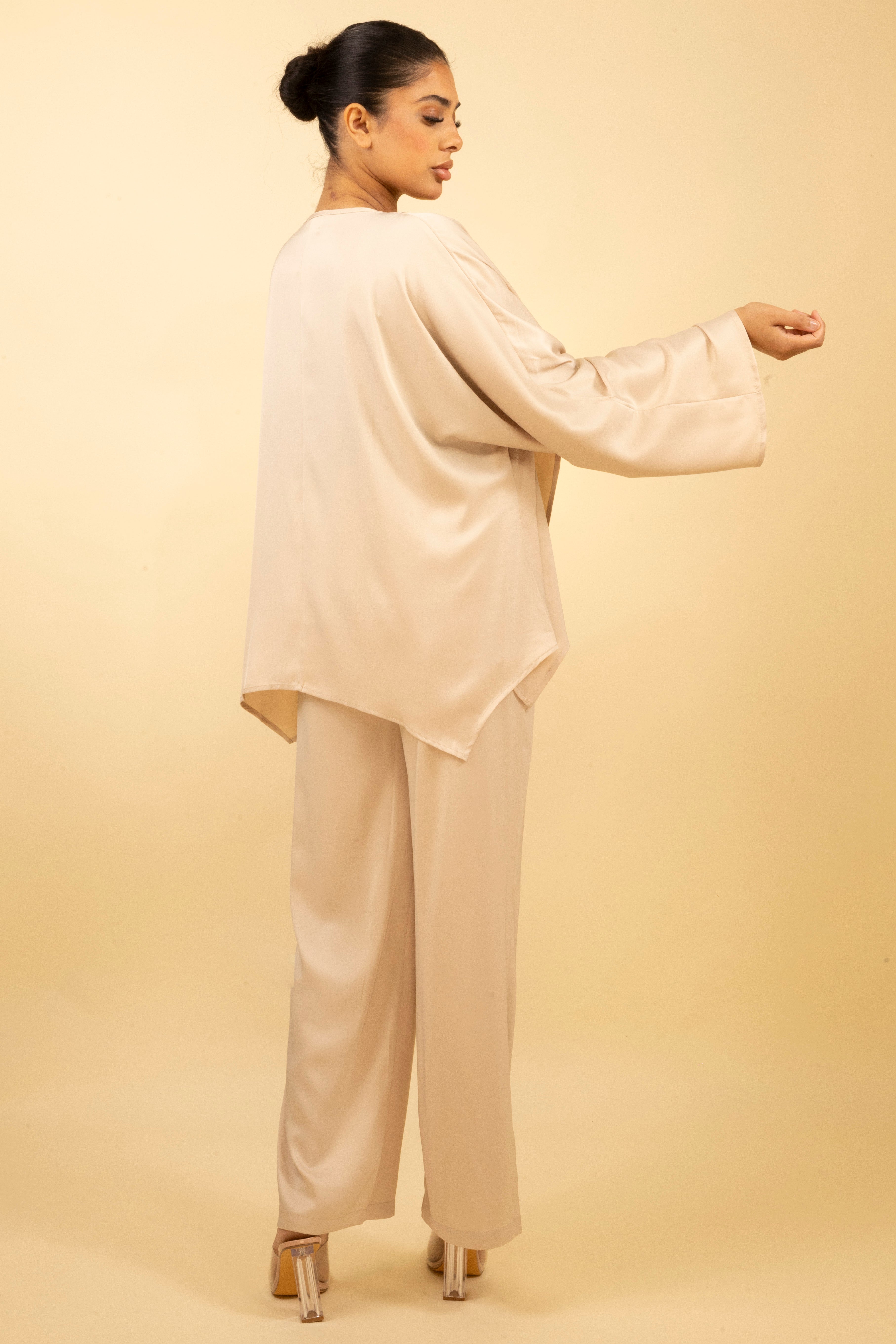 Paired with wide-leg satin trousers in a matching champagne tone, the set offers effortless polish and comfort. Dress it up with heels for a formal look, or wear it solo as a chic lounge-inspired outfit.