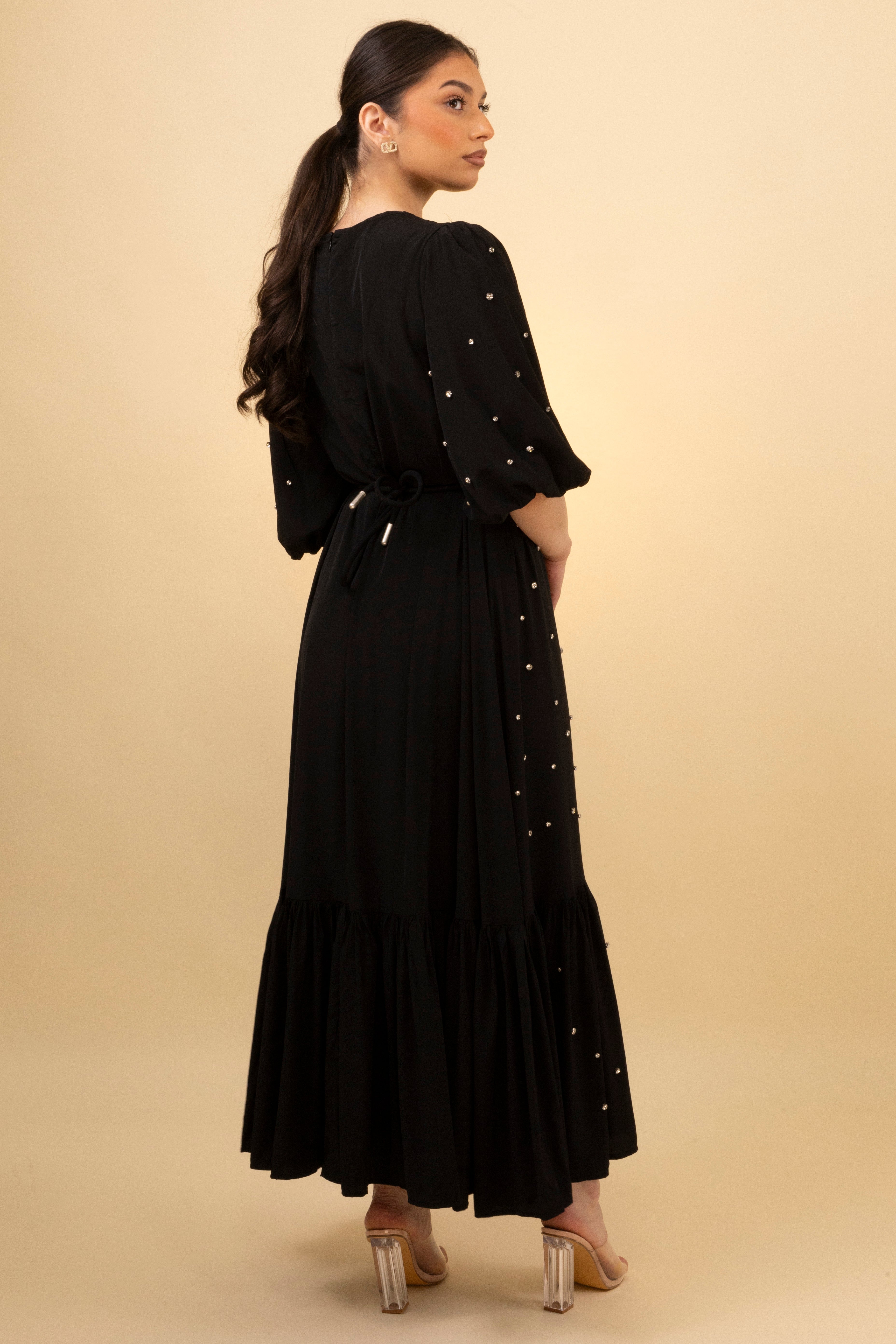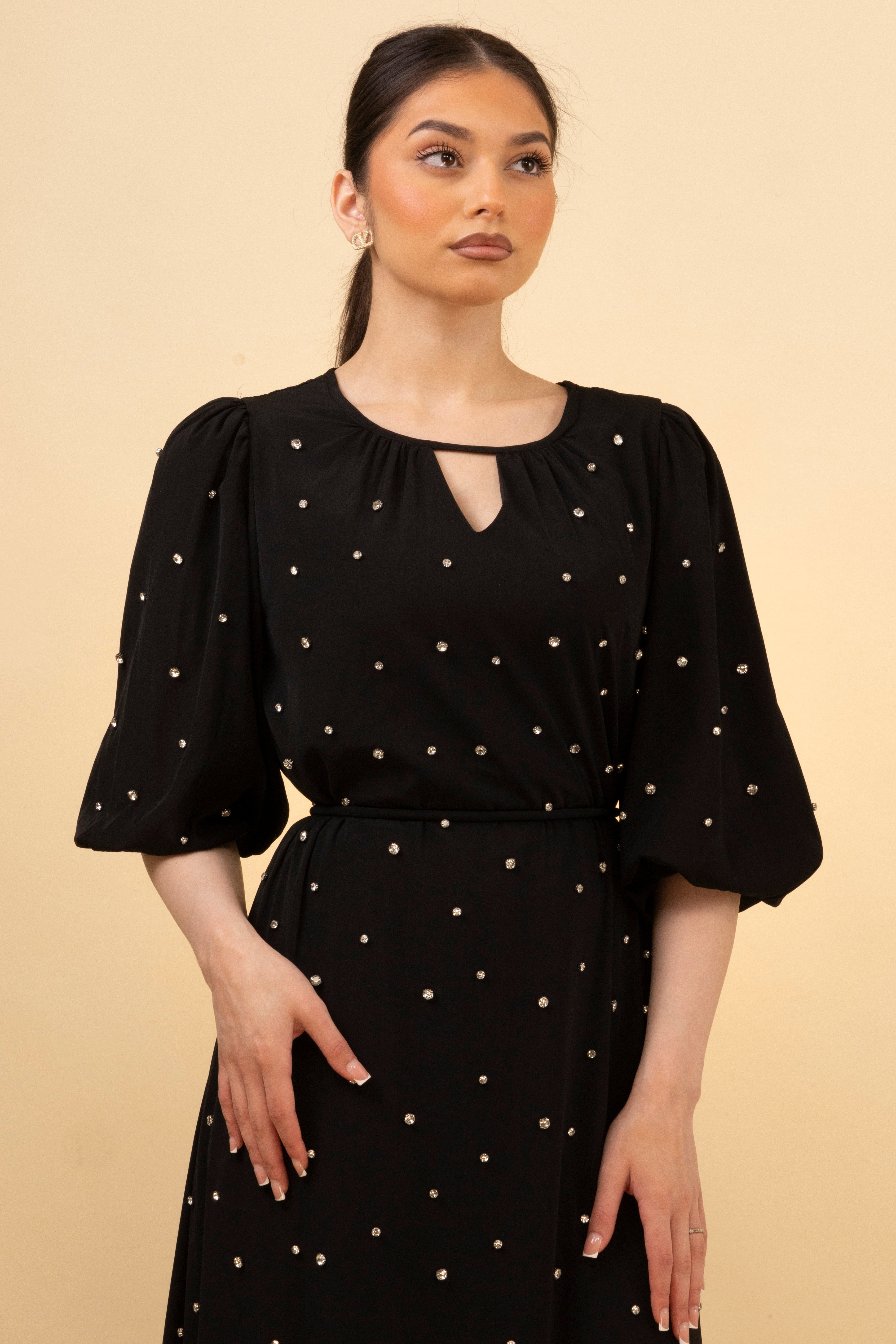This black midi dress is dotted with delicate gold embellishments for a subtle shimmer effect. Featuring a soft gathered neckline with a small keyhole cutout, the silhouette is relaxed yet flattering with gently puffed sleeves and a ruffled hem. Effortless to wear and easy to elevate—perfect for dinners, gatherings, or occasions.