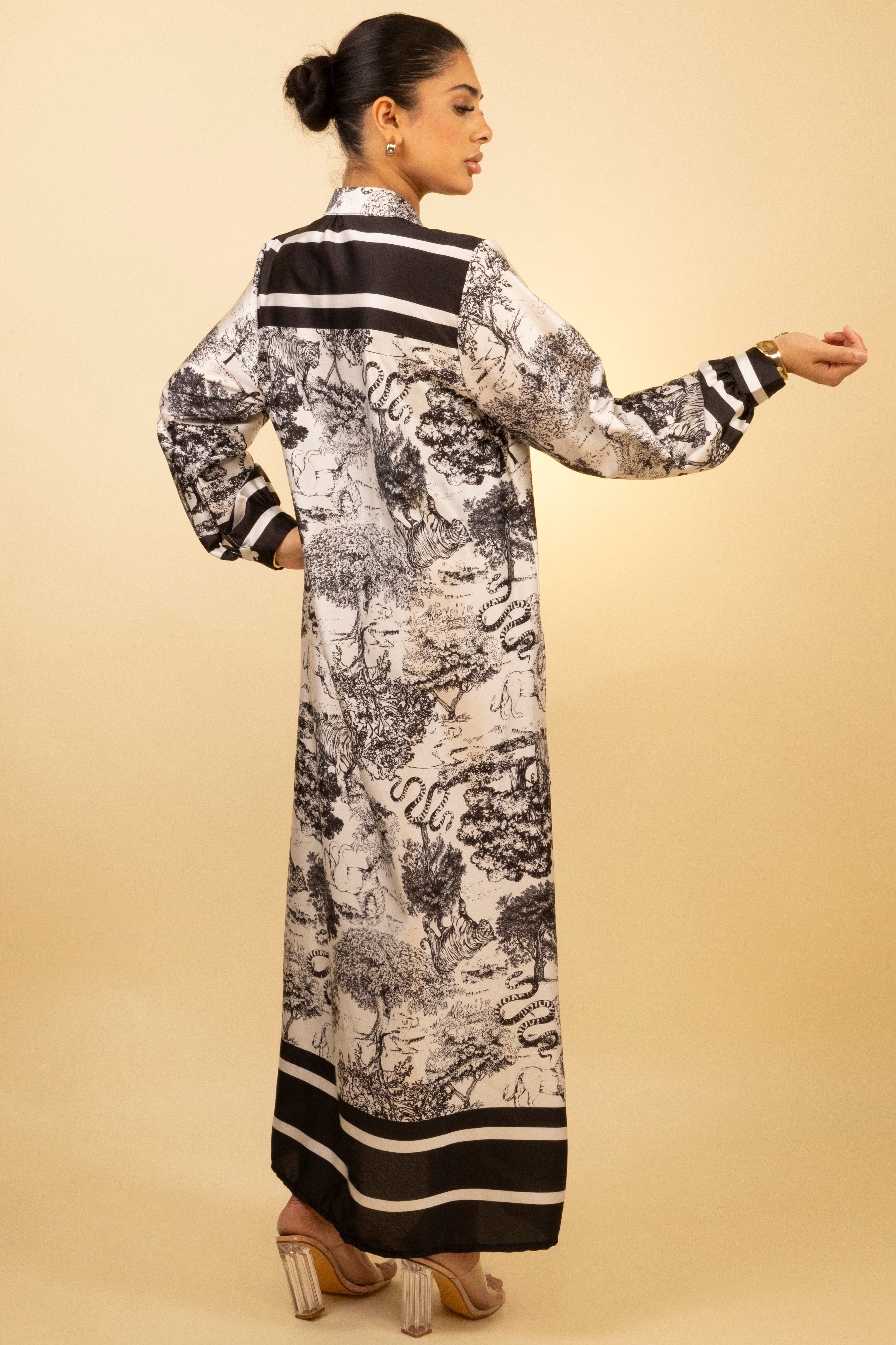 Step into timeless sophistication with this black and white satin maxi dress, featuring an intricate toile-inspired jungle print. The elegant silhouette includes a structured stand collar with a concealed button placket, offering a refined touch to the flowing shape. Bold monochrome stripe accents on the shoulders, cuffs, and hem create a striking contrast, while the full-length cut adds drama and elegance. Perfect for both daytime refinement and evening occasions, this dress brings effortless polish to your wardrobe.